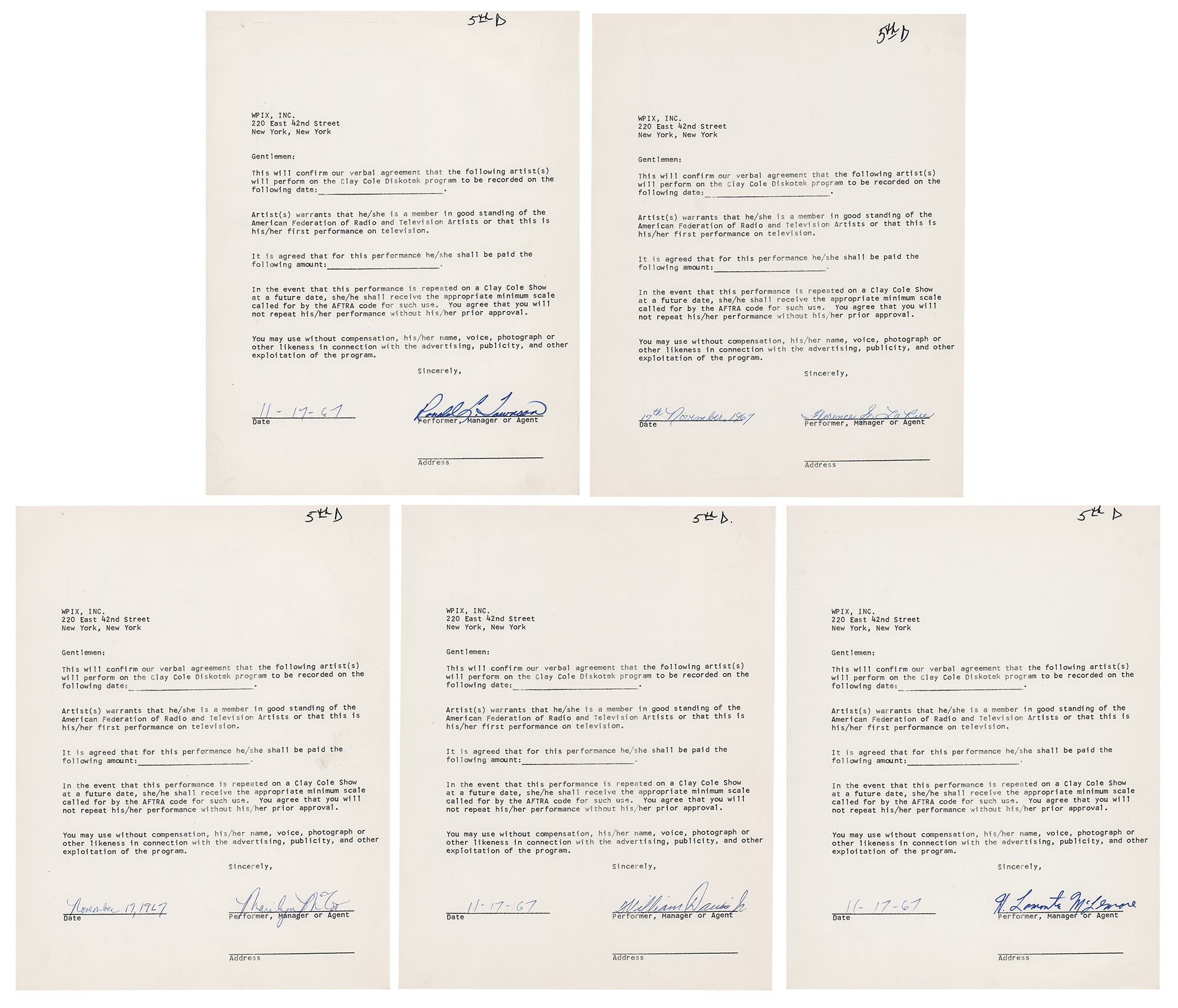 Group of five DSs individually signed by members of The 5th Dimension, each one page, 8.5 x 11, dated November 17, 1967. Each document is a contract between the band and WPIX, Inc., regarding the group’s appearance on the Clay Cole Diskotek program on an unknown date. Each page is individually signed at the conclusion in ballpoint or felt tip by all five original members: Marilyn McCoo, William Davis, Jr., Lamonte McLemore, Florence LaRue, and Ronald Townson. In overall fine condition.