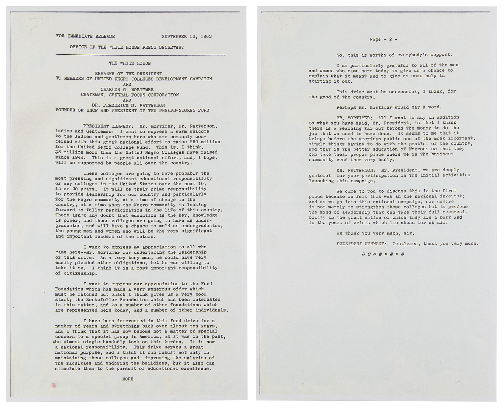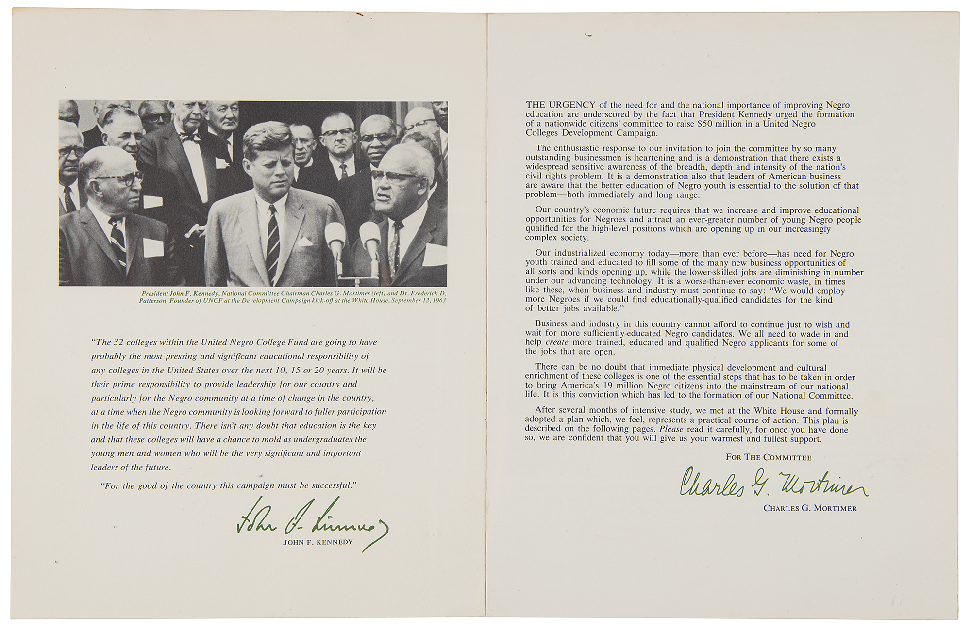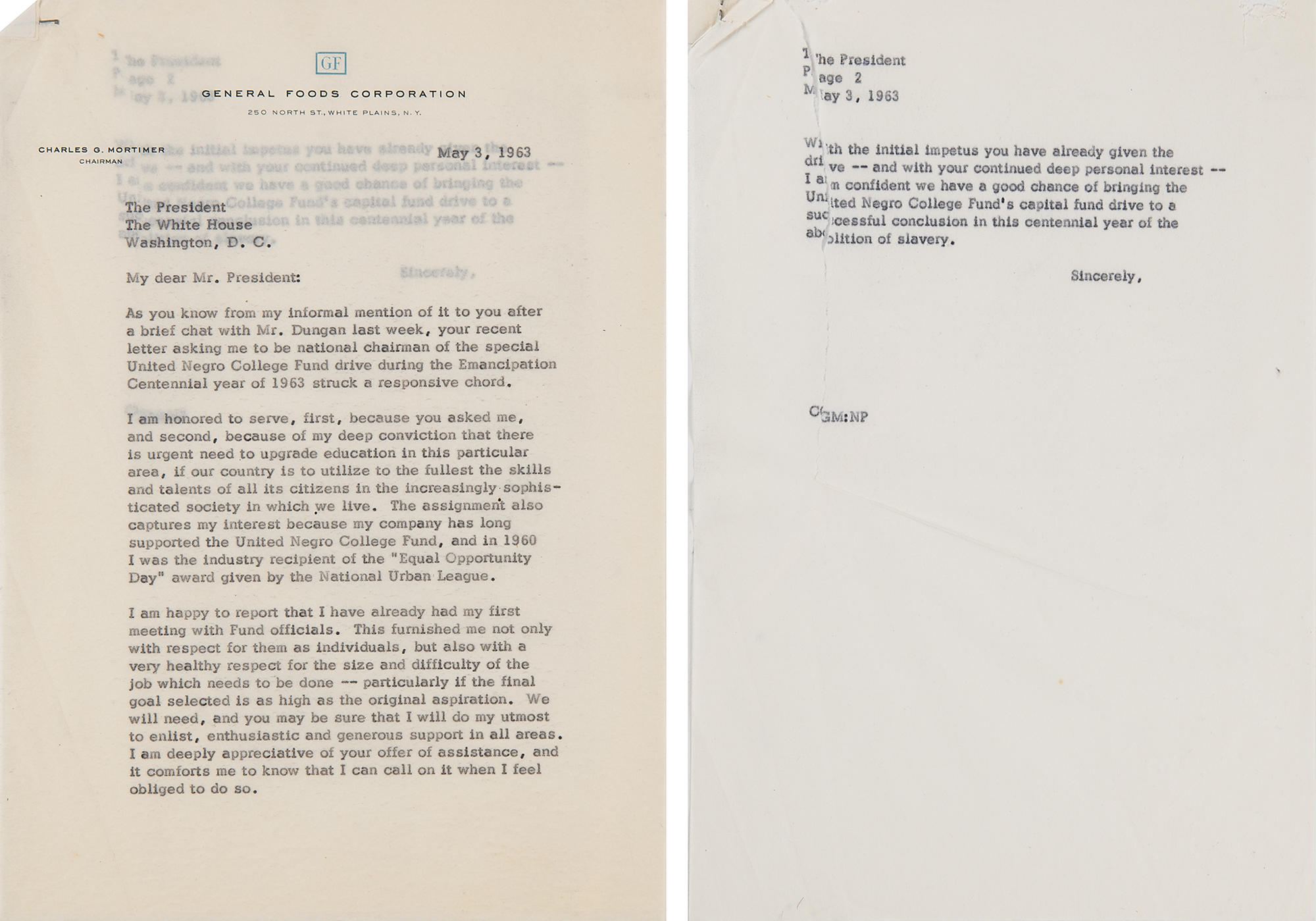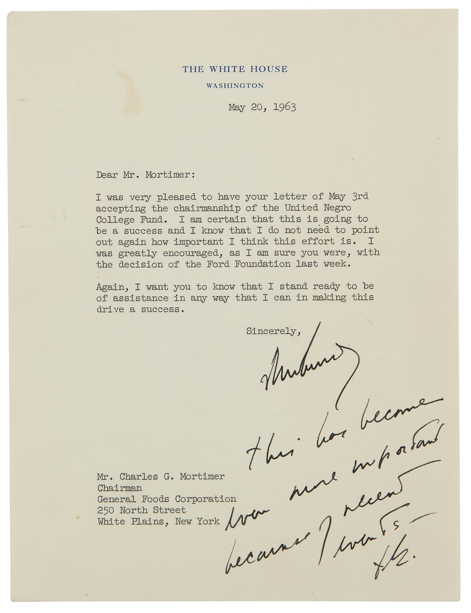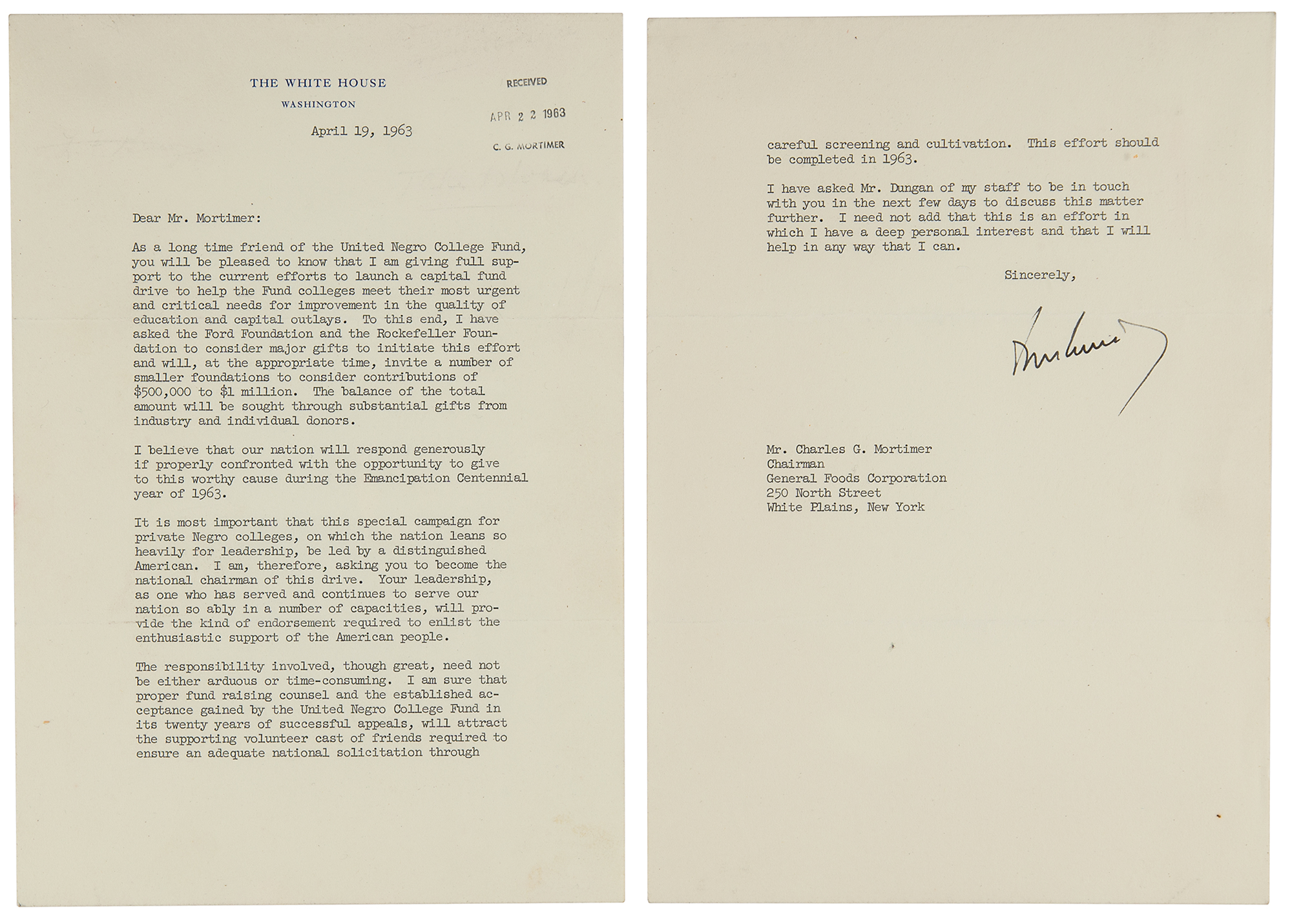 Two TLSs as president signed “John Kennedy,” both sent to Charles G. Mortimer, the chairman and CEO of the General Foods Corporation, who acquiesced to the president’s request that he become the chairman of the United Negro College Fund (UNCF), the nation's largest and most effective minority education organization, which provides scholarships for Black students and general scholarship funds for 37 private historically Black colleges and universities. The letters, three total pages, 7 x 10.25 and 6.75 x 8.75, typed on White House letterhead, read: