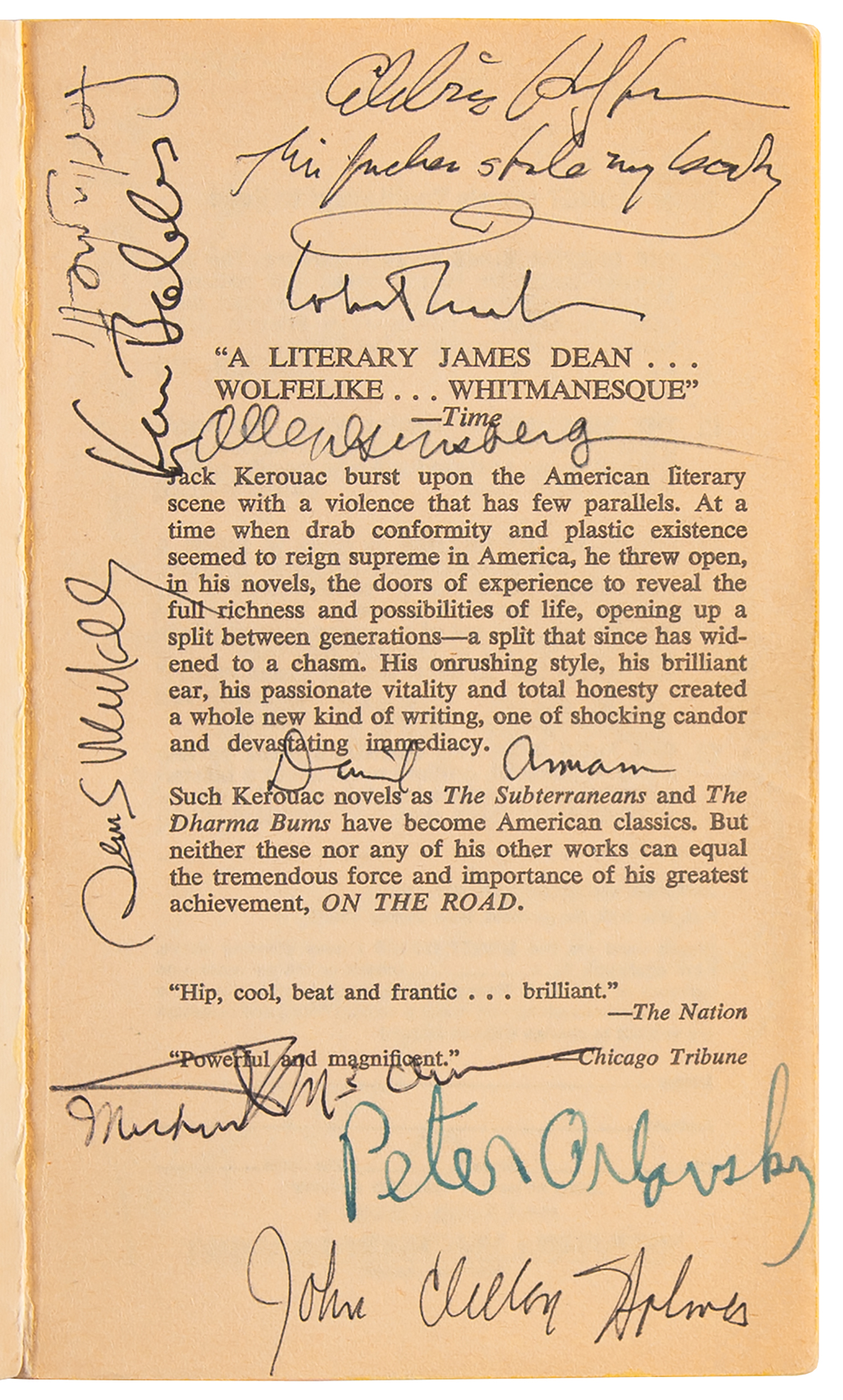 Signed book: On the Road by Jack Kerouac. Later printing. NY: Signet Book, 1957. Paperback, 4.25 x 7, 254 pages. Signed on the front cover and opening pages in ink and felt tip by over 20 acclaimed poets and writers from the Beat Generation, including Ken Kesey, Allen Ginsberg, William S. Burroughs, Gregory Corso, Ted Berrigan, Peter Orlovsky, Edie Kerouac-Parker, and others. In very good to fine condition, with creasing to the covers, and general expected reading wear.