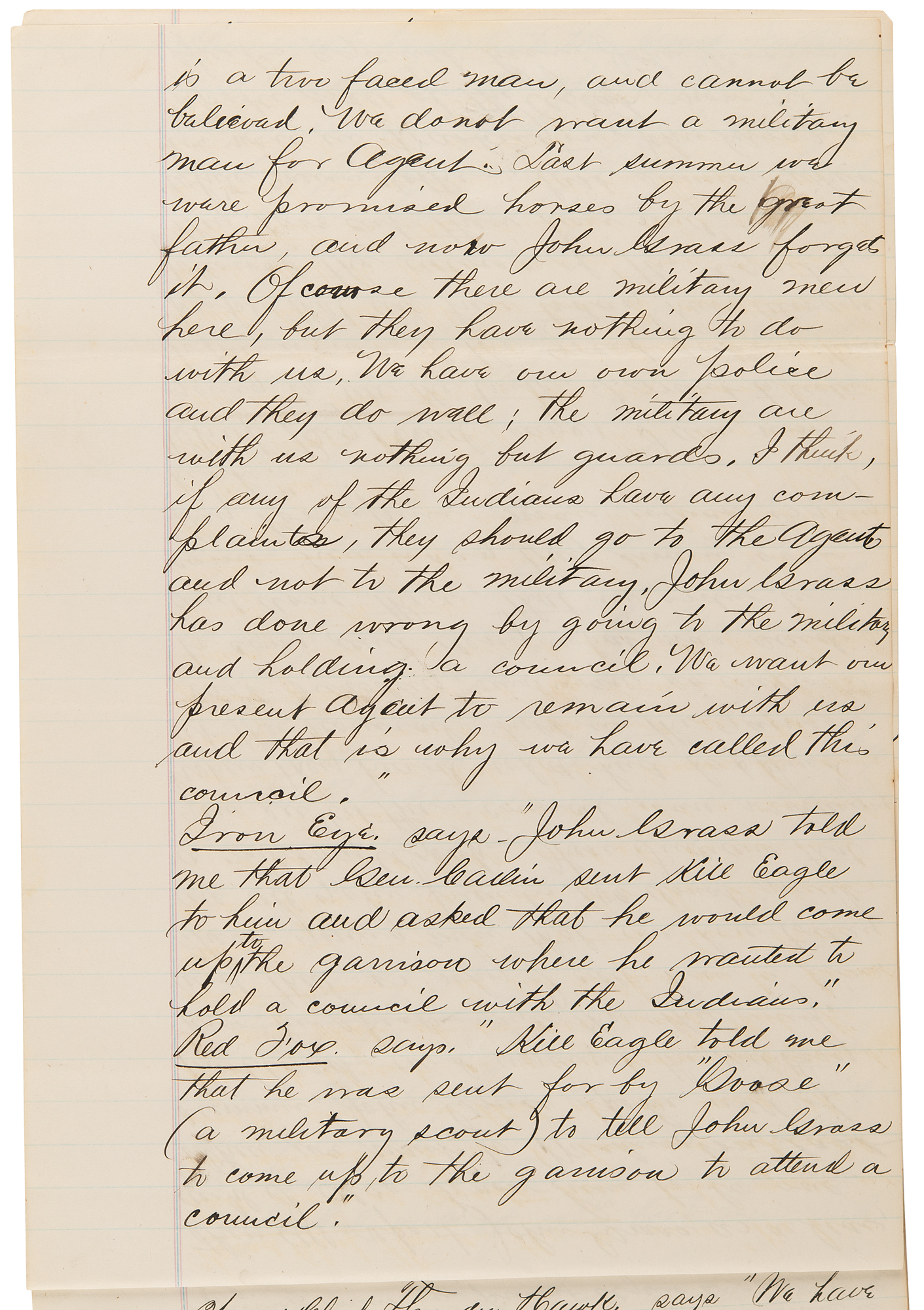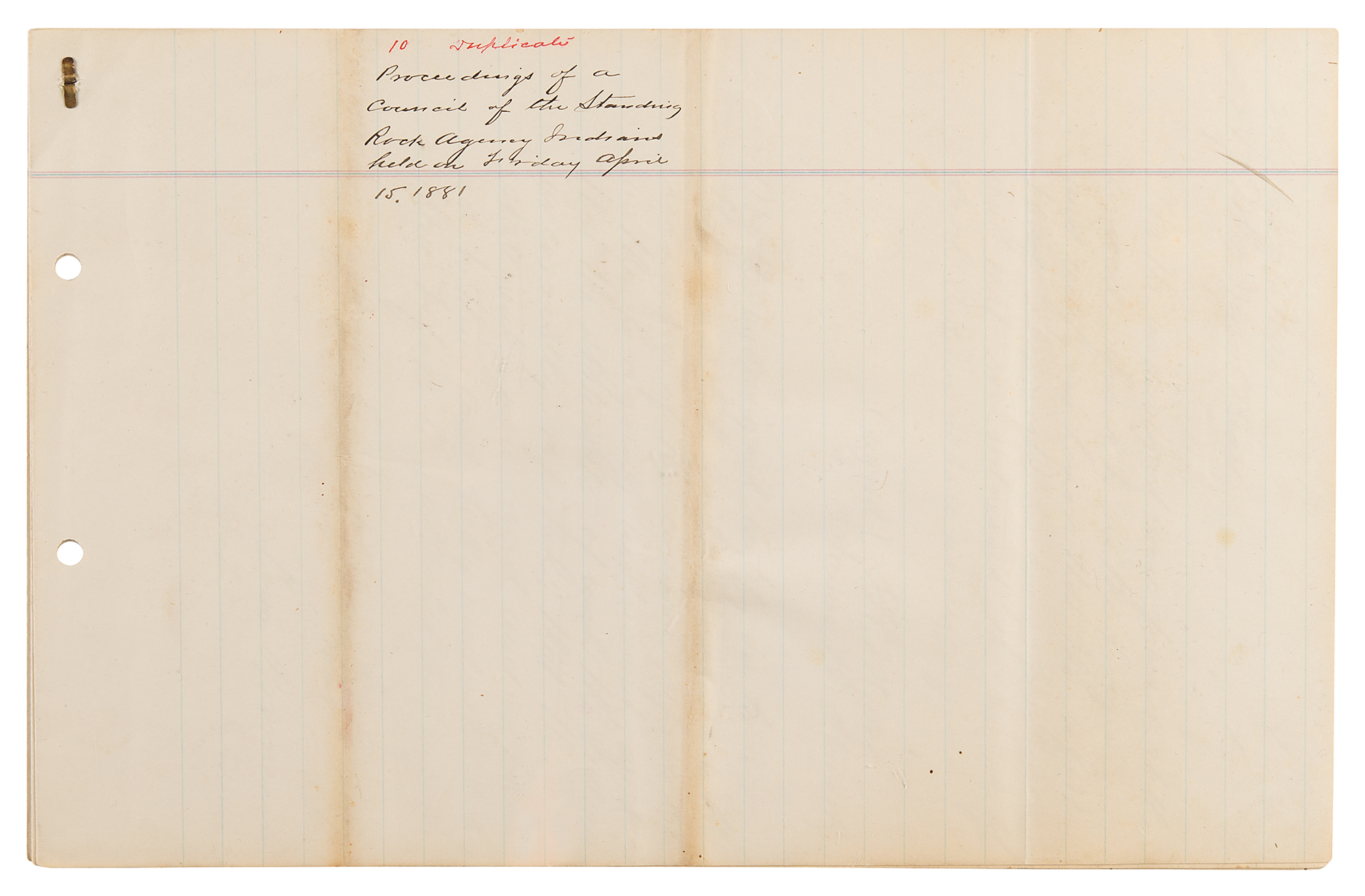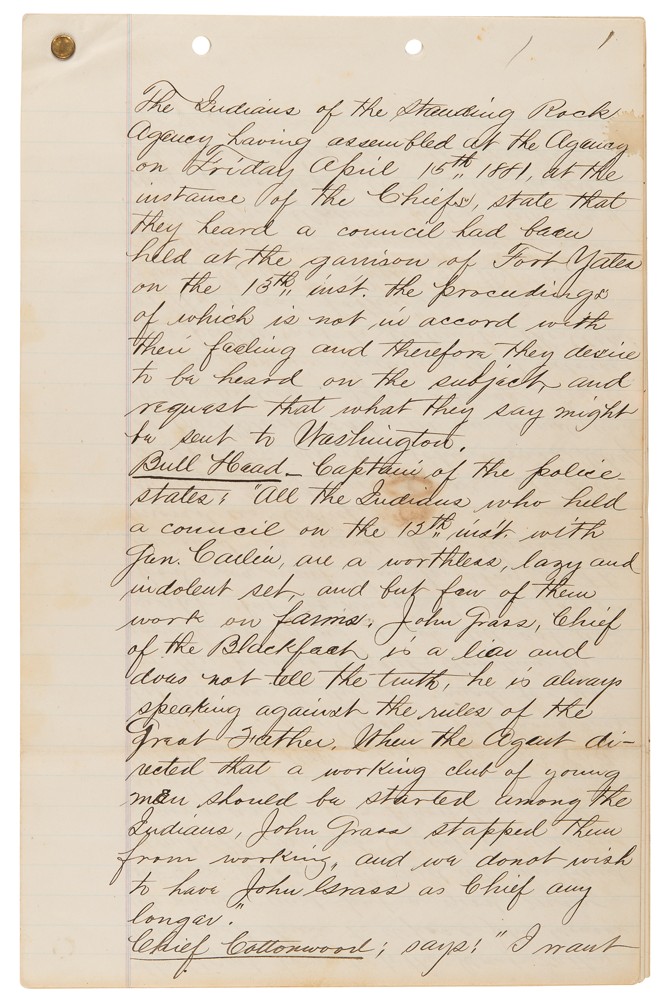2. Manuscript copy of the proceedings of a council of the Standing Rock Sioux, nine pages both sides, 8 x 12.5, April 15, 1881. True manuscript copy of testimony against Chief John Grass, related to an alleged conspiracy with General W. P. Carlin to undermine the authority of the Indian agent, Father Joseph A. Stephan—known as the 'fighting priest'—at Standing Rock. In part: "Bull Head, Captain of the Policemen, states: 'All the Indians who held a council on the 12th inst. with Gen. Carlin are a worthless, lazy and indolent set, and but few of them work on farms. John Grass, Chief of the Blackfoot, is a liar and does not tell the truth. He is always speaking against the rules of the Great Father. When the Agent directed that a working club of young men should be started among the Indians, John Grass stopped them from working, and we do not want John Grass to be Head Chief any longer'…Chief Fire Heart, says: 'We have constantly reported John Grass, Chief of the Blackfoot, as an unruly and bad Indian. John Grass wishes us to remain Indians, and advises the people not to listen to the Agent or the great father…Head Chief Two Bears, of the Lower Yancktonnais, says…'The Indians that you see at this council were very angry when they heard what had happened at the council held in the garrison last Tuesday, and were so anxious to come and deny what was said and done there that in order to come here today they swam over the Porcupine River which is very high'…