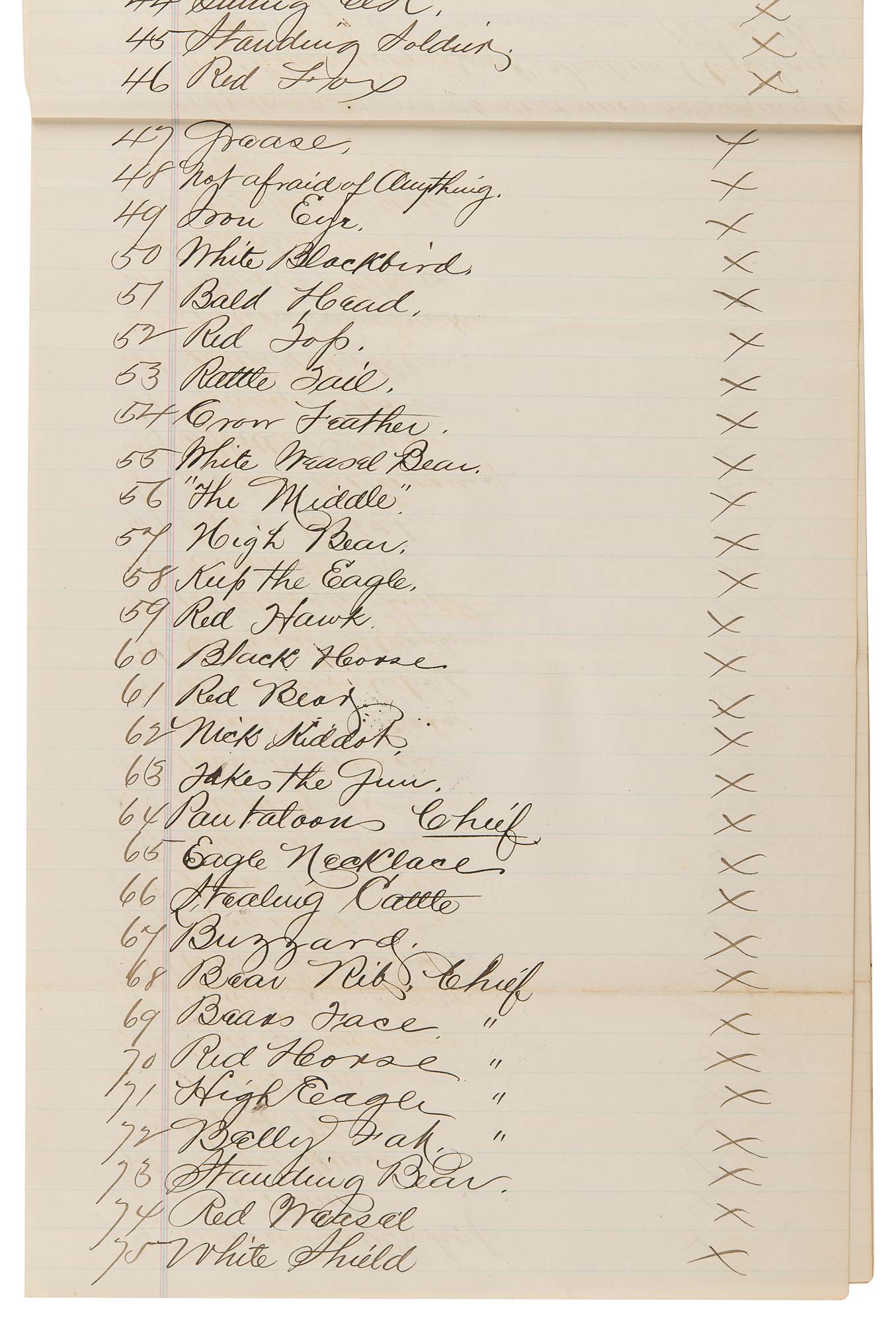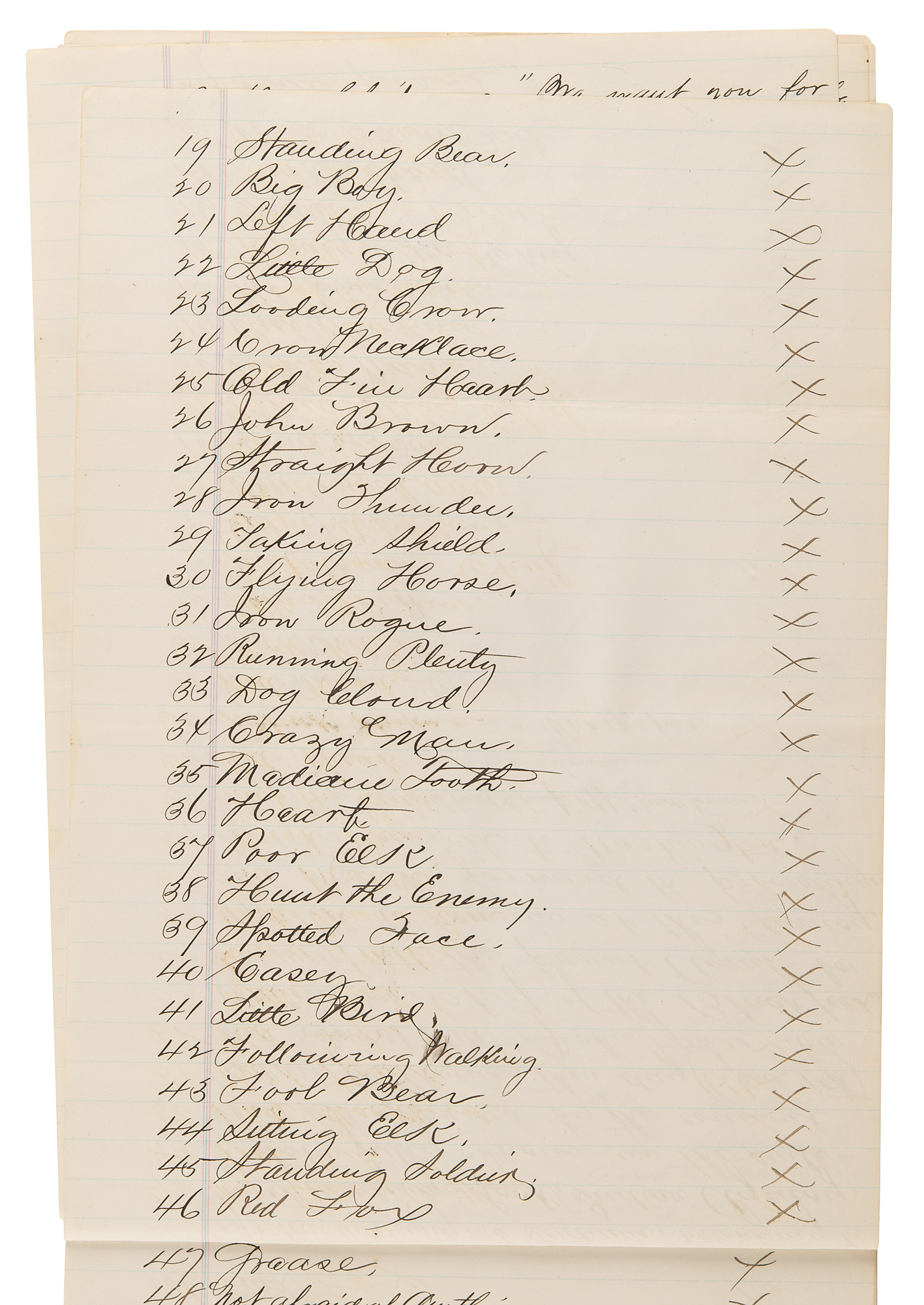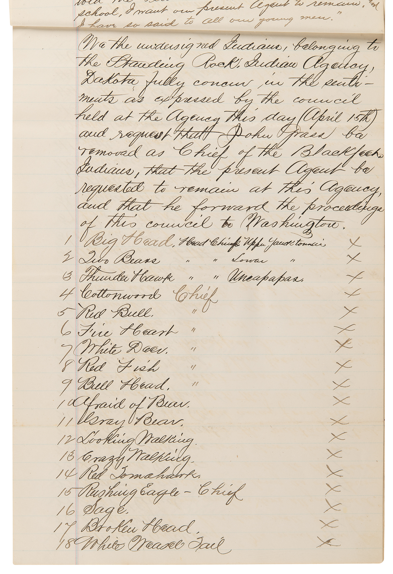 2. Manuscript copy of the proceedings of a council of the Standing Rock Sioux, nine pages both sides, 8 x 12.5, April 15, 1881. True manuscript copy of testimony against Chief John Grass, related to an alleged conspiracy with General W. P. Carlin to undermine the authority of the Indian agent, Father Joseph A. Stephan—known as the 'fighting priest'—at Standing Rock. In part: "Bull Head, Captain of the Policemen, states: 'All the Indians who held a council on the 12th inst. with Gen. Carlin are a worthless, lazy and indolent set, and but few of them work on farms. John Grass, Chief of the Blackfoot, is a liar and does not tell the truth. He is always speaking against the rules of the Great Father. When the Agent directed that a working club of young men should be started among the Indians, John Grass stopped them from working, and we do not want John Grass to be Head Chief any longer'…Chief Fire Heart, says: 'We have constantly reported John Grass, Chief of the Blackfoot, as an unruly and bad Indian. John Grass wishes us to remain Indians, and advises the people not to listen to the Agent or the great father…Head Chief Two Bears, of the Lower Yancktonnais, says…'The Indians that you see at this council were very angry when they heard what had happened at the council held in the garrison last Tuesday, and were so anxious to come and deny what was said and done there that in order to come here today they swam over the Porcupine River which is very high'…