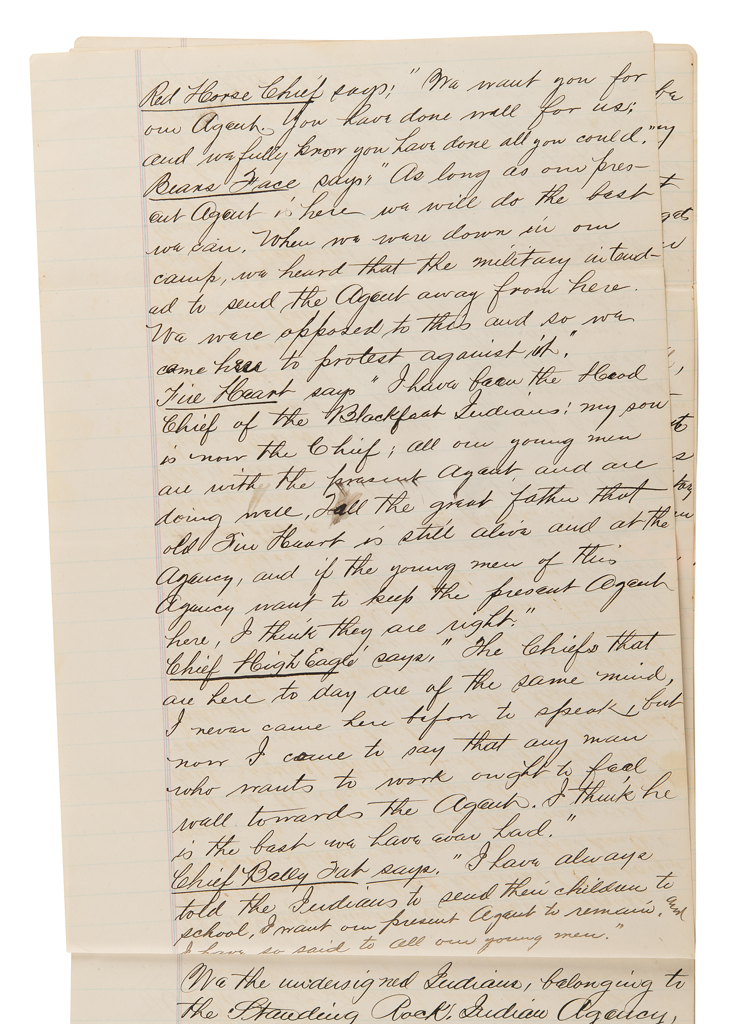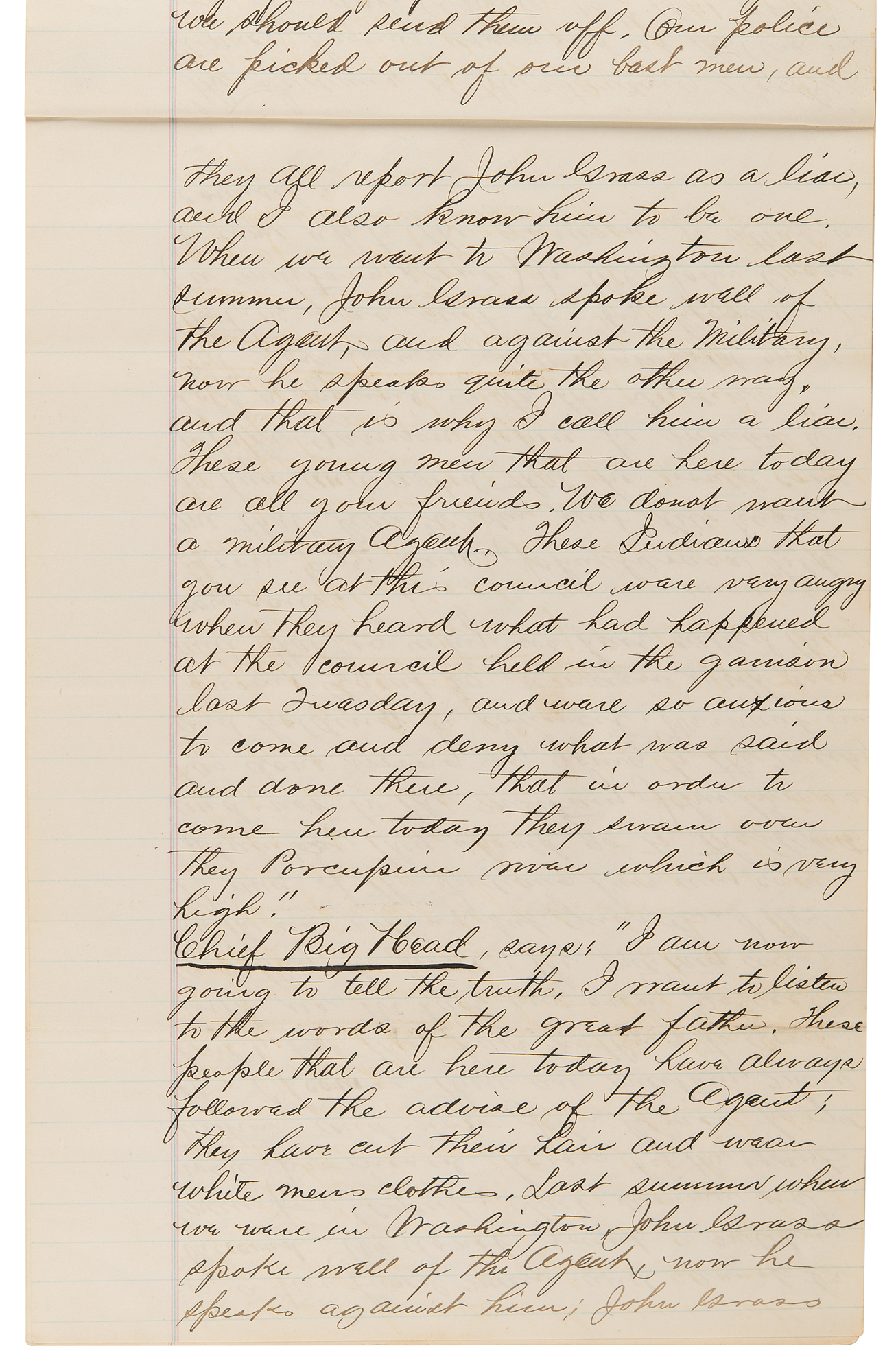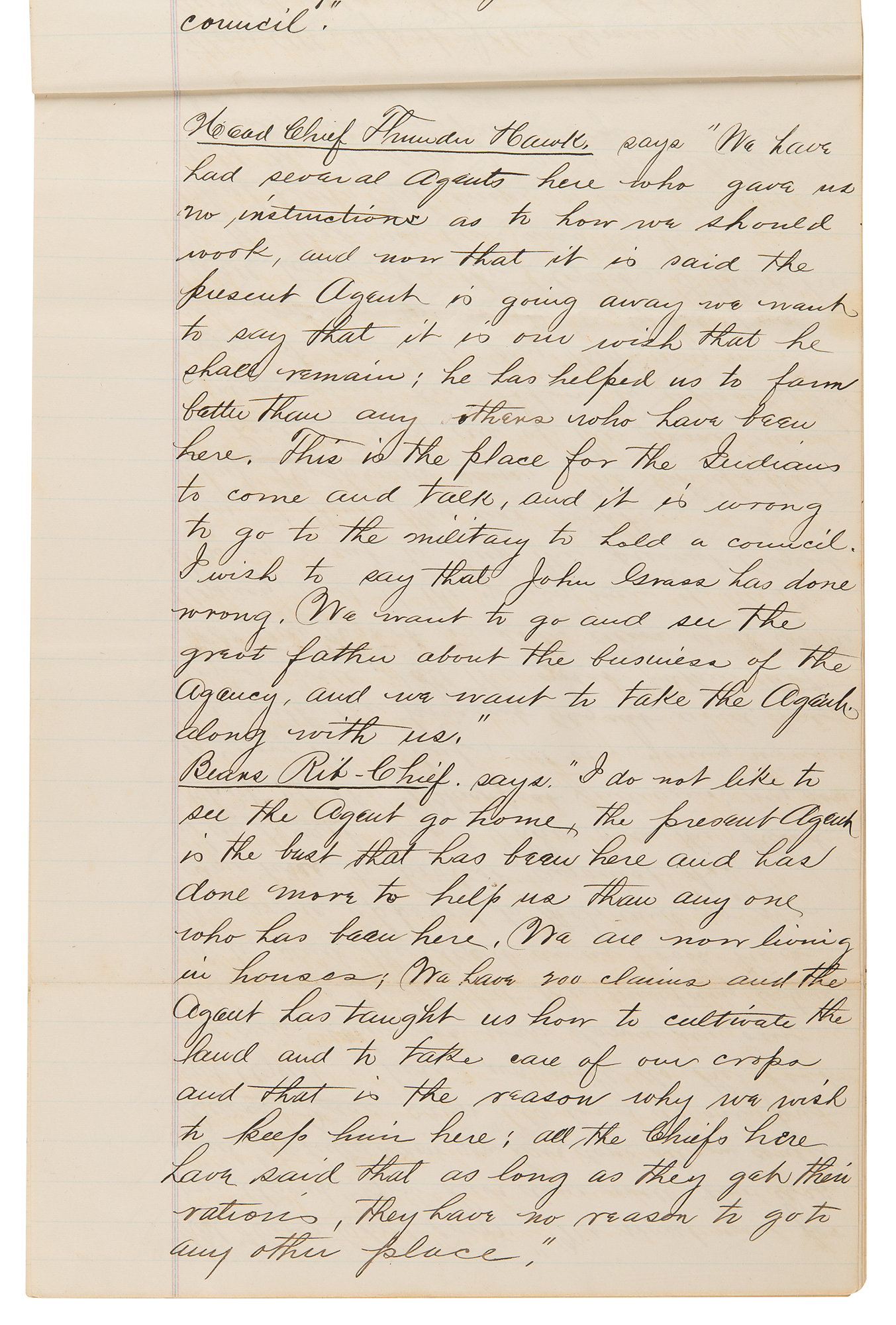 Chief Big Head says: 'I am now going to tell the truth. I want to listen to the words of the great father. These people here today have always followed the advice of the Agent: they have cut their hair and worn white men's clothes. Last summer when we were in Washington John Grass spoke well of the agent. Now he speaks against him. John Grass is a two faced man and cannot be believed. We do not want a military man for agent. Last summer we were promised horses by the Great Father, and now John Grass forgets it'…Head Chief Thunder Hawk says: 'We have had several agents here who gave us no instructions as to how we should work and now that it is said the present agent is going away…it is our wish that he shall remain. He has helped us to farm better than any…We want to go and see the great father about the business of the agency and we want to take the agent with us."