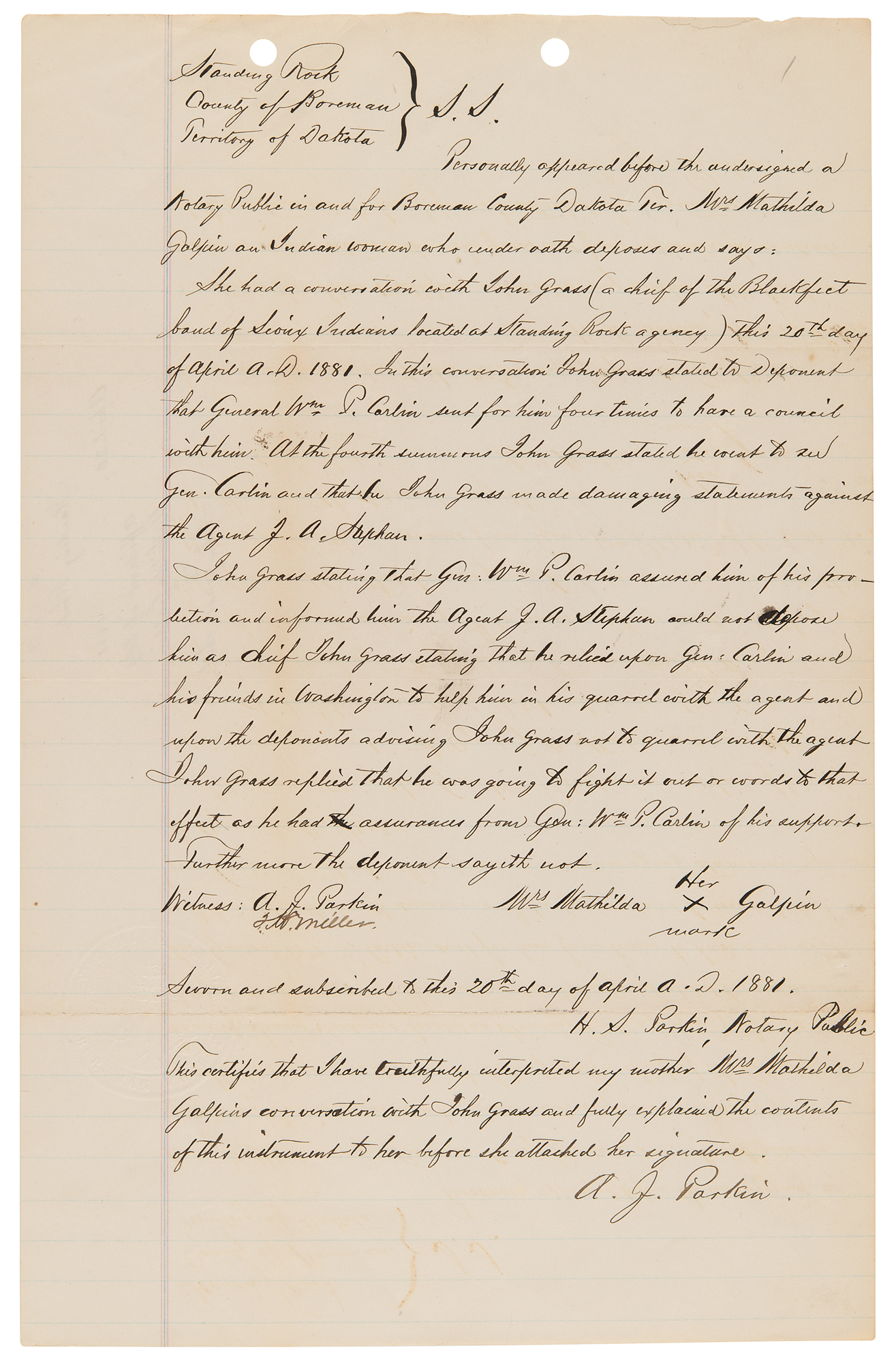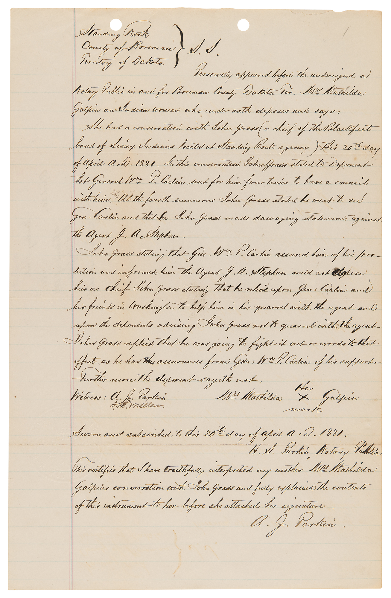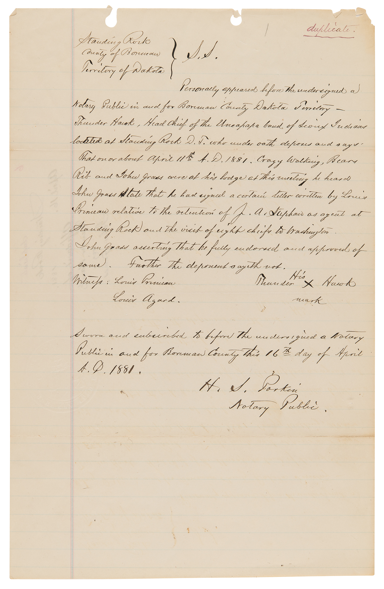 4. Manuscript copy of a deposition taken against Chief John Grass, one page, 8 x 12.5, April 16, 1881. Notarized manuscript copy of a deposition regarding the Sioux chief, marked "duplicate," in relation to potential efforts to undermine the authority of the Indian agent, Father Joseph A. Stephan—known as the 'fighting priest'—at Standing Rock. In part: "'Crazy Walking,' Lieut. of Indian Police who being duly sworn according to law doth depose and say: That on or about 11th day of April 1881 he was at the Lodge of Thunder Hawk Head Chief of the Uncapapa band of Sioux Indians located at Standing Rock agency and there met John Grass Head Chief of the Blackfeet band. The said John Grass then and there told the Deponent that he had signed a letter written by Louis Primeau on or about the 9th day of April to the Hon: Com. of Indian affixed relative to the retention of J. A. Stephan as agent at Standing Rock agency and fully endorsed and approved of same. The deponent further states that Chiefs Thunder Hawk and Bear's Rib were present when John Grass made the above mentioned statement."