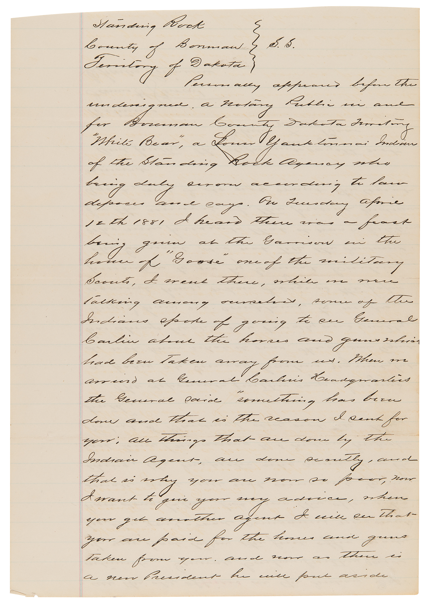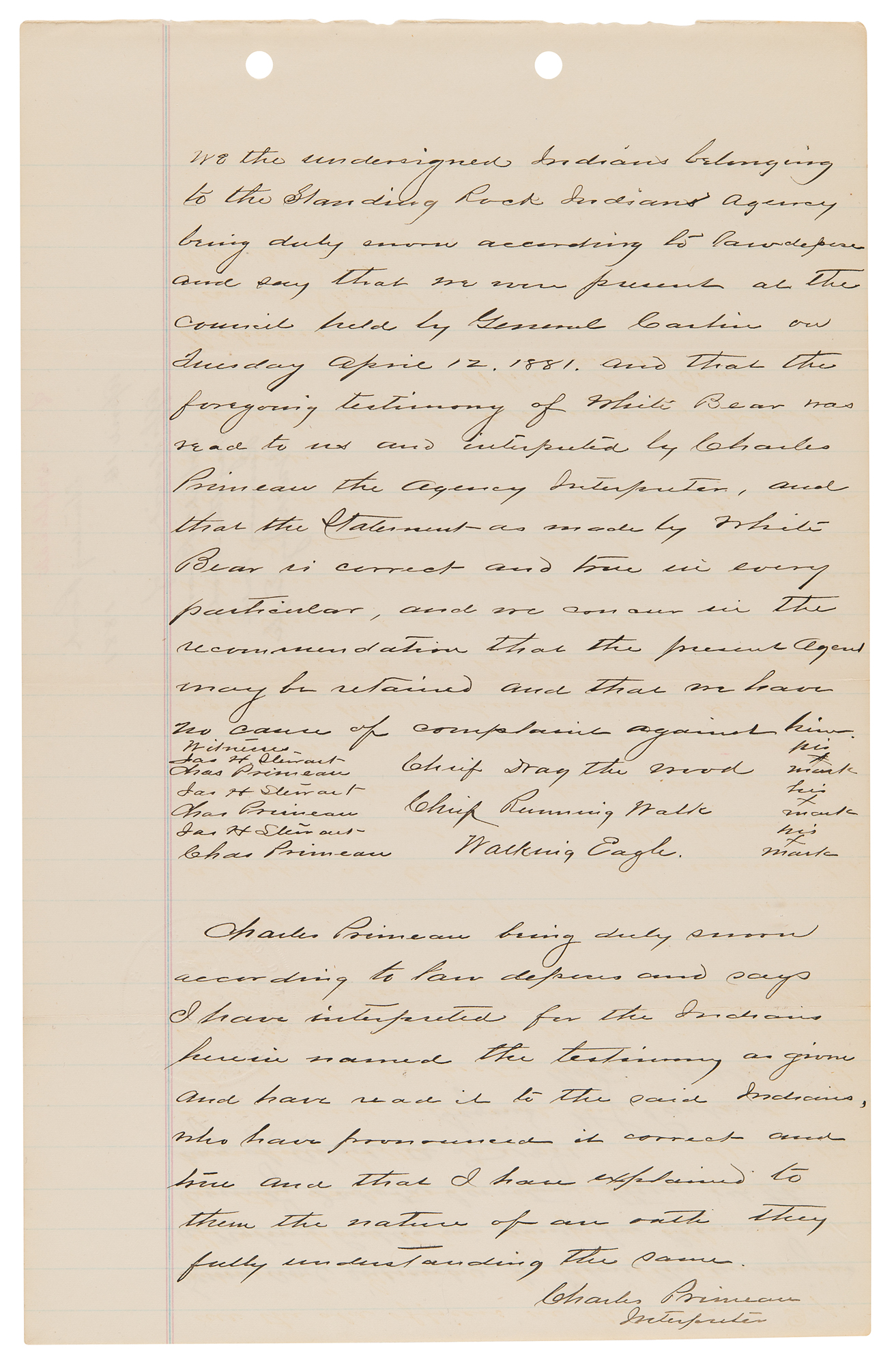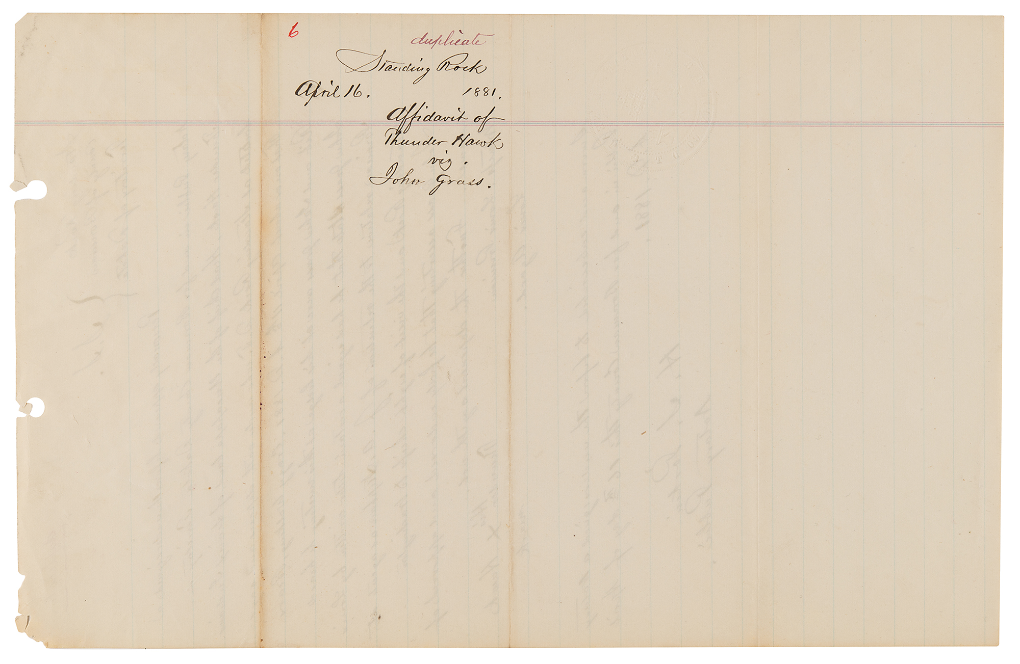 4. Manuscript copy of a deposition taken against Chief John Grass, one page, 8 x 12.5, April 16, 1881. Notarized manuscript copy of a deposition regarding the Sioux chief, marked "duplicate," in relation to potential efforts to undermine the authority of the Indian agent, Father Joseph A. Stephan—known as the 'fighting priest'—at Standing Rock. In part: "'Crazy Walking,' Lieut. of Indian Police who being duly sworn according to law doth depose and say: That on or about 11th day of April 1881 he was at the Lodge of Thunder Hawk Head Chief of the Uncapapa band of Sioux Indians located at Standing Rock agency and there met John Grass Head Chief of the Blackfeet band. The said John Grass then and there told the Deponent that he had signed a letter written by Louis Primeau on or about the 9th day of April to the Hon: Com. of Indian affixed relative to the retention of J. A. Stephan as agent at Standing Rock agency and fully endorsed and approved of same. The deponent further states that Chiefs Thunder Hawk and Bear's Rib were present when John Grass made the above mentioned statement."