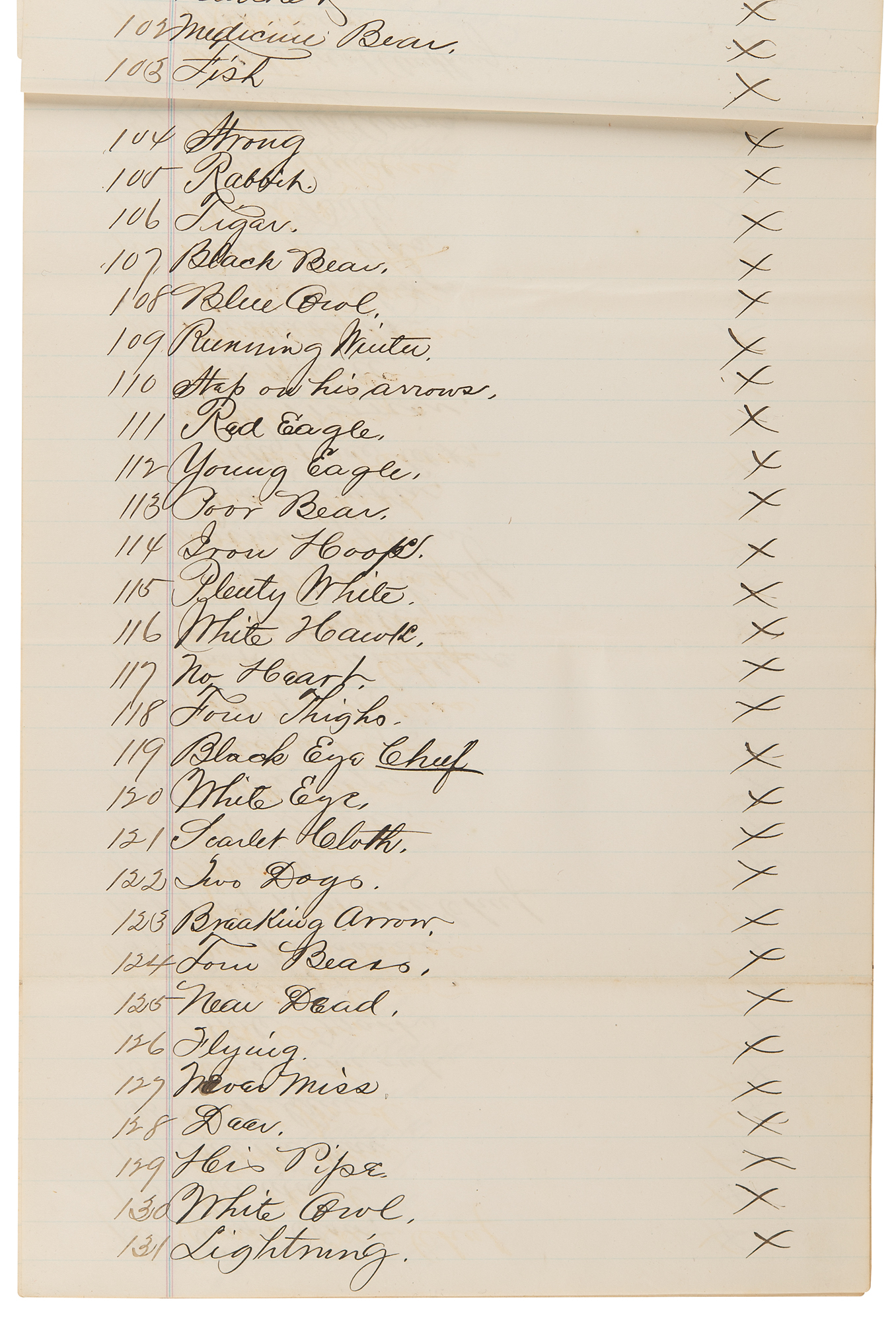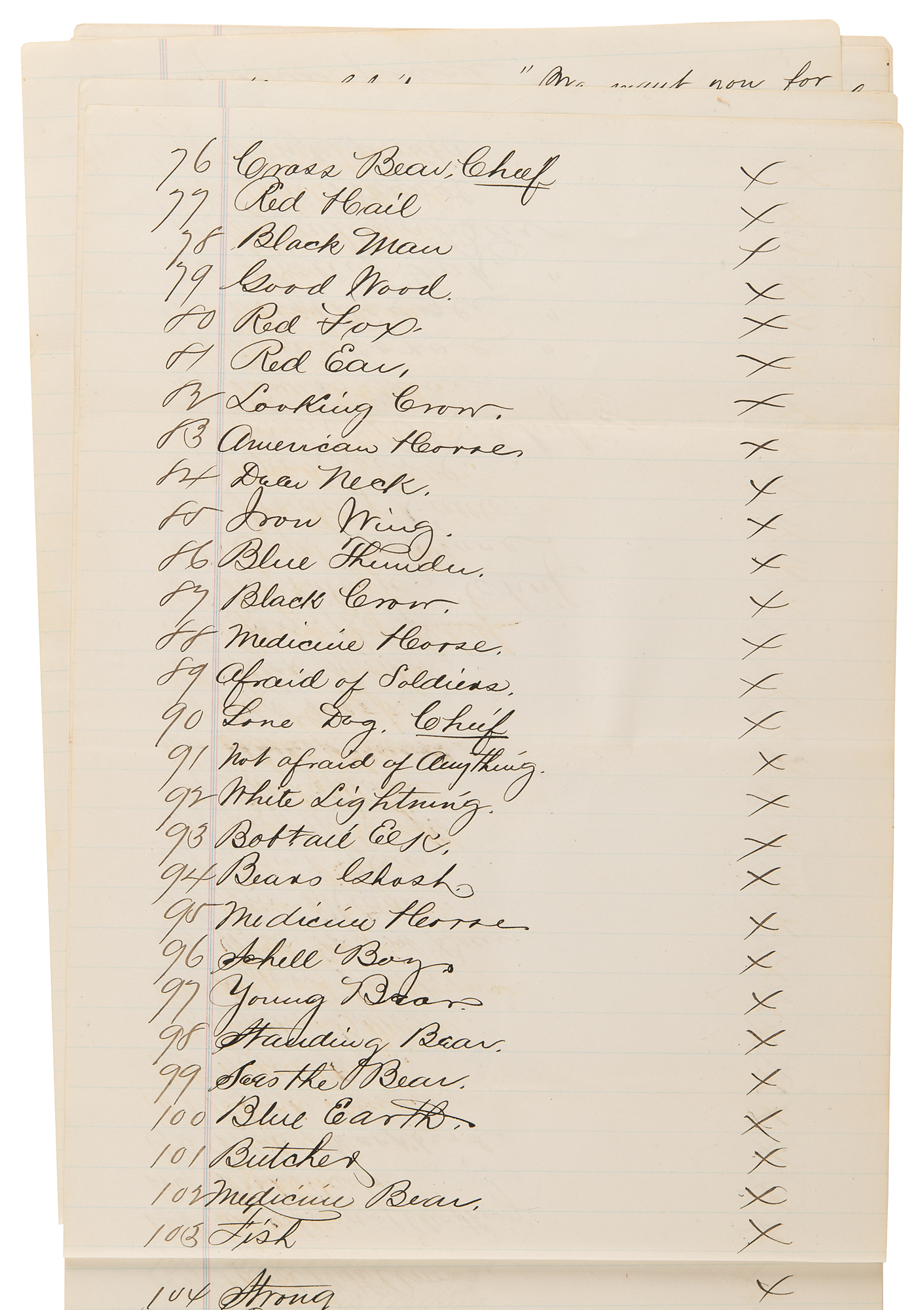 In the last, Chief Drag the Wood, Chief Running Walk, and Walking Eagle, "Indians belonging to the Standing Rock Indian Agency" attest that a "statement made by White Bear is correct."