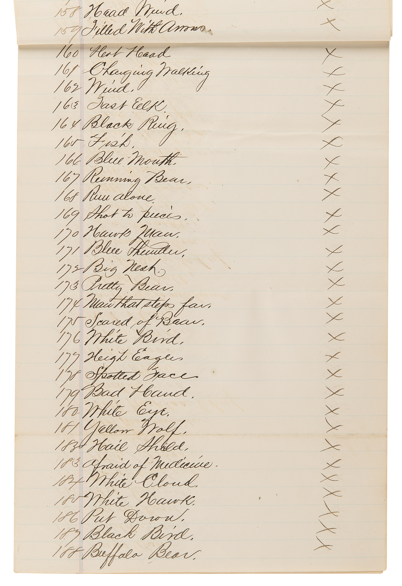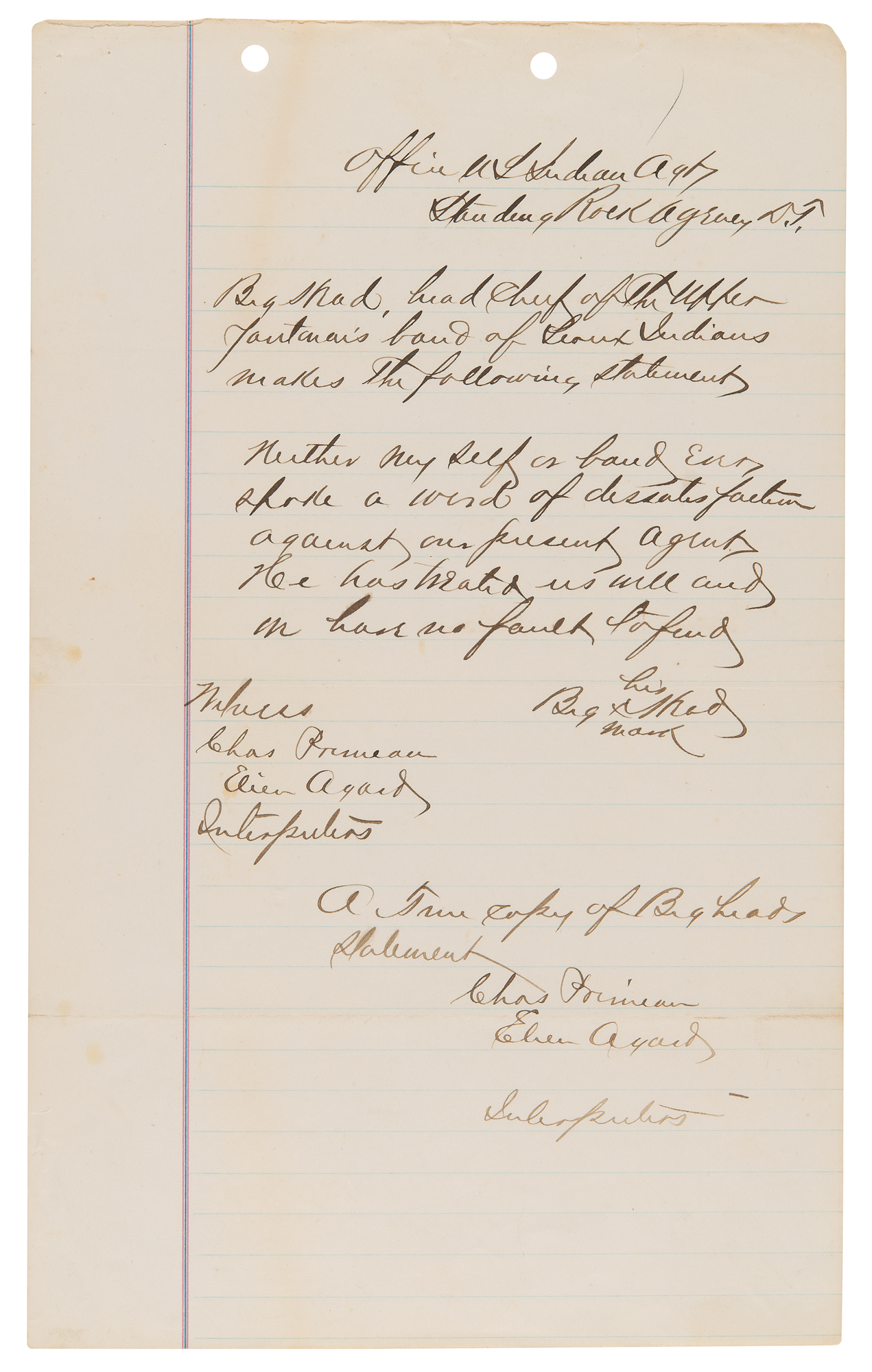 8. Manuscript copy of a deposition by Chief Big Head, one page, 7.75 x 12.5, circa April 1881. Manuscript copy of a deposition by the Sioux chief in relation to potential efforts to undermine the authority of the Indian agent, Father Joseph A. Stephan—known as the 'fighting priest'—at Standing Rock. In part: "Big Head, head Chief of the Upper Yantanais band of Sioux Indians makes the following statement: Neither my self or band ever spoke a word of dissatisfaction against our present agent. He has treated us well and we have no fault to find…A true copy of Big head's statement, Chas. Primeau, Elvin Agard, Interpreters."
