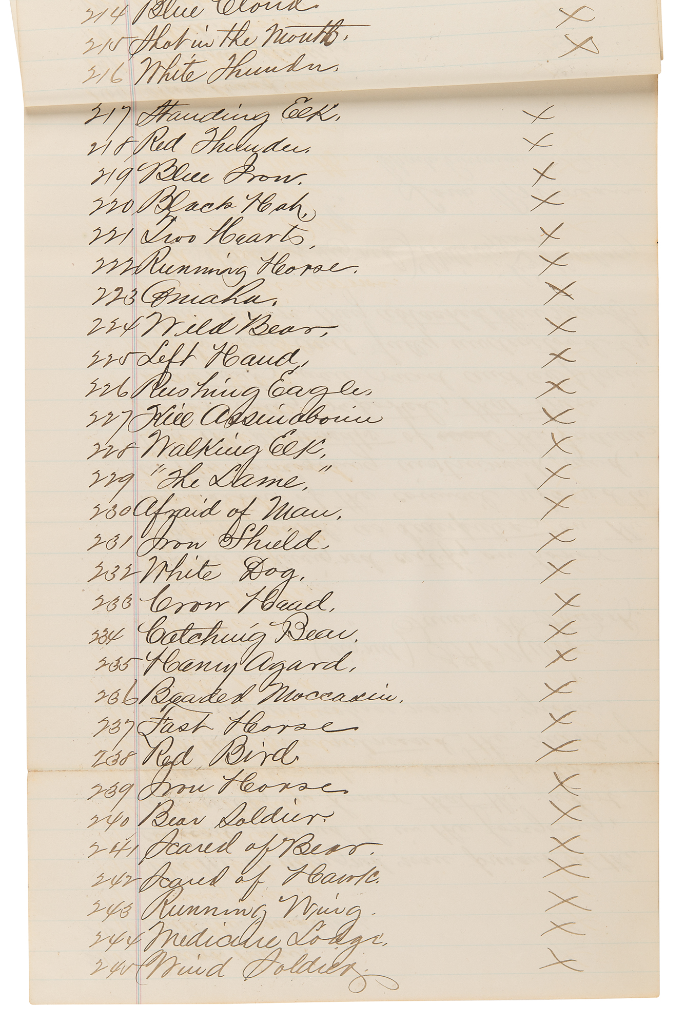 After further testimony come the names of the 247 Sioux in attendance, including "Rushing Eagle," "Standing Bear," "Iron Eagle," "Bald Head," "Red Top," "Crow Feather," "Red Hawk," "Takes the Gun," "Blue Thunder," "Medicine Horse," "Bobtail Elk," "Step on His Arrows," "No Heart," "Four Thighs," "White Owl," and "Breaking Armor."