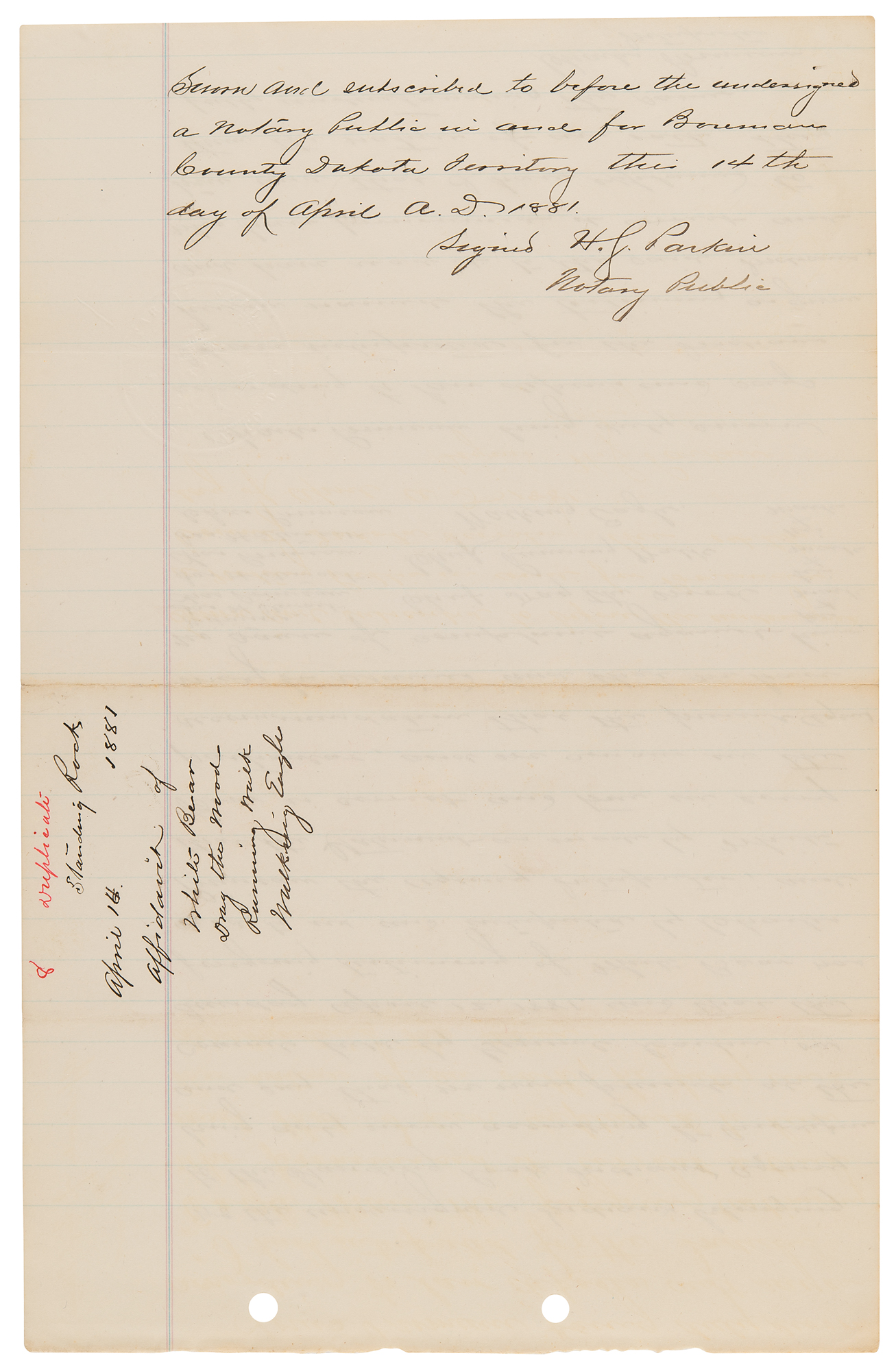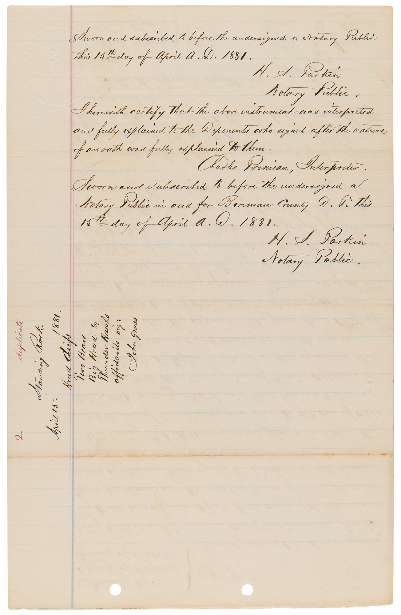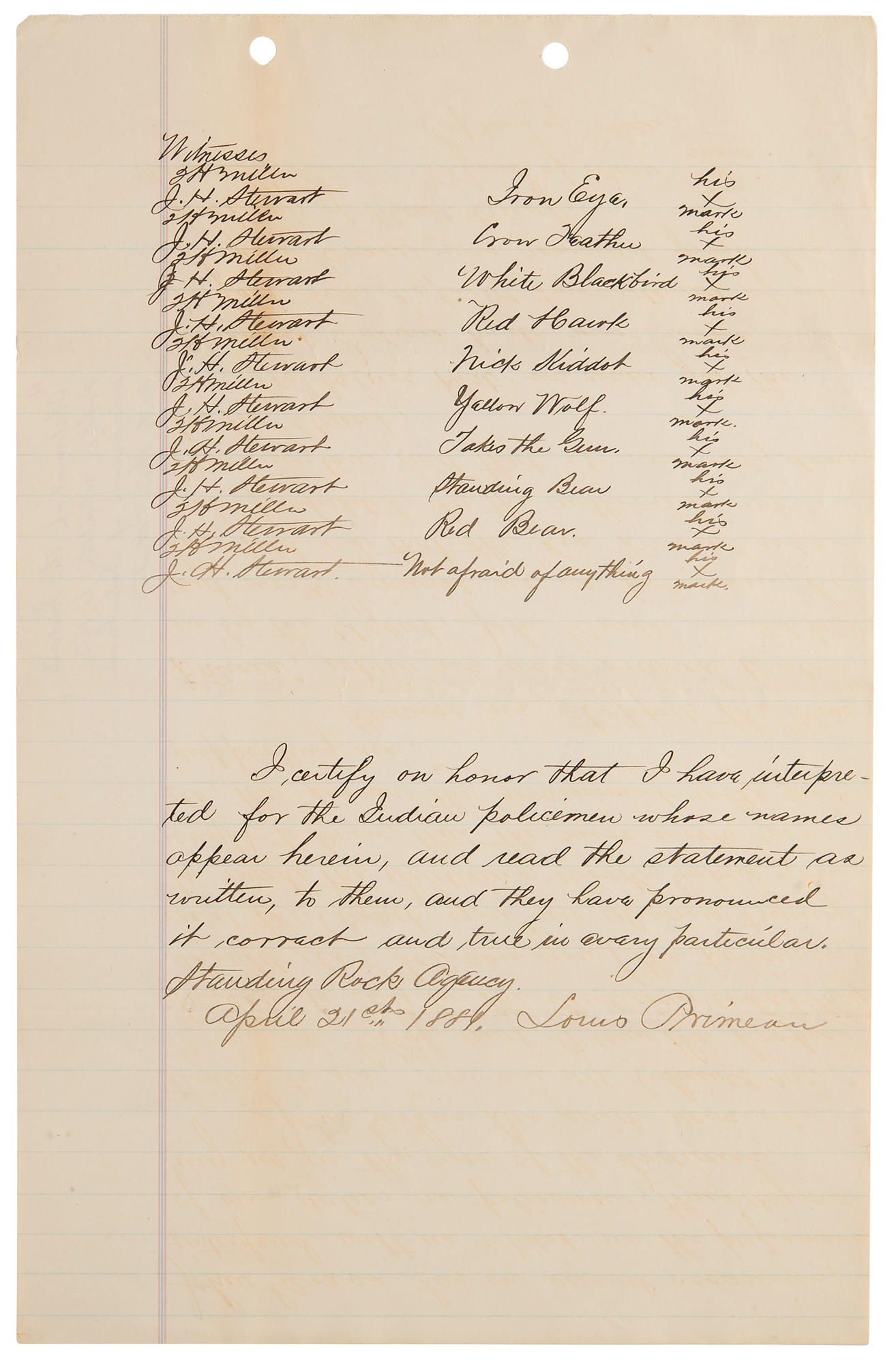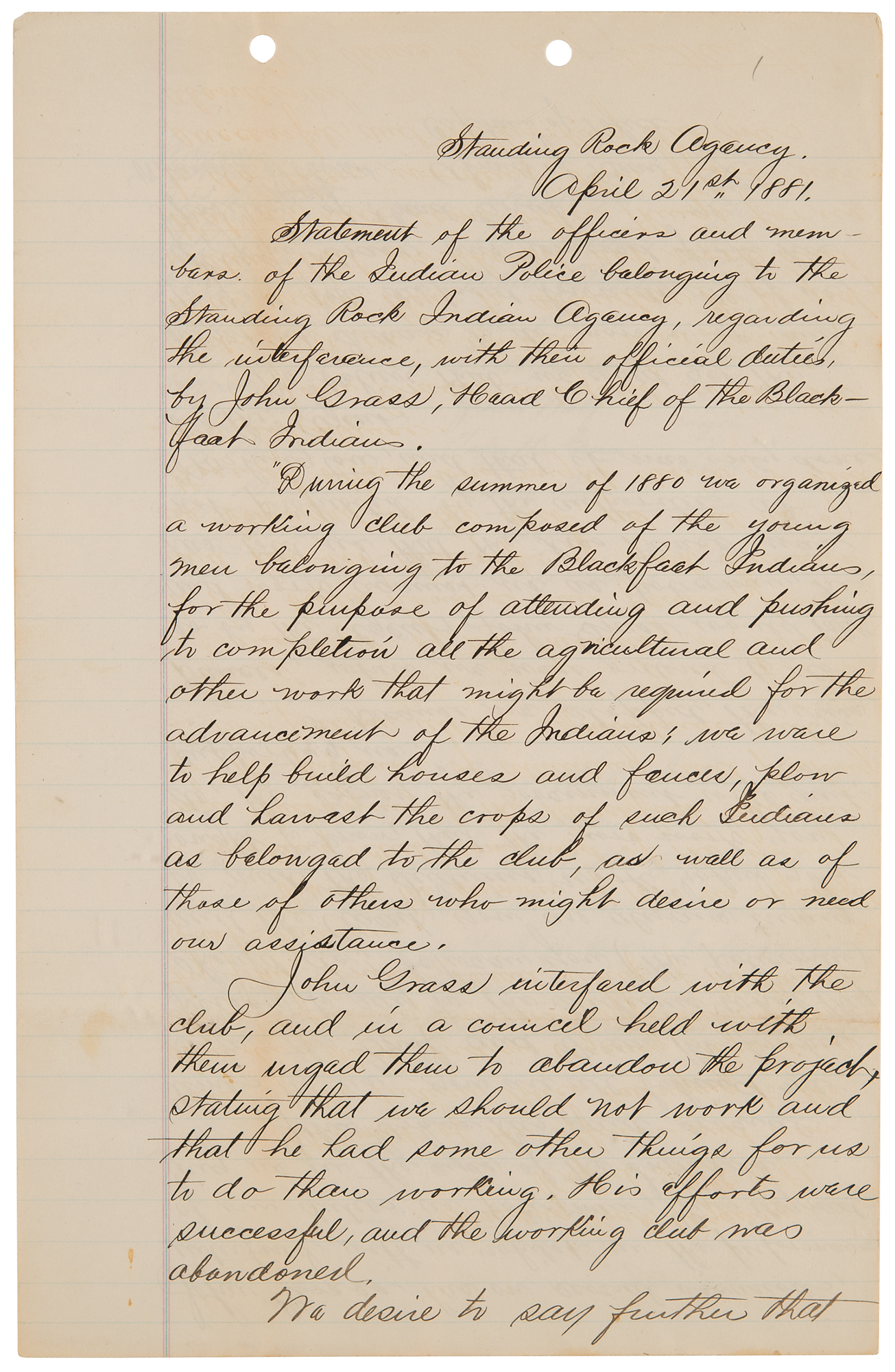 5. Manuscript copy of a deposition taken at Standing Rock by Louis Primeau, three pages on two sheets, 8 x 12.5, April 21, 1881. Notarized manuscript copy, in part: "Statement of the officers and members of the Indian Police belonging to the Standing Rock Indian Agency, regarding the interference, with their official duties, by John Grass, Head Chief of the Blackfoot Indians. 'During the summer of 1880 we organized a working club composed of the young men belonging to the Blackfoot Indians, for the purpose of attending and pushing to completion all the agricultural and other work that might be required for the advancement of the Indians: we were to help build houses and fences, plow and harvest the crops of such Indians as belonged to the club, as well as of those of others who might desire or need our assistance.