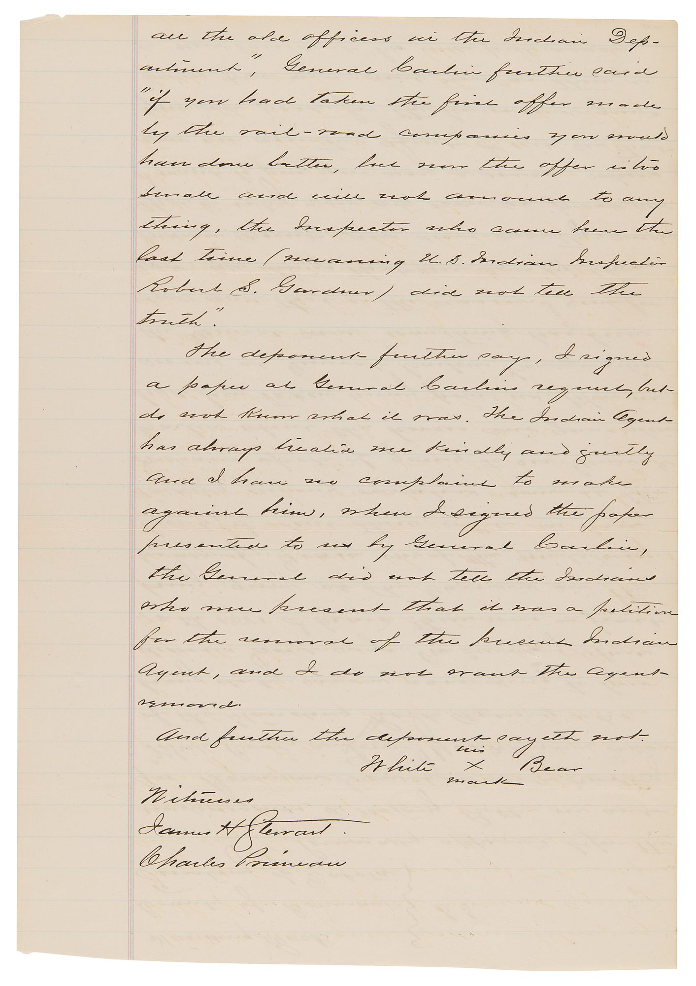 In the third, "'White Bear,' a Lower Yanktonnai Indian of the Standing Rock Agency" attests that he was part of a group that went "to see General Carlin about the horses and guns which had been taken away…When we arrived at General Carlin's Headquarters the General said something has been done and that is the reason I sent for you; all things that an done by the Indian Agent, are done scantily, and that is why you are now so poor…when you get another agent I will see that you are paid for the horses and guns taken from you."