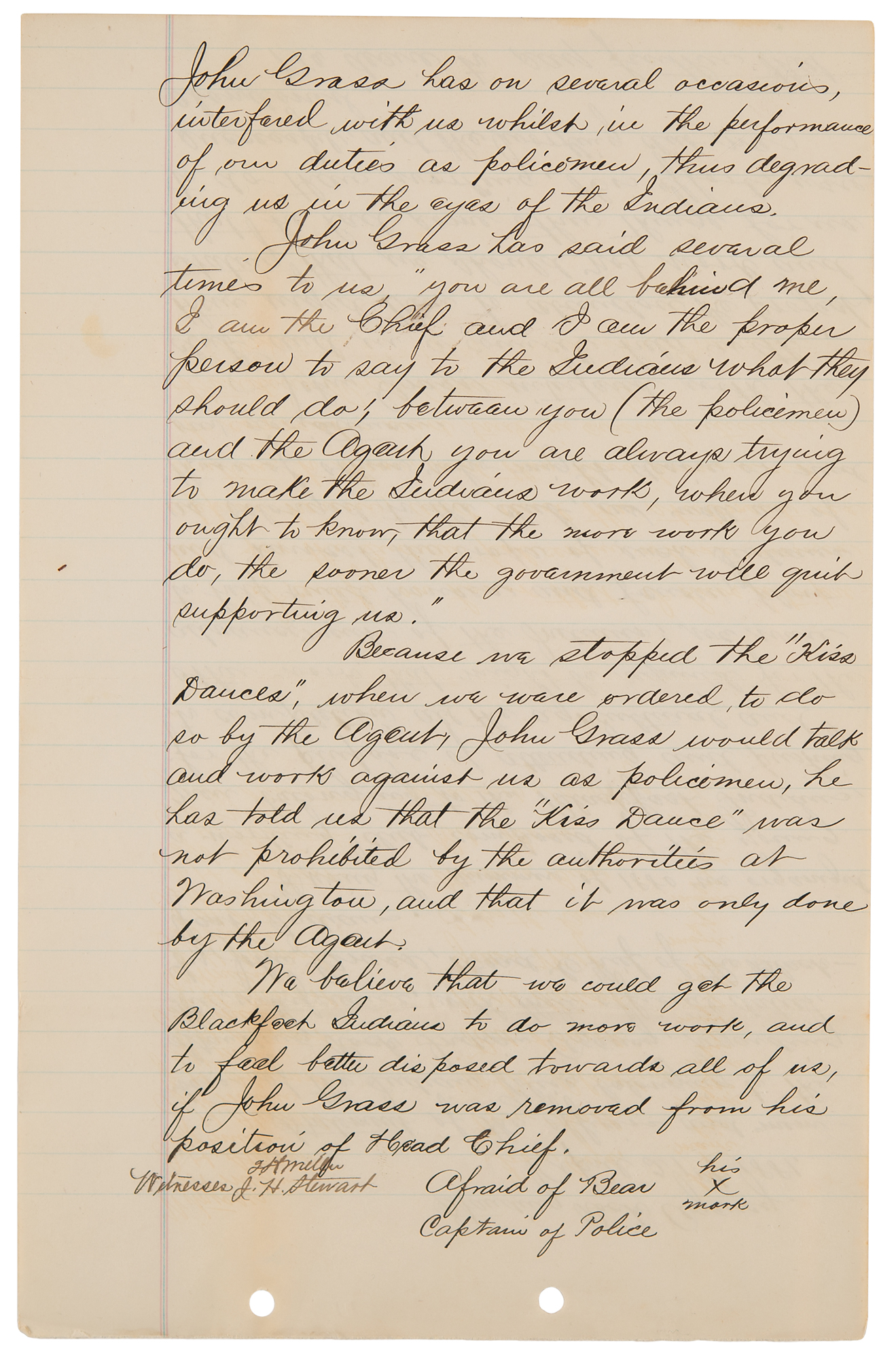 We desire to say further that John Grass has on several occasions, interfered with us whilst in the performance of our duties as policemen, thus degrading us in the eyes of the Indians. John Grass has said several times to us, 'you are all behind me, I am the Chief and I am the proper person to say to the Indians what they should do; between you (the policemen) and the Agent you are always trying to make the Indians work, when you ought to know, that the more work you do, the sooner the government will quit supporting me.'
