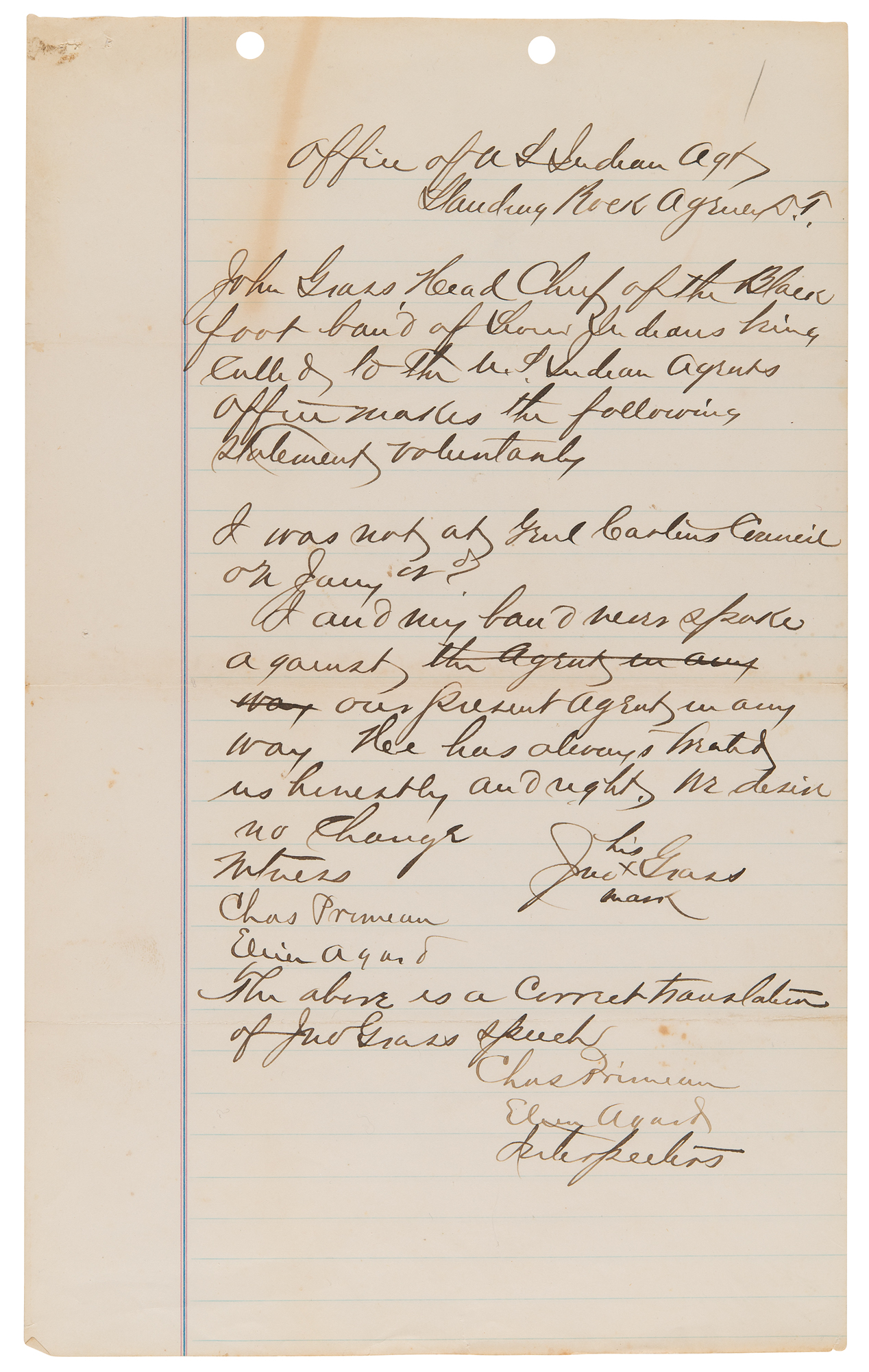 7. Manuscript copy of a deposition by Chief John Grass, one page, 7.75 x 12.5, circa April 1881. Manuscript copy of a deposition by the Sioux chief in relation to potential efforts to undermine the authority of the Indian agent, Father Joseph A. Stephan—known as the 'fighting priest'—at Standing Rock. In part: "John Grass Head Chief of the Blackfoot band of Sioux Indians being called to the U.S. Indian Agents office makes the following statement voluntarily: I was not at Genl. Carlin's Council on Jan'y 2d. I and my band never spoke against our present agent in any way. He has always treated us honestly and right. We desire no change…The above is a correct translation of Jno. Grass speech, Chas. Primeau, Elvin Agard, Interpreters."