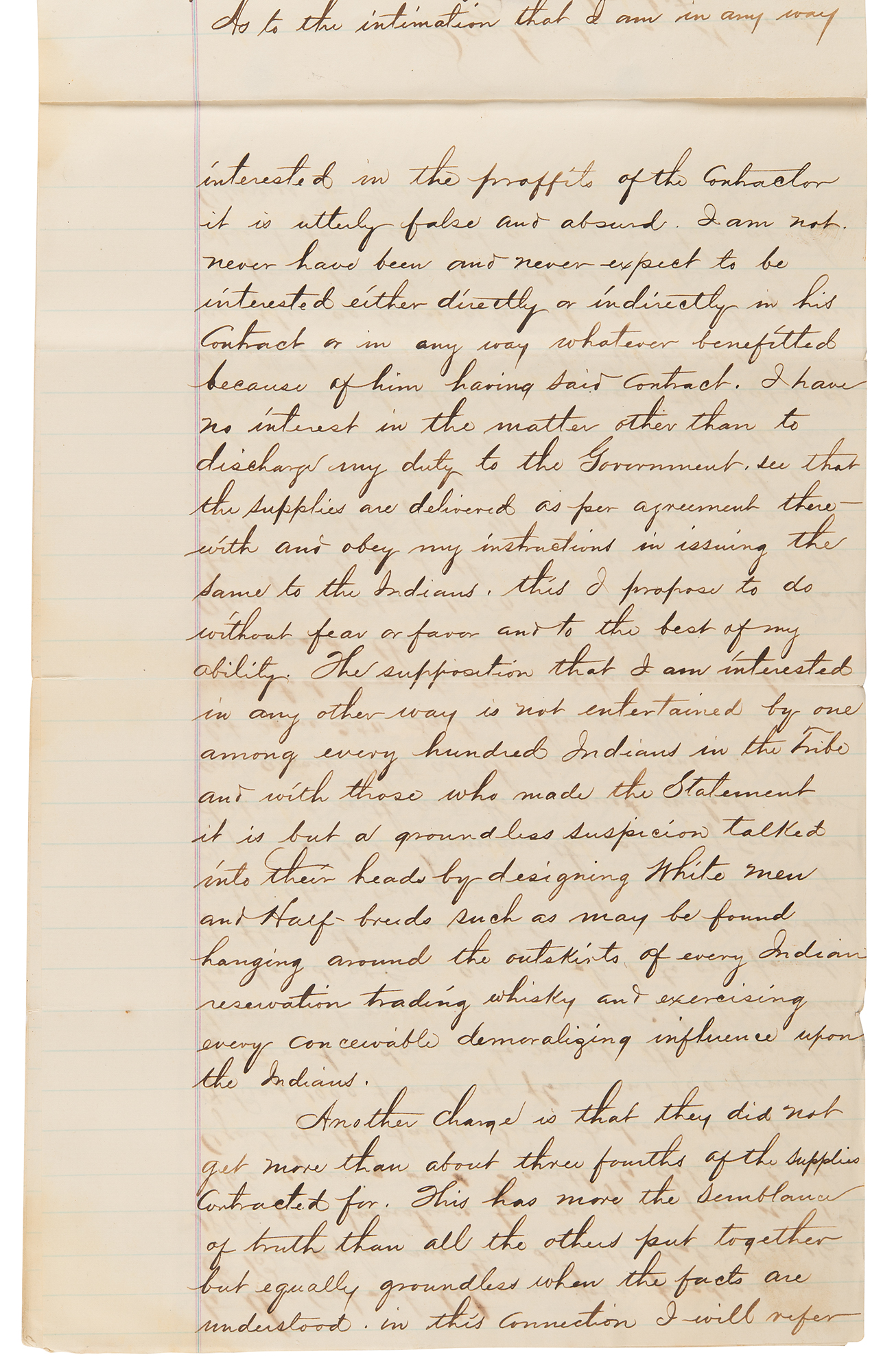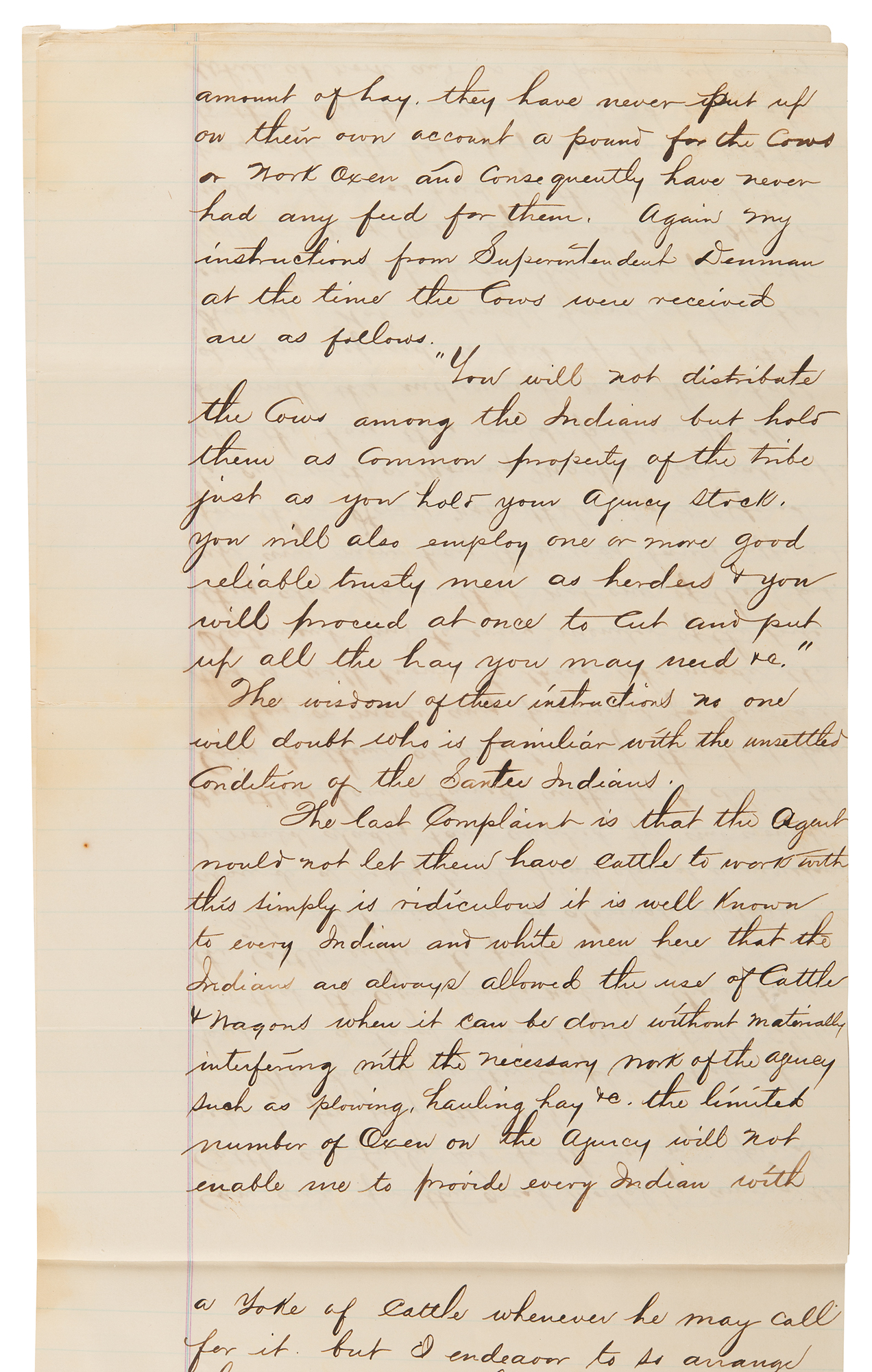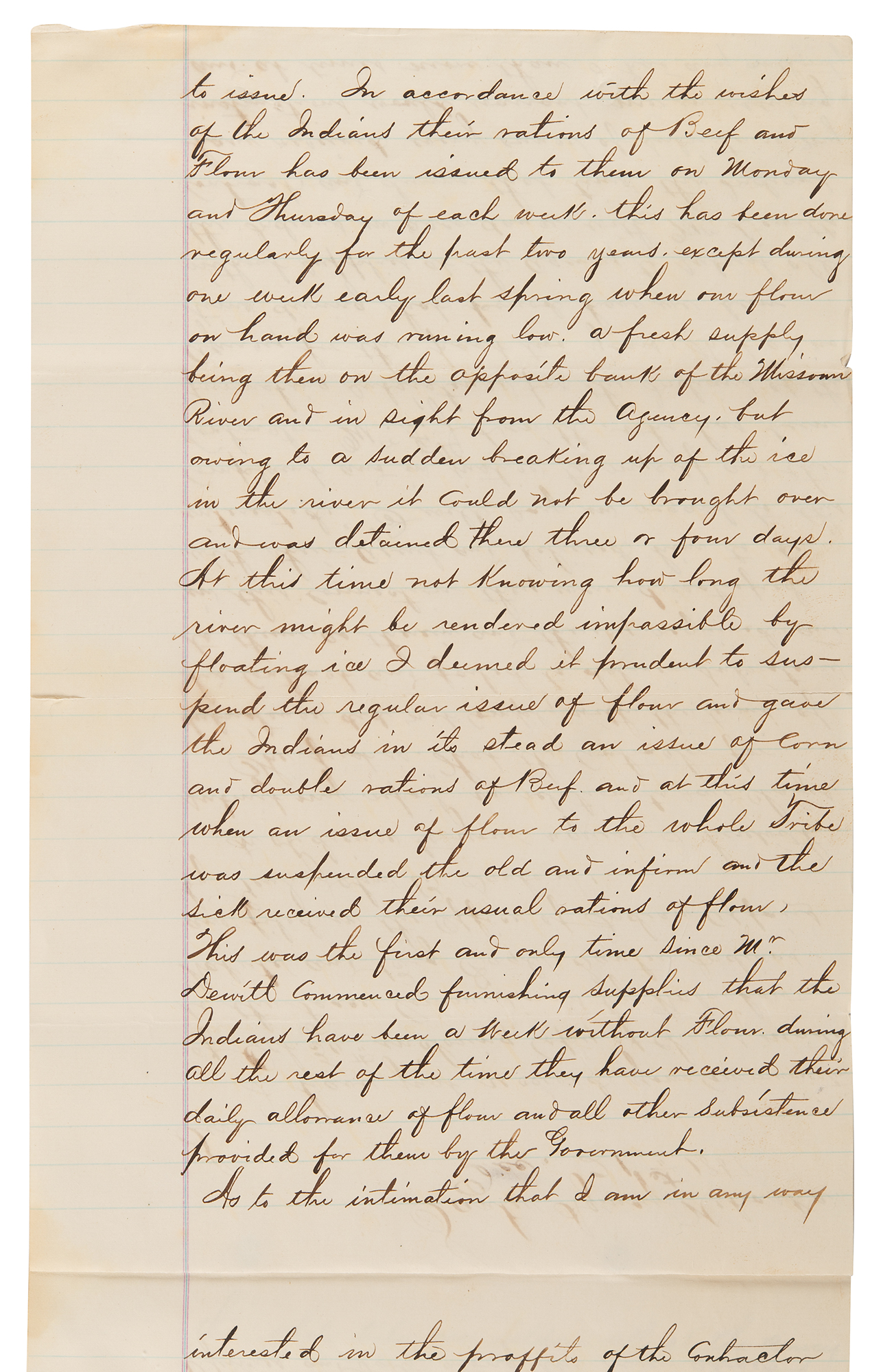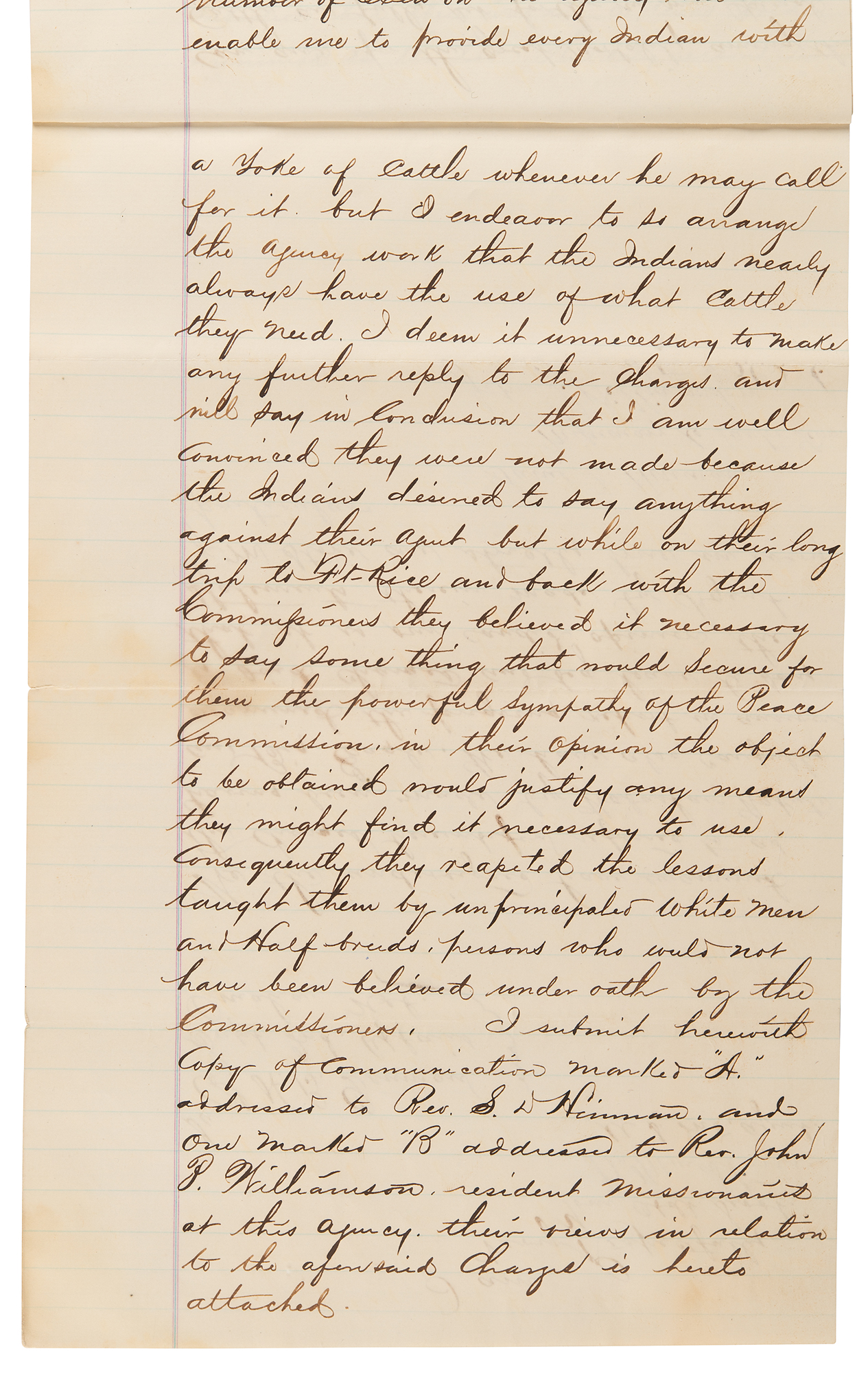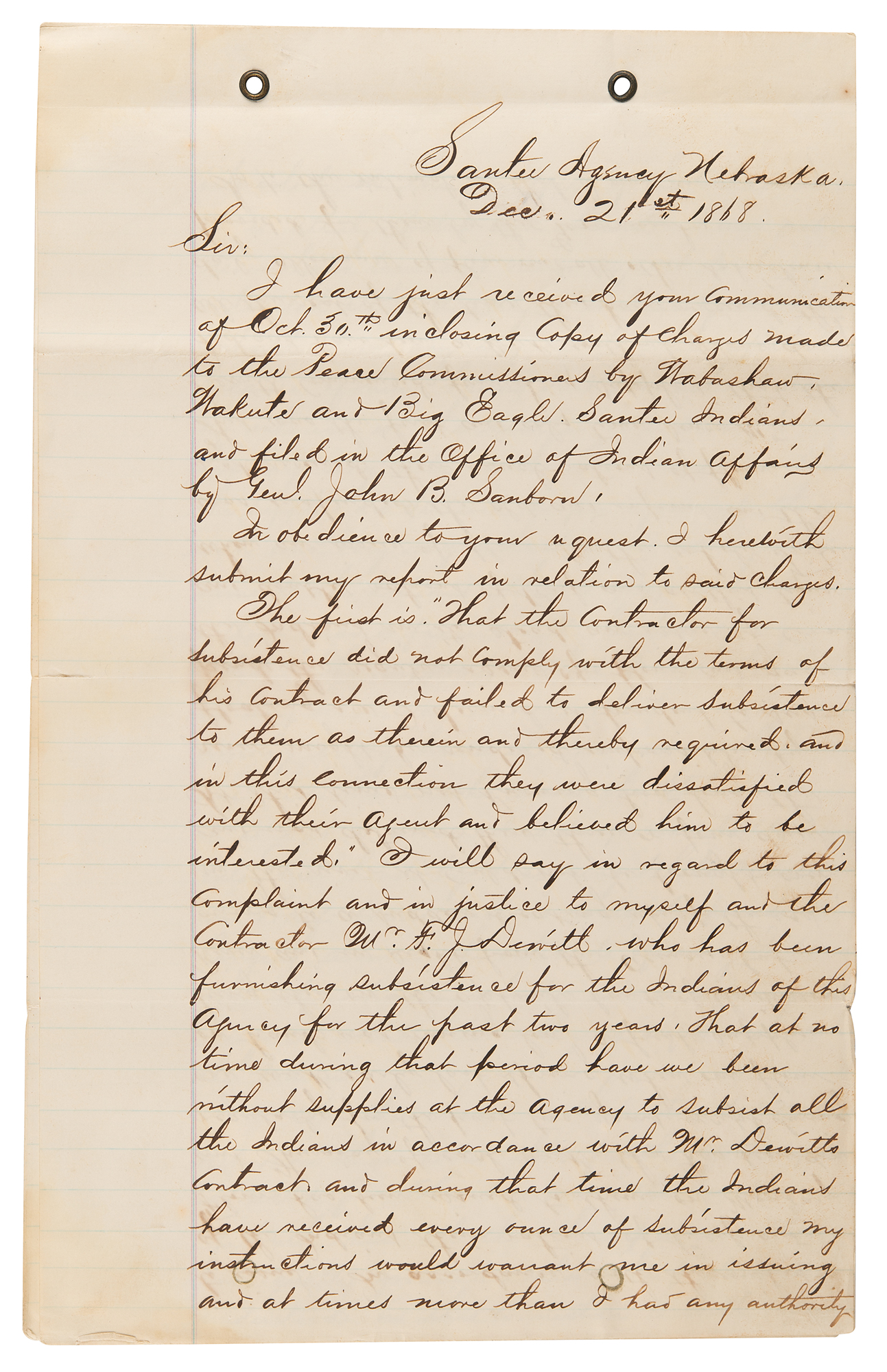 1. Rivet-bound manuscript DS, signed “J. M. Stone,” five pages both sides, 7.75 x 12.5, December 21, 1868. Report of Indian Agent J. M Stone in reply to charges made by Wabashaw, Wakute, and Big Eagle, concerning a violation in a contract for delivering rations. In part: "I will say in regard to this complaint and in justice to myself and the contractor Mr. F. J. Dewitt, who has been furnishing subsistence for the Indians of this Agency for the past two years, that at no time during that period have we been without supplies at the Agency to subsist all the Indians…In accordance with the wishes of the Indians their rations of Beef and Flour have been issued to them on Monday and Thursday of each week. This has been done regularly for the past two years, except during one week early last spring when our flour on hand was running low…As to the intimation that I am in any way interested in the proffits of the Contractor it is utterly false and absurd. I am not…The supposition that I am interested in any other way is not entertained by one among every hundred Indians in the Tribe and with those who made the Statement it is but a groundless suspicion talked into their heads by designing White men and Half-breeds such as may be found hanging around the outskirts of every Indian reservation trading whisky and exercising every conceivable demoralizing influence upon the Indians." He goes on to address other concerns related to the subsistence contract, including some inconsistencies and misconceptions related to the delivery of cattle and their fodder. Signed at the conclusion in ink by J. M. Stone, and further certified by a missionary.