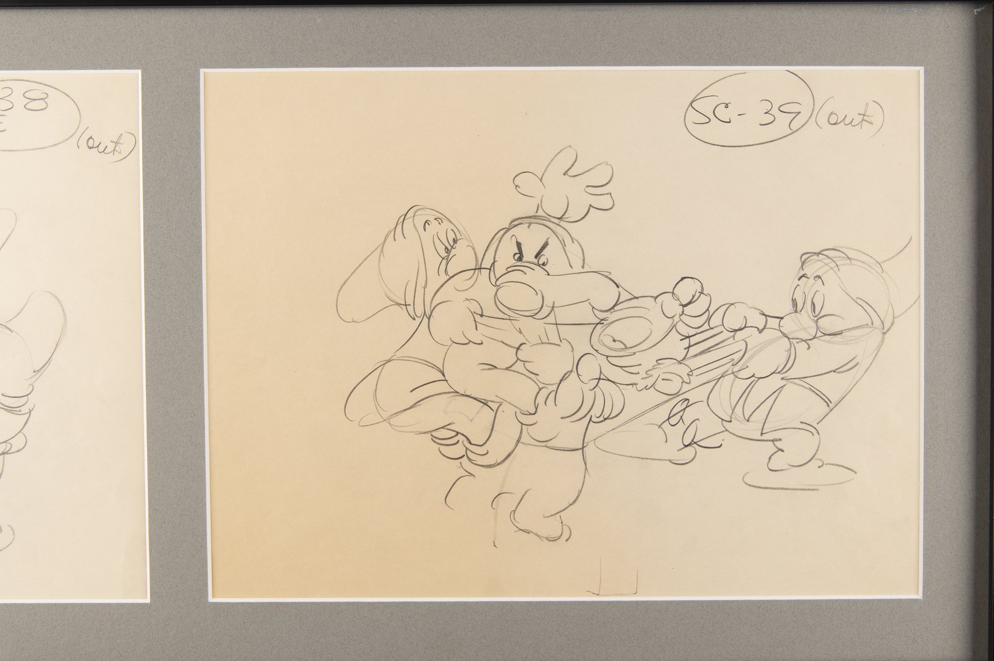 (Walt Disney Studios, 1937) Original pair of production drawings of several dwarfs from Snow White and the Seven Dwarfs, both of which depict Grumpy being carried to a water basin during the film's memorable washing sequence. Accomplished in graphite on two sheets of 11.5 x 8.5 animation paper, individually marked "SC-38 E, (out)" and "SC-39 (out)" in the upper right corner. Total character images measure 9.5 x 6.5 and 9.25 x 6.5. Both are matted and framed together to an overall size of 27.5 x 12. In overall fine condition.