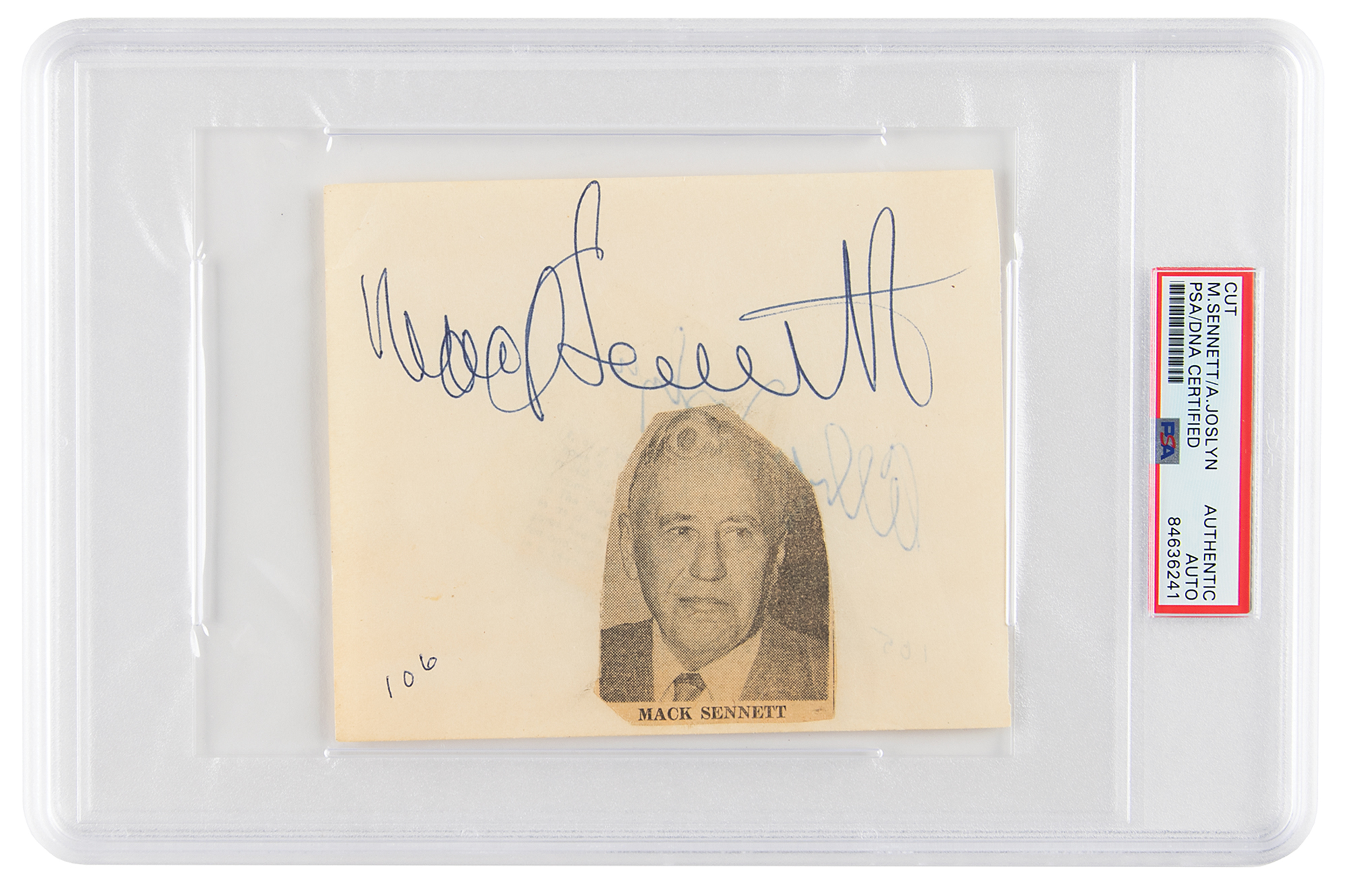 Vintage ballpoint signature of the slapstick studio head, "Mack Sennett,” on an off-white 5.25 x 4.25 album page. In very good to fine condition, with show-through from an Allyn Joslyn signature on the reverse. Encapsulated in a PSA/DNA authentication holder.