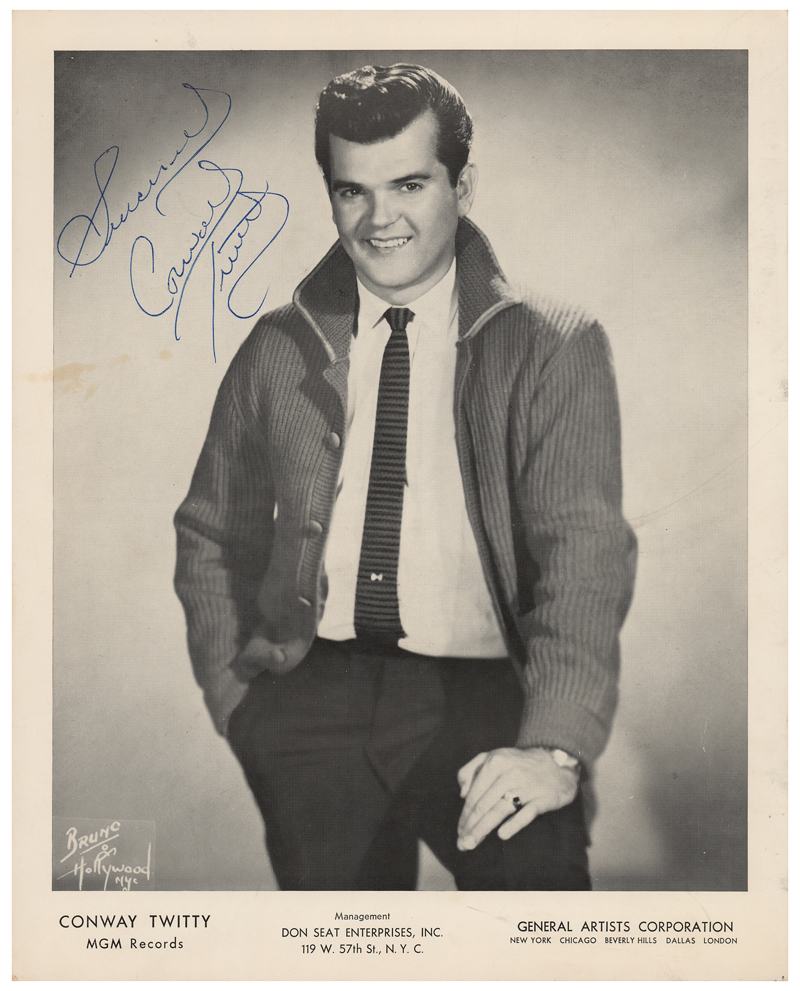 Vintage 8 x 10 MGM Records cardstock photo, signed in blue ballpoint, "Sincerely, Conway Twitty." In fine condition, with some light stains to the left background area.