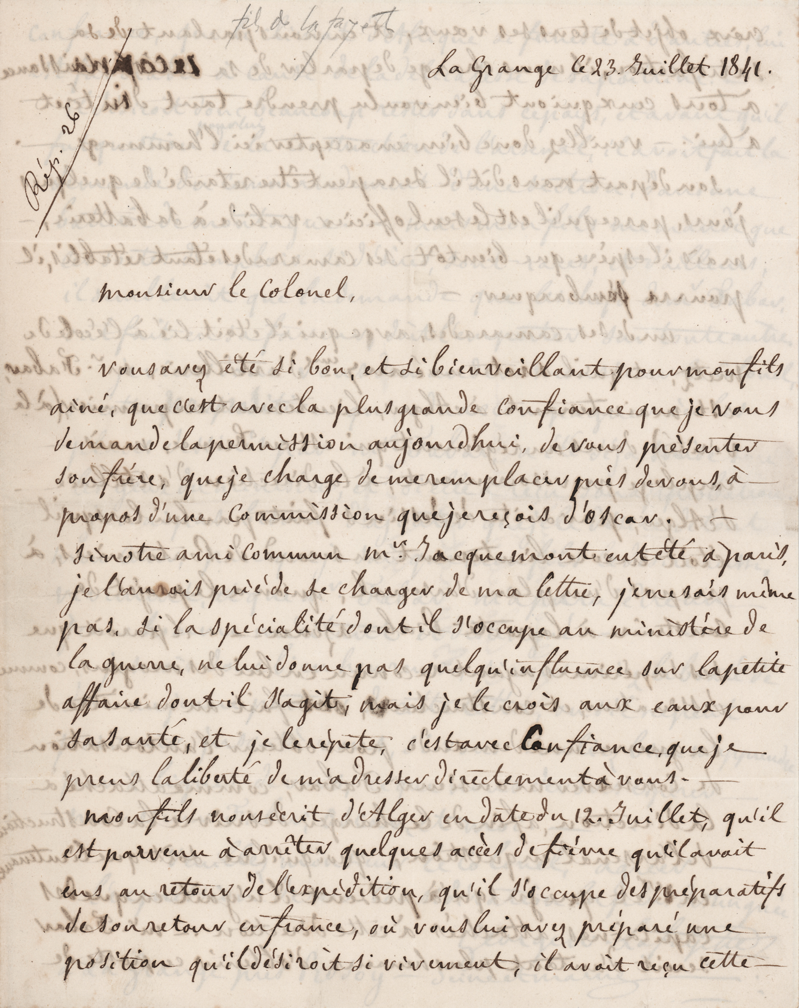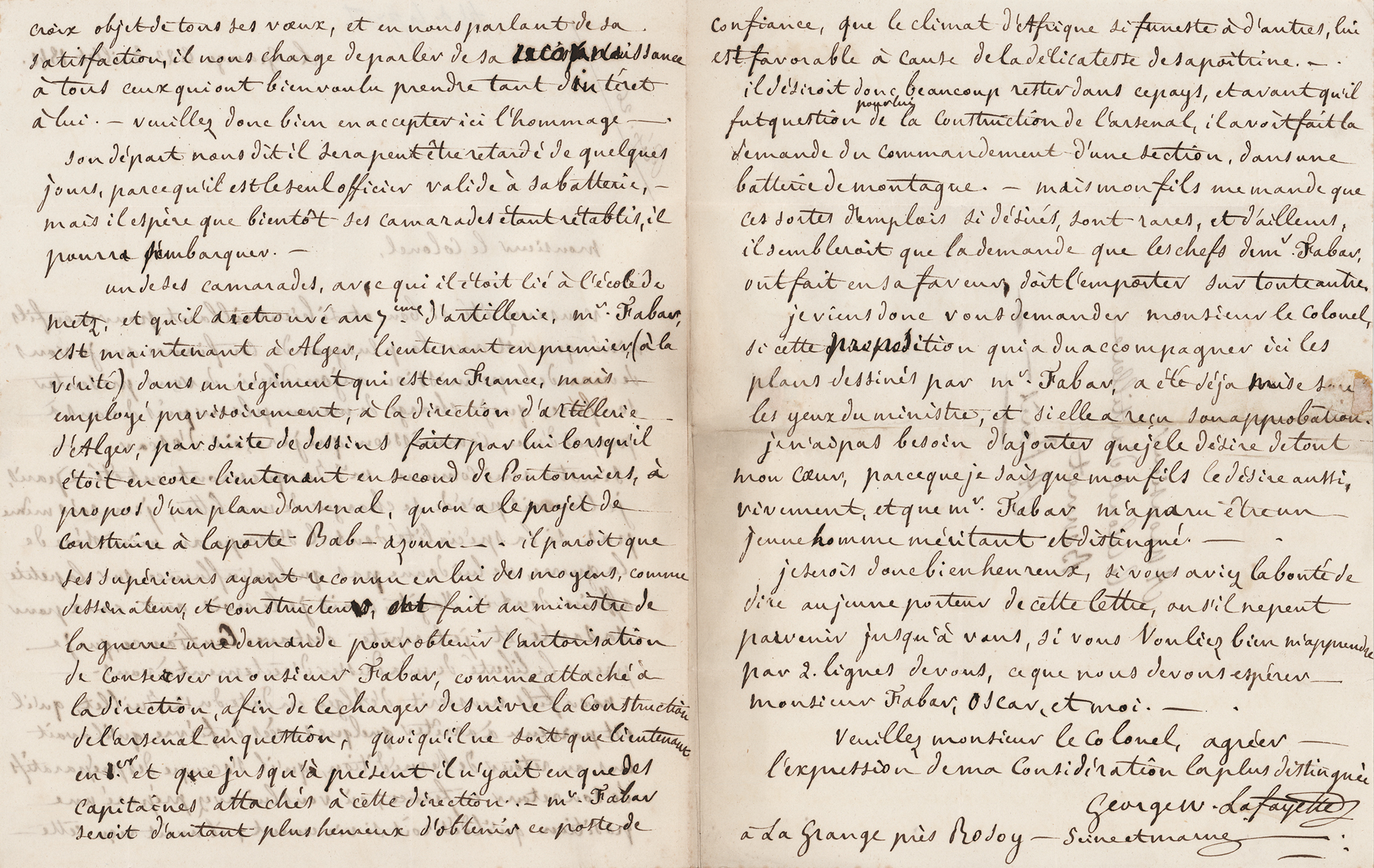 The son (1779–1849) of Gilbert du Motier, Marquis de Lafayette, the French officer and hero of the American Revolution, and Adrienne de La Fayette, who was named in honor of George Washington, under whom the Marquis de Lafayette served during the Revolution. ALS in French, signed “George W. La Fayette,” one page, 6.75 x 8.5, July 23, 1841. Untranslated letter to a colonel, written from La Grange. In fine condition.
