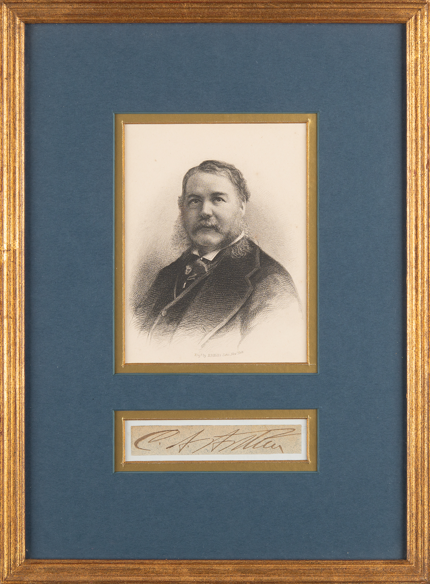 Ink signature of Chester A. Arthur, "C. A. Arthur,” on an off-white 3.5 x .5 slip, which is double-matted and framed with an engraved portrait to an overall size of 9.25 x 12.75. In fine condition.
