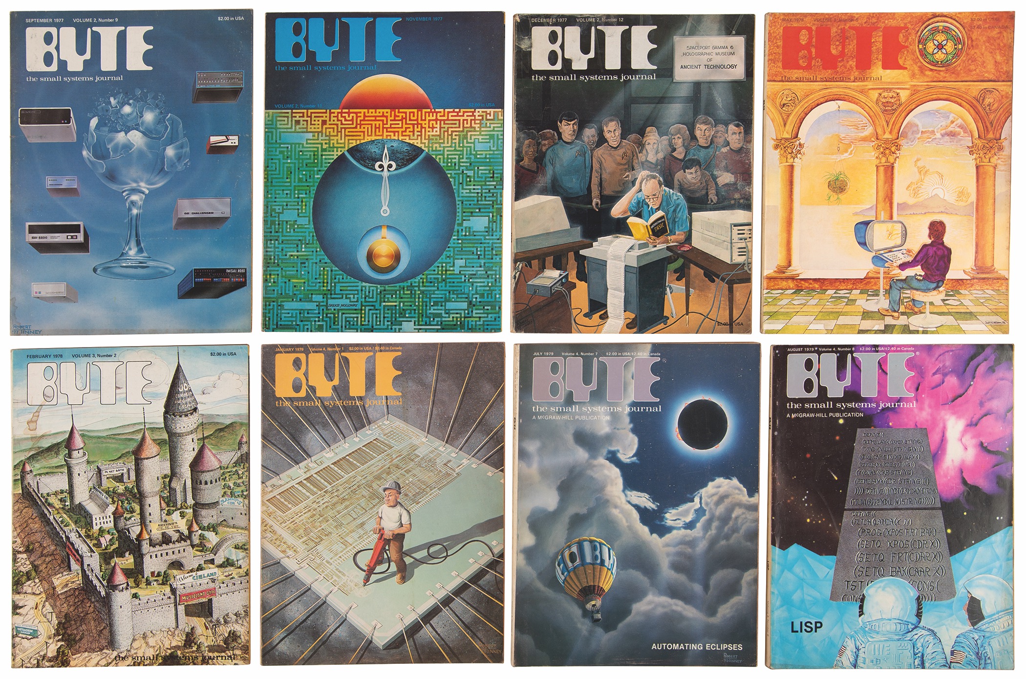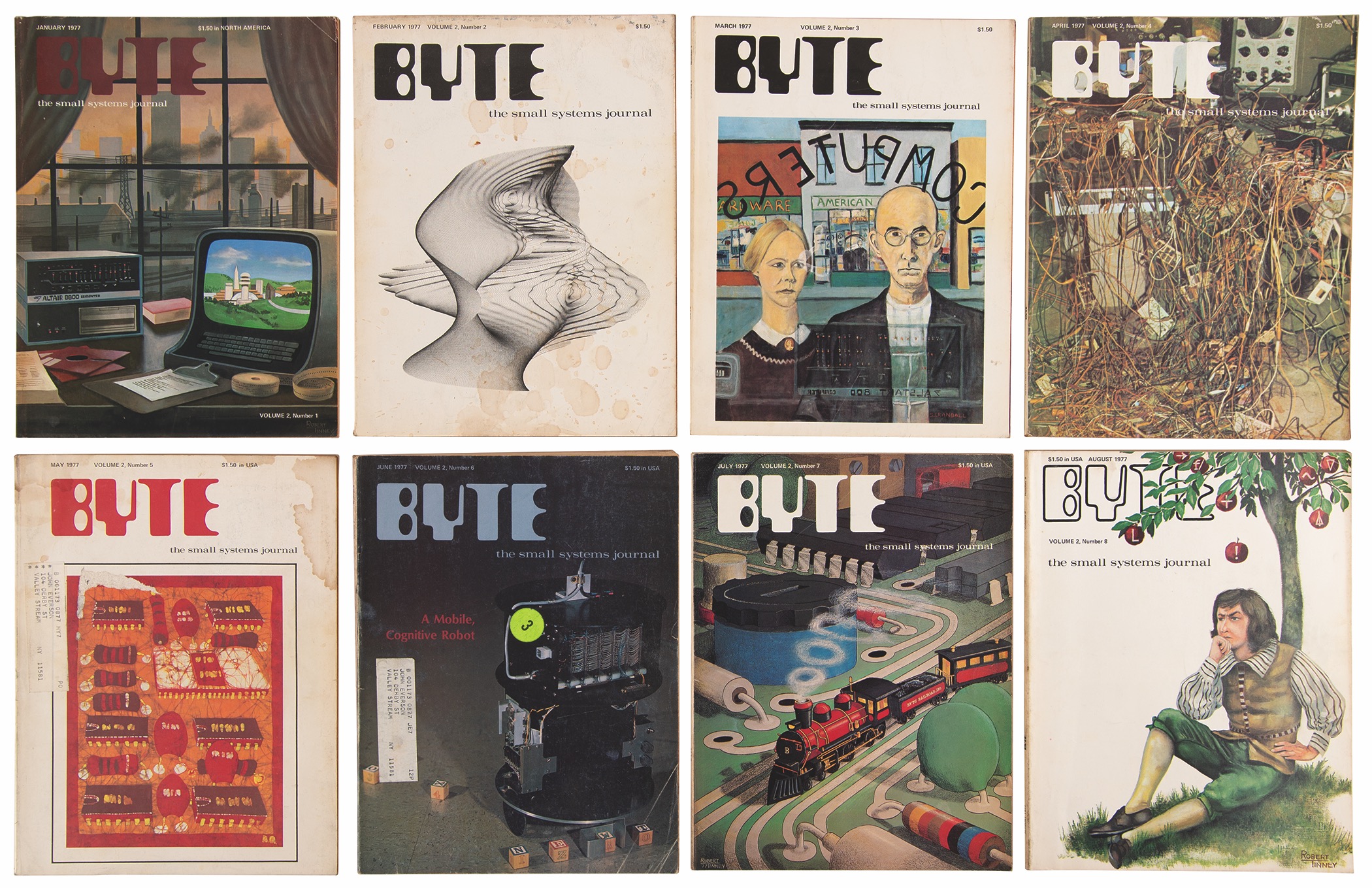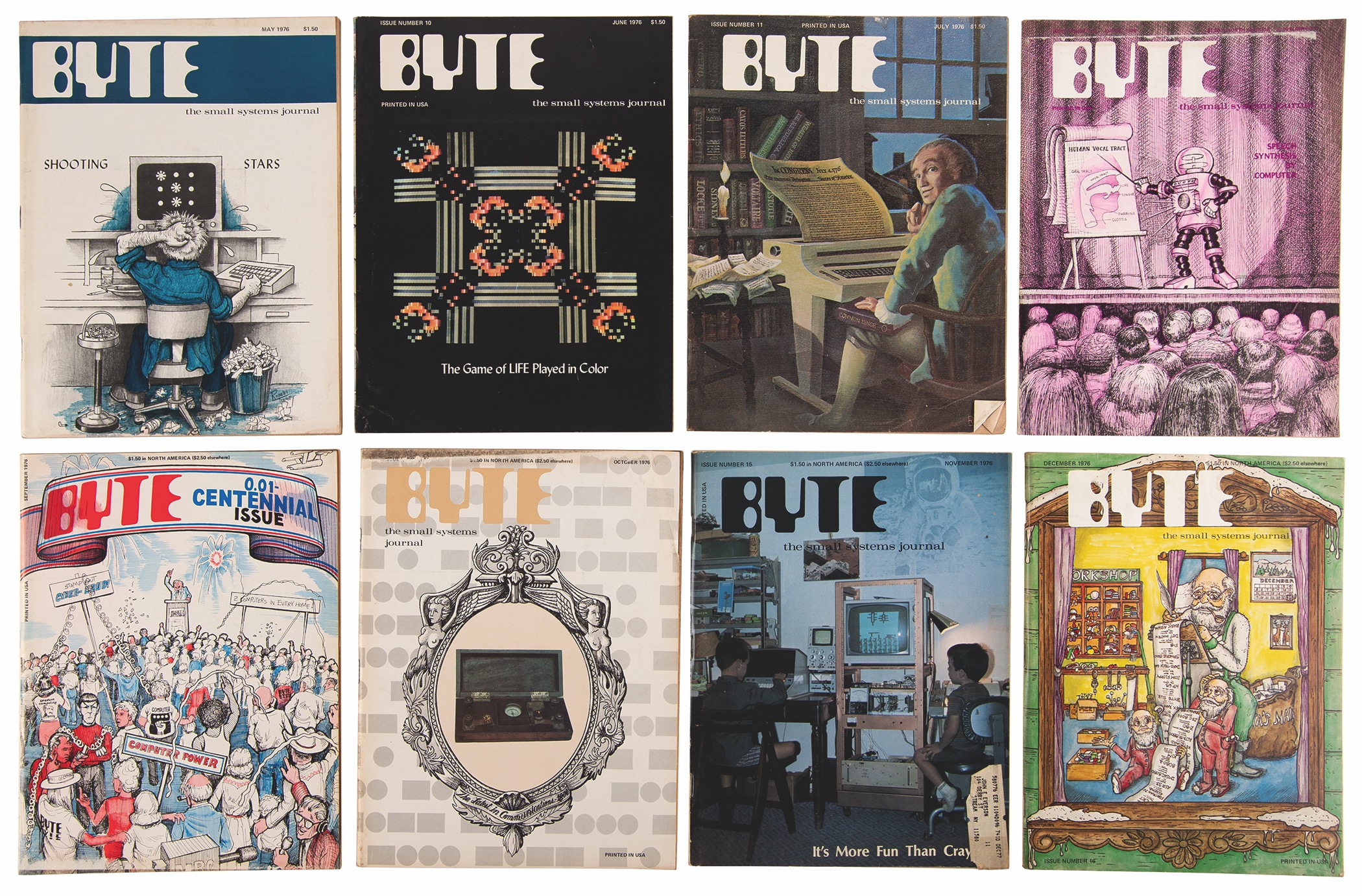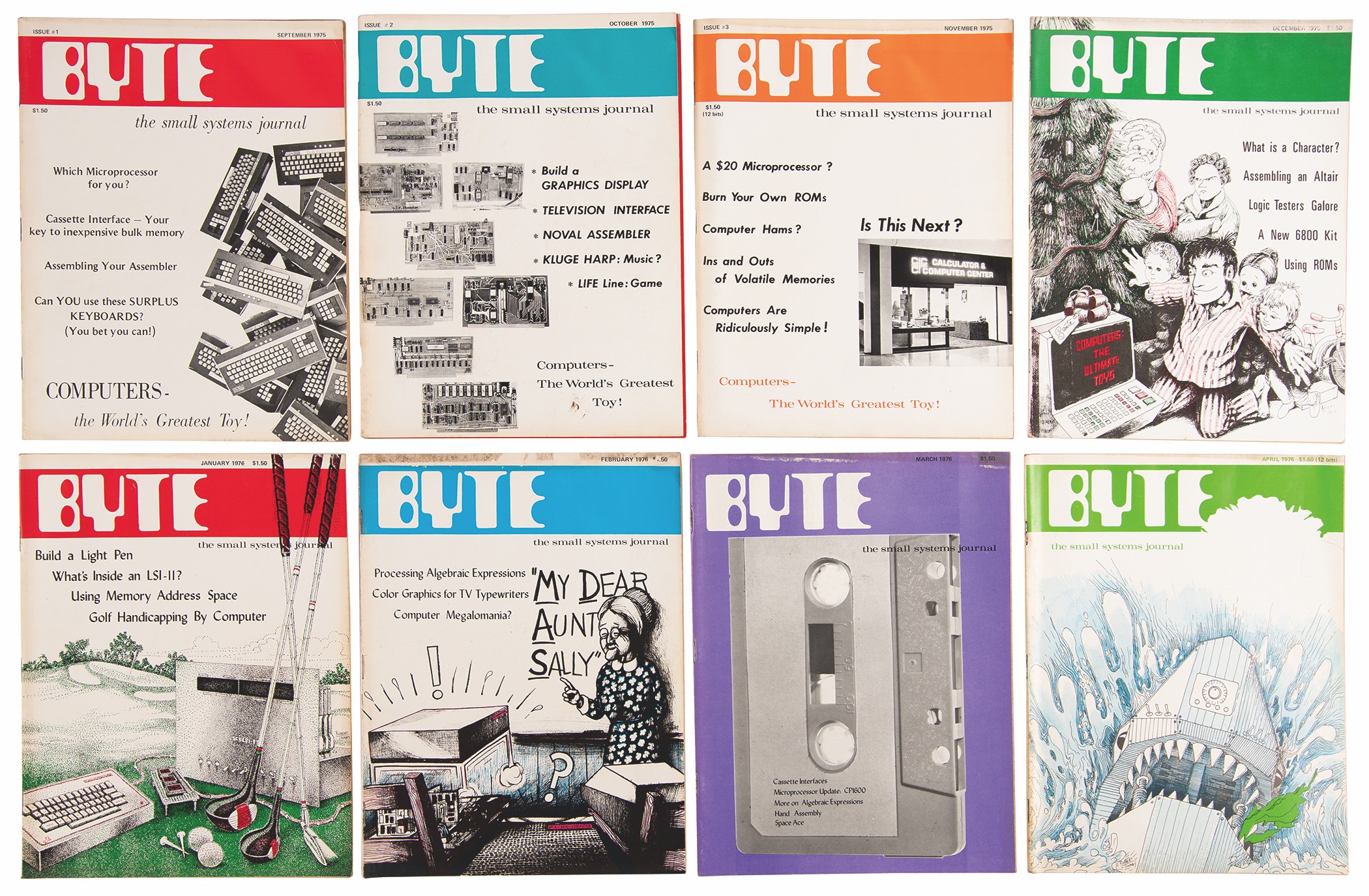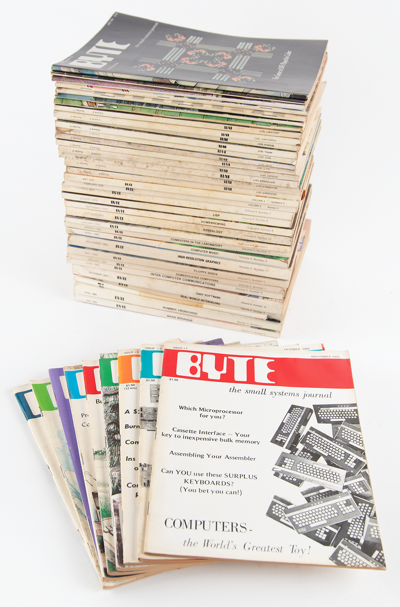 Impressive collection of 44 issues of Byte: The Small Systems Journal, the most influential microcomputing magazine of its day, highlighted by a complete run of the first 25 issues, from September 1975 to September 1977. Most significant is Byte Issue #1, with the cover advertising several articles: "Which Microprocessor is for you?," "Cassette Interface—Your key to inexpensive bulk memory," "Assembling Your Assembler," and "Can you use these surplus keyboards? (You bet you can!)." The remainder of the collection consists of 19 issues ranging in date from November 1977 to May 1986. In overall good to very good condition, with general wear and some scattered dampstaining.