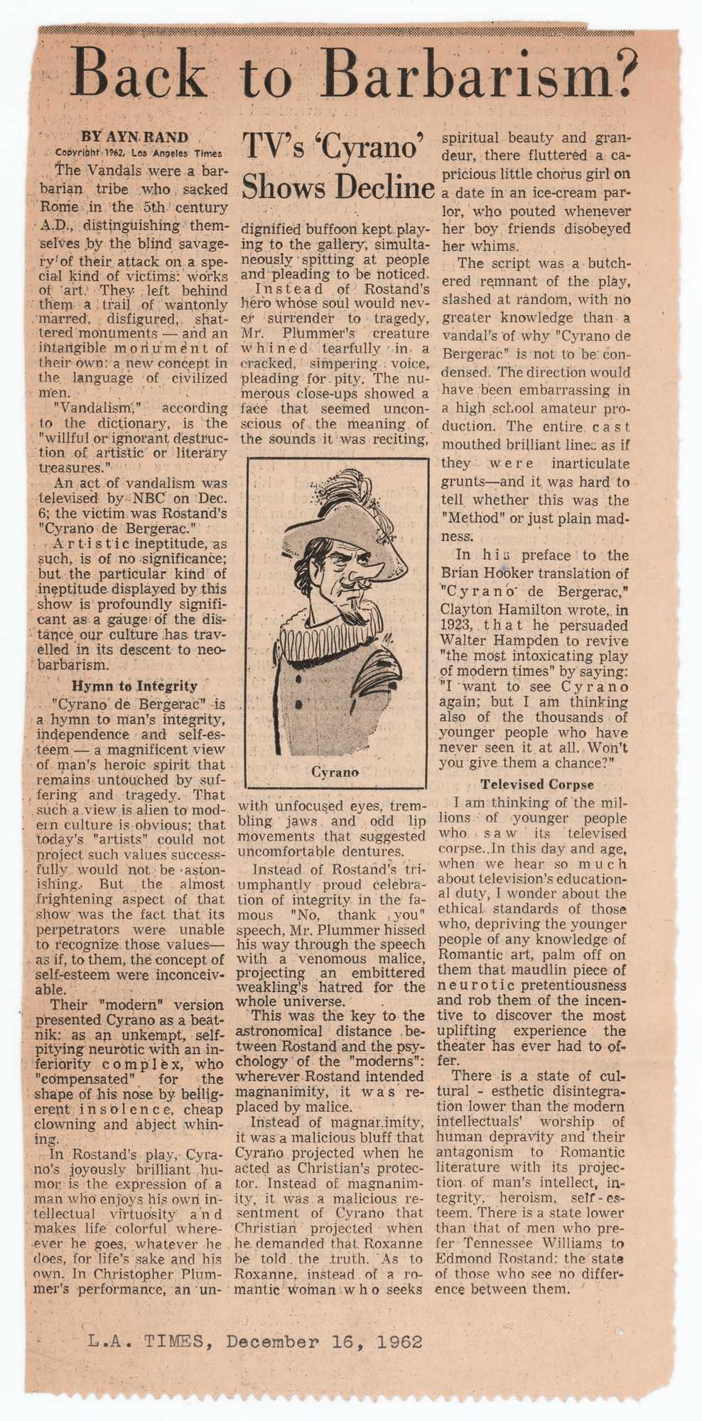 Accompanied by the referenced clipped column, which contains Rand’s scathing article entitled ‘Back to Barbarism? TV’s ‘Cyrano’ Shows Decline, which reads, in part: ‘The script was a butchered remnant of the play, slashed at random, with no greater knowledge than a vandal's of why ‘Cyrano de Bergerac’ is not to be condensed. The direction would have been embarrassing in a high school amateur production. The entire cast mouthed brilliant lines as if they were inarticulate grunts and it was hard to tell whether this was the ‘Method’ or just plain madness.’