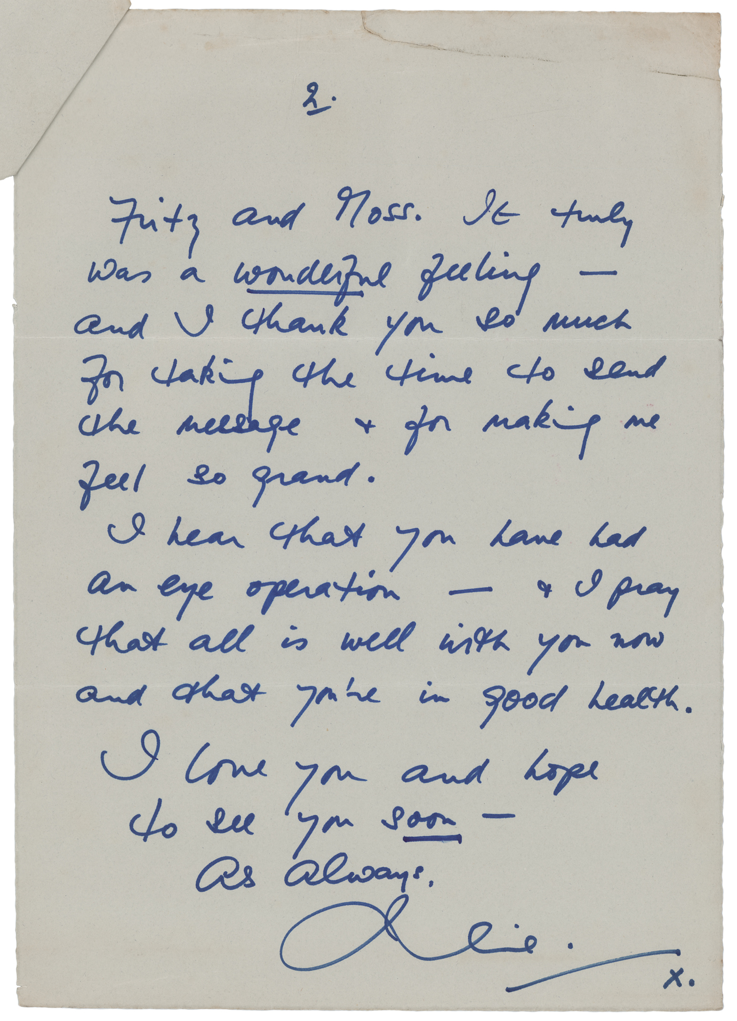 ALS signed “Julie, x,” two pages, 8.25 x 11.75, personal letterhead, no date [February 1983]. Handwritten letter to award-winning lyricist and librettist Alan Jay Lerner, in full: “The loving and thoughtful taped message you sent for the Harvard ‘Hasty Pudding’ – Hollywood style – moved me so deeply that I thought I was going to become a weeping idiot right there on the stage. Your voice evoked so many memories. For a few seconds the years just rolled away and I was back in New York with you & Fritz and Ross. It truly was a wonderful feeling – and I thank you so much for taking the time to send the message & for making me feel so good. I hear that you have had an eye operation – & I pray that all is well with you now and that you’re in good health. I love you and hope to see you soon.” In fine condition, with a short tear to the top edge of the second page. Julie Andrews was honored as Harvard's Hasty Pudding Theatricals Woman of the Year in 1983. The award was presented on February 16, 1983, at a ceremony where she was given a costume worn by the club's president. She later participated in a parade through Harvard Square.