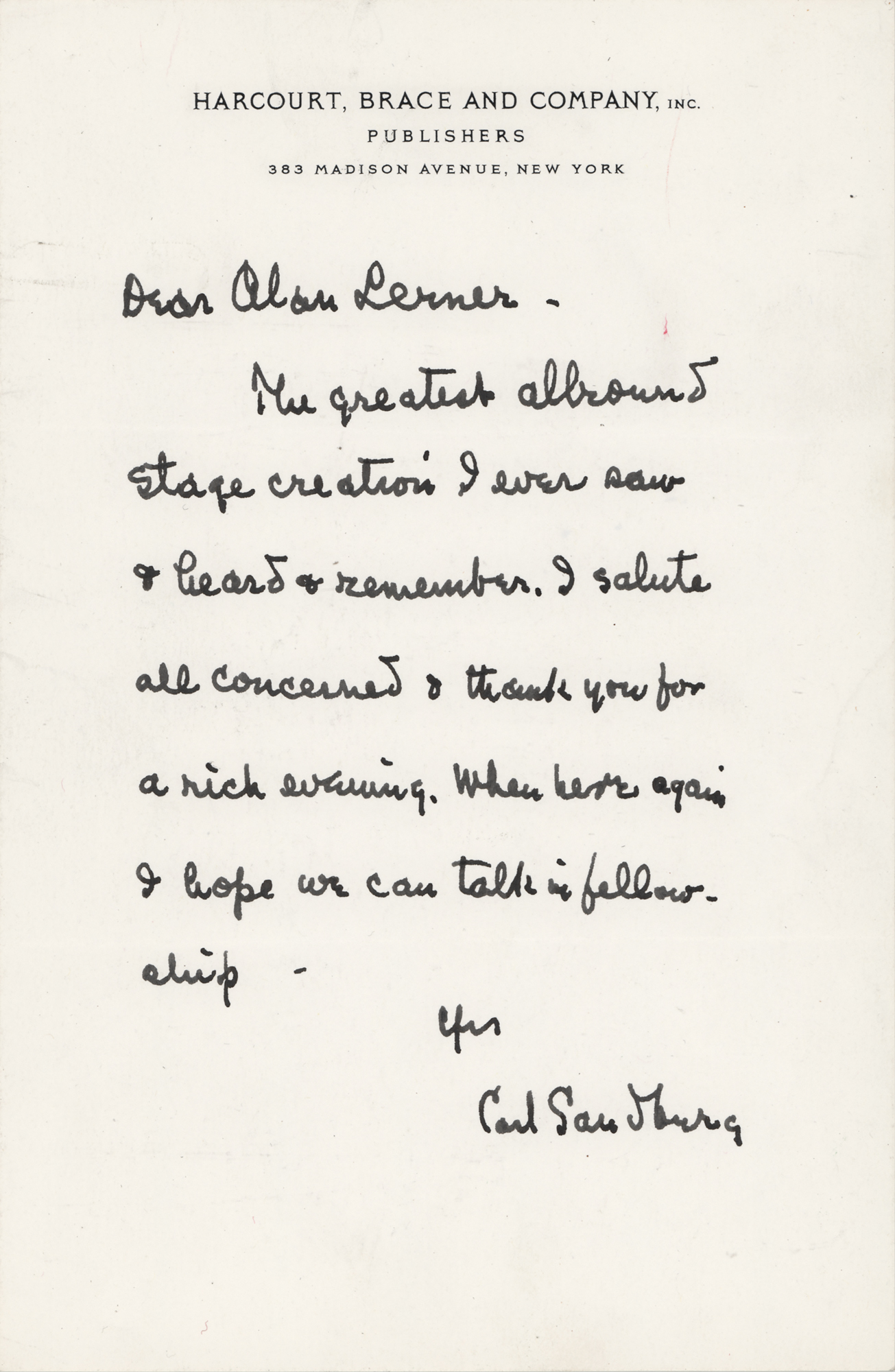 ALS, one page, 5.25 x 8.25, Harcourt, Brace and Company letterhead, no date. Handwritten letter to award-winning lyricist and librettist Alan Jay Lerner, in full: “The greatest allround stage creation I ever saw & heard & remember. I salute all concerned & thank you for a rich evening. When here again I hope we can talk in fellowship.” In very fine condition.