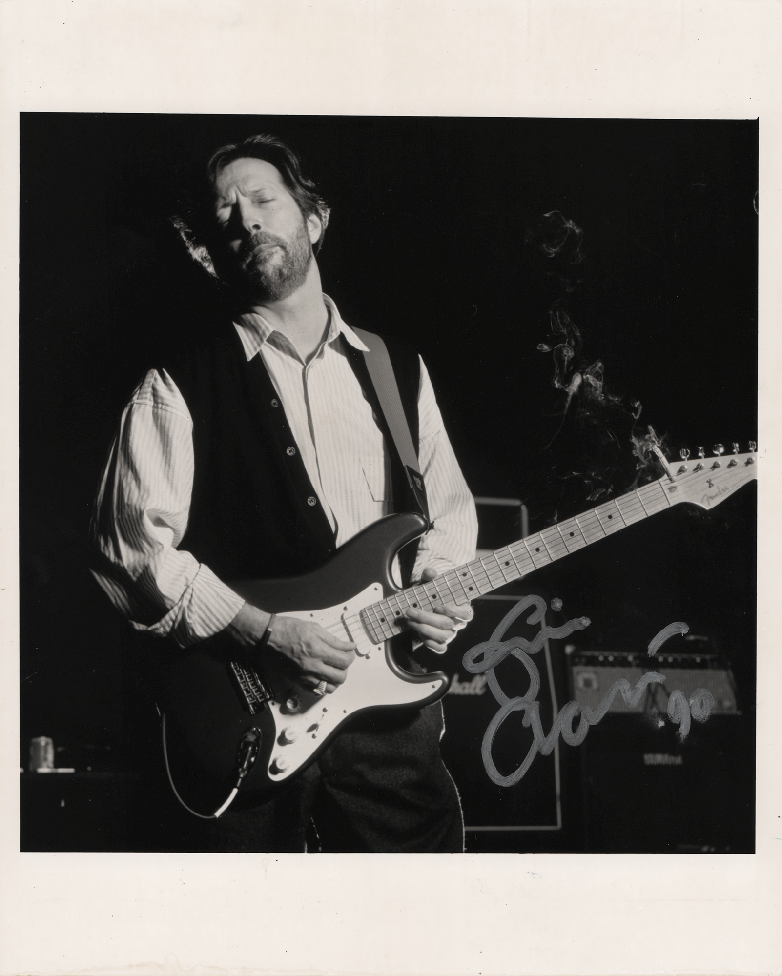 Satin-finish 8 x 10 photo of Eric Clapton with his eyes and playing a solo on 'Blackie,' his favorite Fender Stratocaster guitar, the head of which holds a smoking cigarette, signed in silver ink, “Eric Clapton, ‘90.” In very good to fine condition, with a few light surface creases.