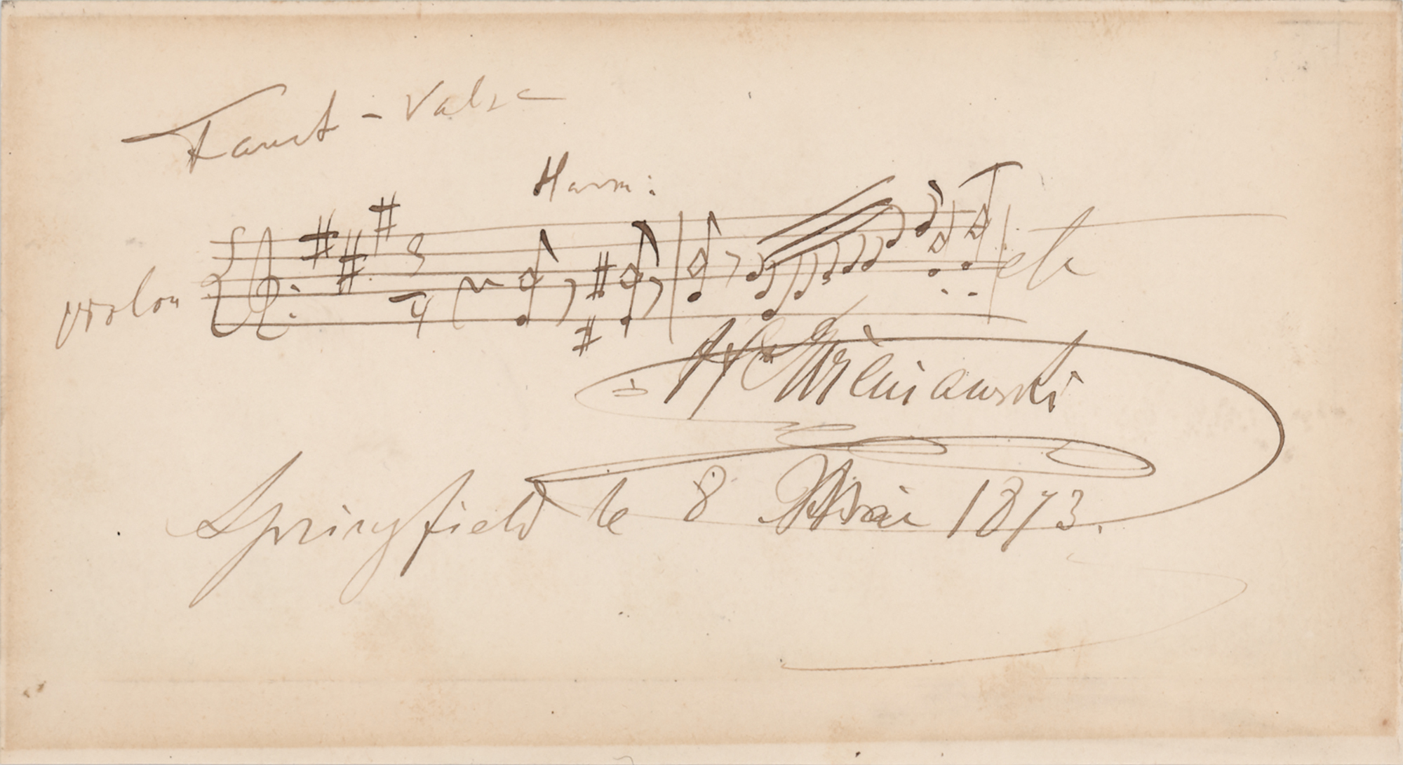 Polish violinist and composer (1835–1880) known for his technique in playing the 'devil's staccato.' AMQS on an off-white 5.25 x 3 album page, signed below in ink, "H. Wieniawski, Springfield le 8 Mai 1873." Wieniawski pens a few bars of music for violin. In fine condition, with light toning to the edges. Accompanied by a postcard portrait of the virtuoso.