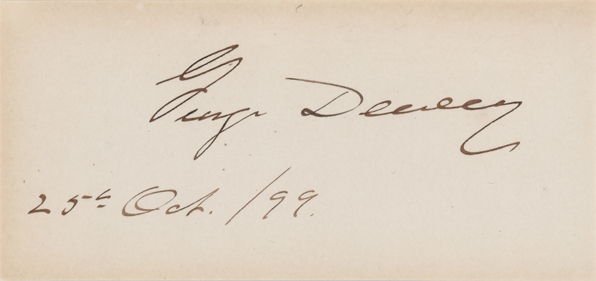 Admiral of the United States Navy (1837–1917) celebrated for his victory at the Battle of Manila Bay during the Spanish–American War. Vintage ink signature, "George Dewey, 25th Oct./99,” on an off-white 5 x 2.5 slip. In fine condition.