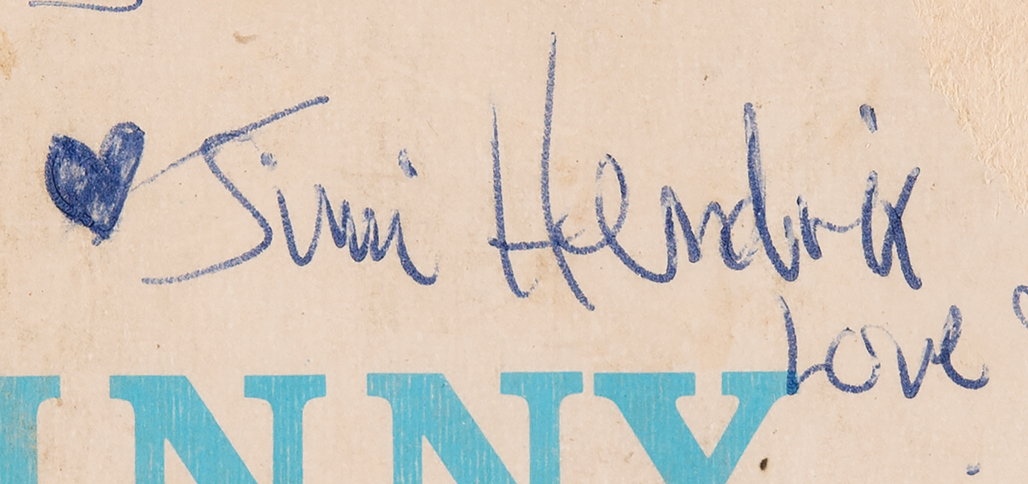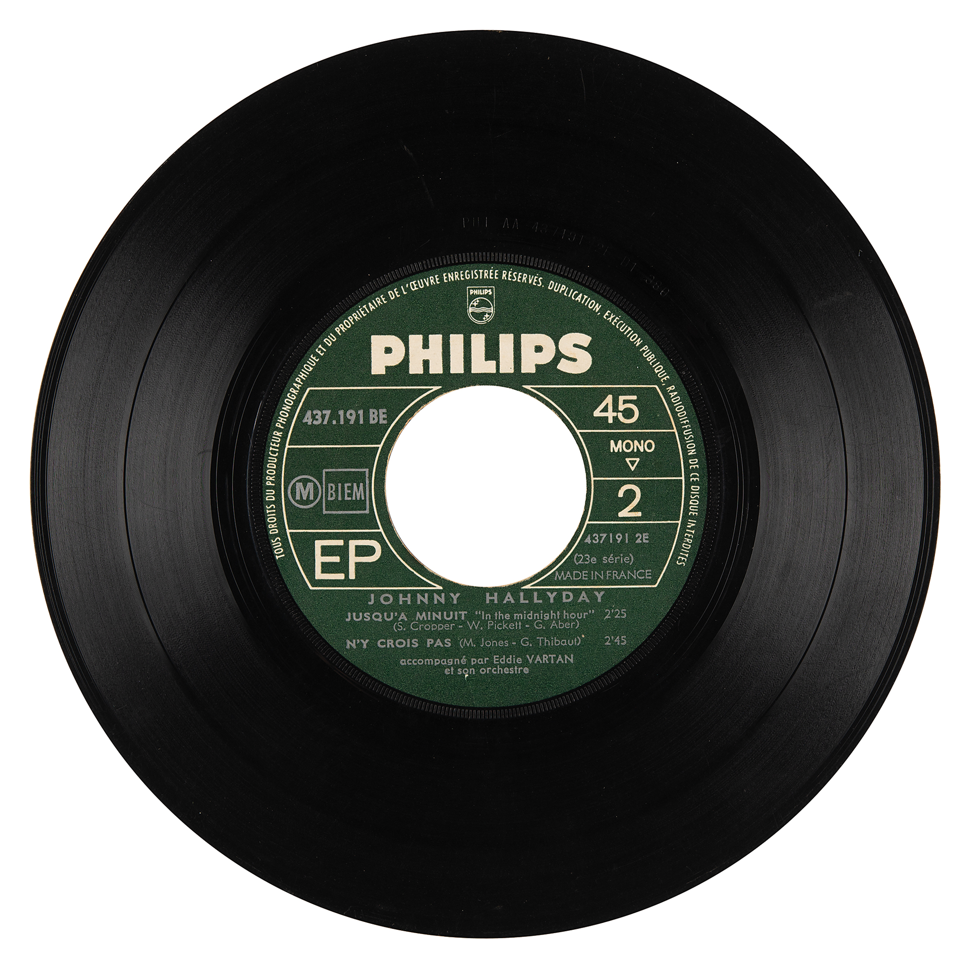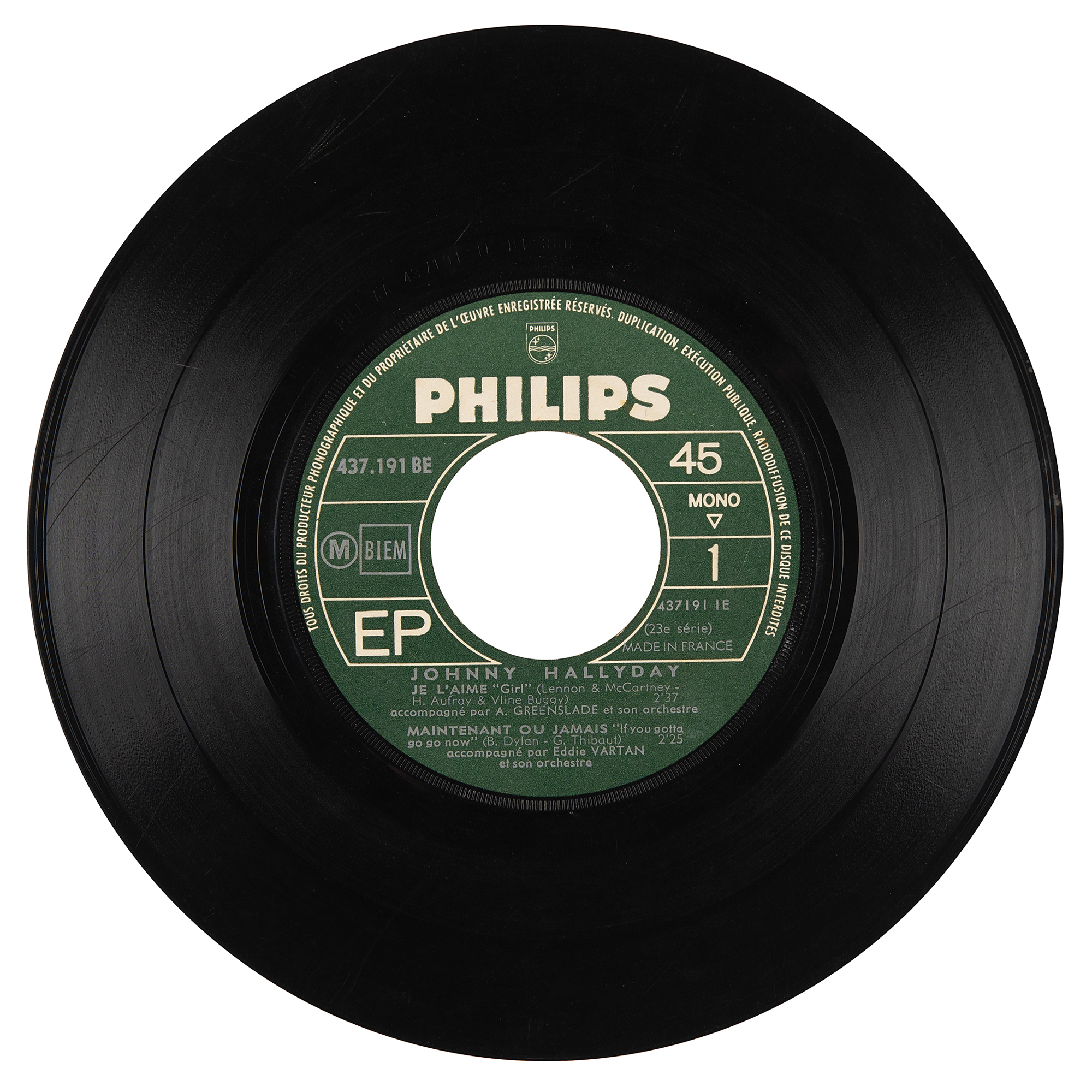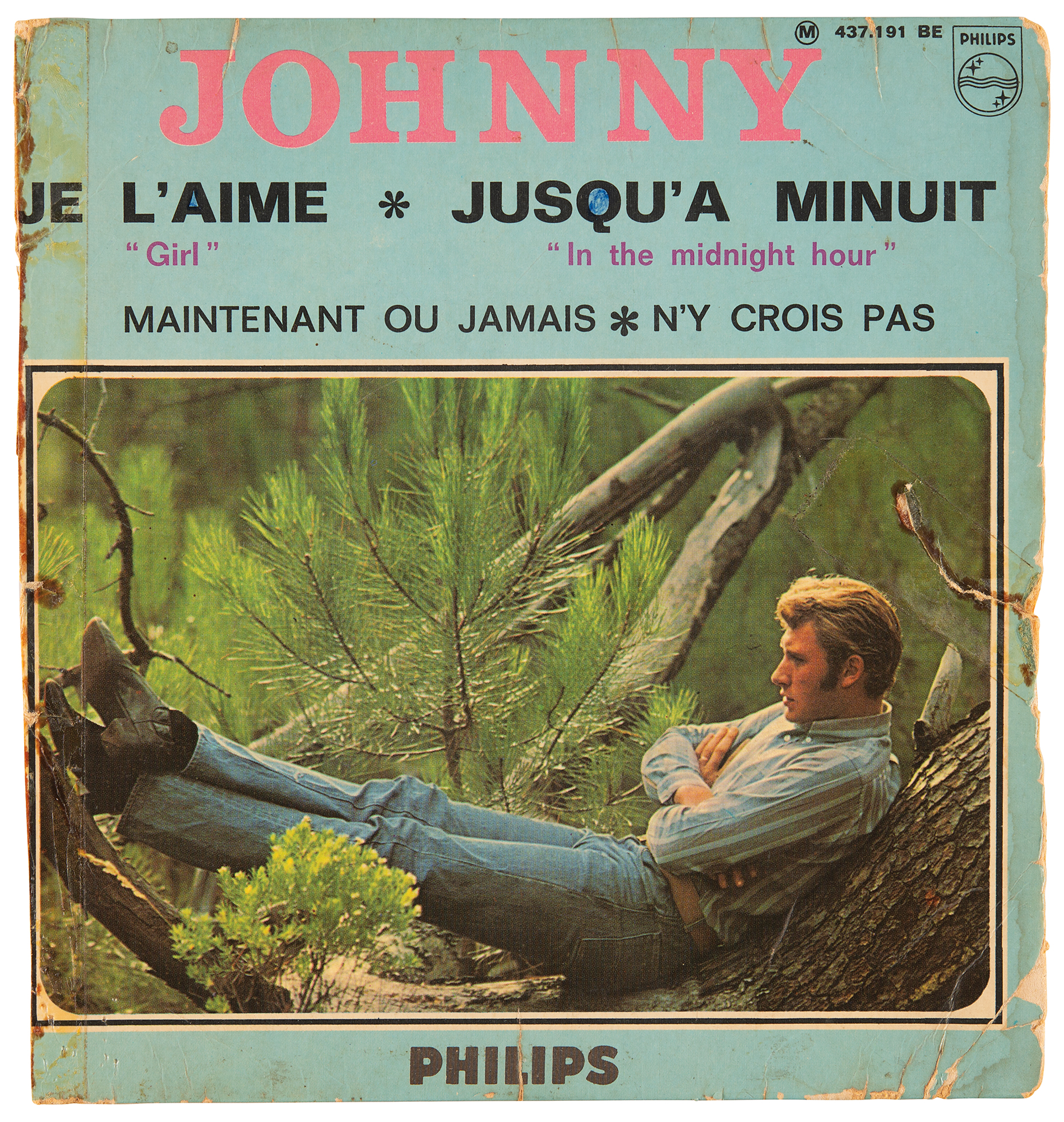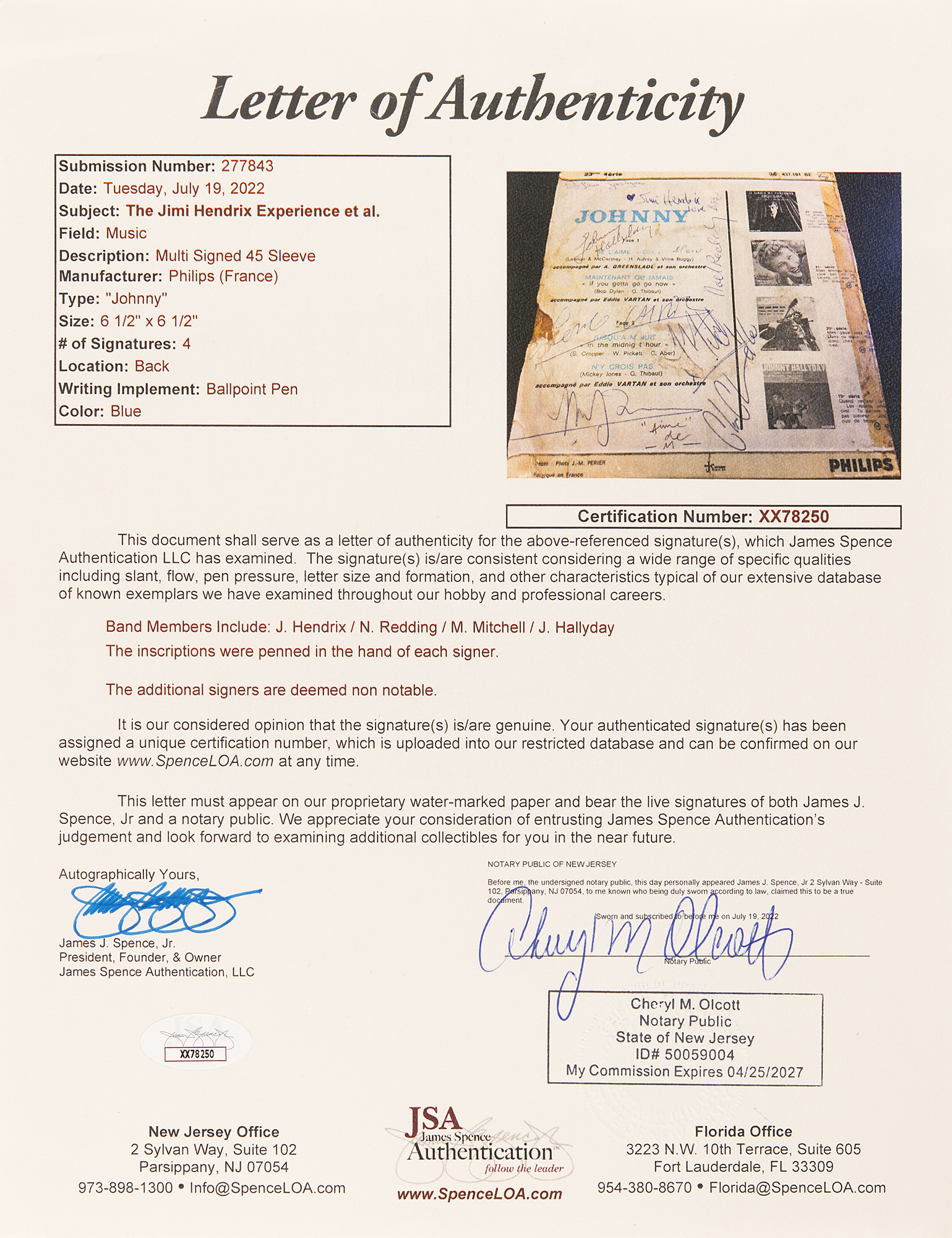 Extremely early ballpoint signatures of the Jimi Hendrix Experience—“Jimi Hendrix, Love,” who adds a heart, “Noel Redding, Bass,” and “Mitch [Mitchell]” — on the reverse of a 45 RPM record for the Johnny Hallyday EP ‘Je L'aime,’ which also features signatures from Experience manager Chas Chandler, Johnny Hallyday, and two of his band members, Long Chris and Micky Jones. The original recipient, Jocelynn, has added her name to the upper section. The consignor notes that the Hallyday signature was obtained decades later, on March 29, 2011. In very good condition, with soiling and staining, old tape to a tear and to the spine, and some edge and surface loss, none of which affects Hendrix's signature. Accompanied by a full letter of authenticity from JSA. The record is included.