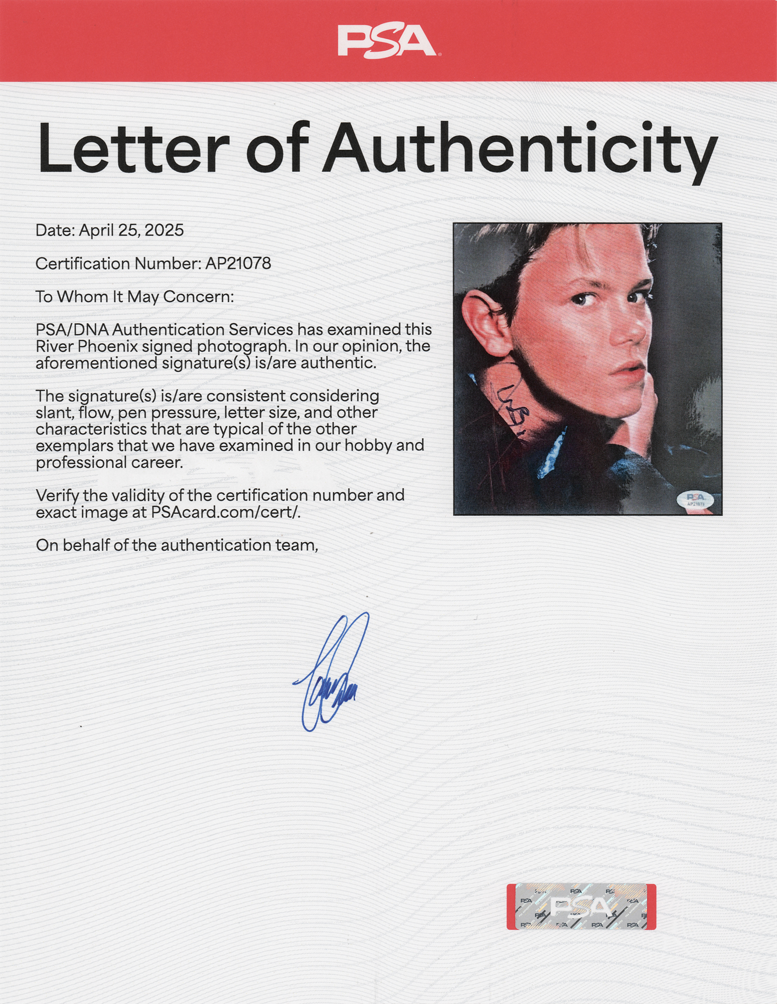 Color glossy 8 x 10 close-up photo of River Phoenix, signed in felt tip. In very fine condition, with poor contrast to Phoenix's last name, and a PSA label affixed to the lower right corner. Accompanied by a full letter of authenticity from PSA.