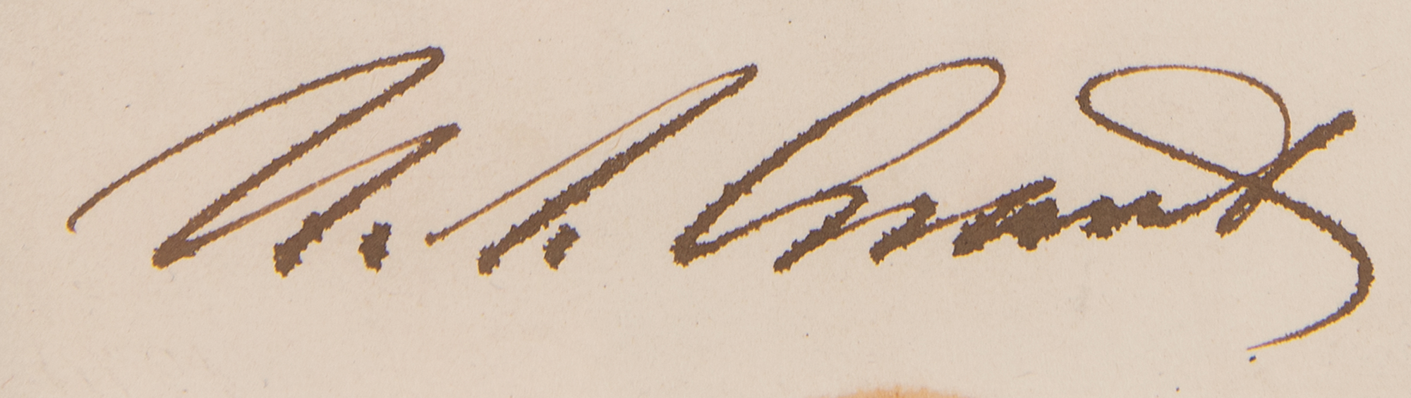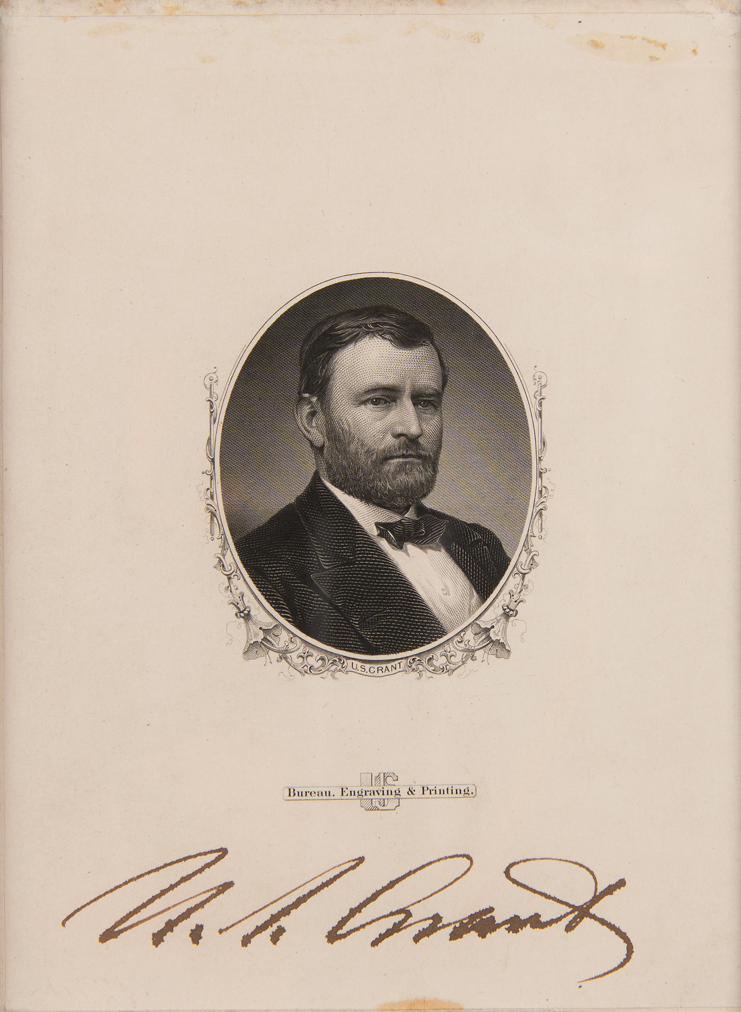 Handsome engraved portrait of U. S. Grant by the Bureau of Engraving and Printing, 4 x 5.5, prominently signed below in bold ink. Archivally matted and framed to an overall size of 6.25 x 8.25. In fine condition, with slight feathering to the ink, and a tiny stain to the bottom edge.