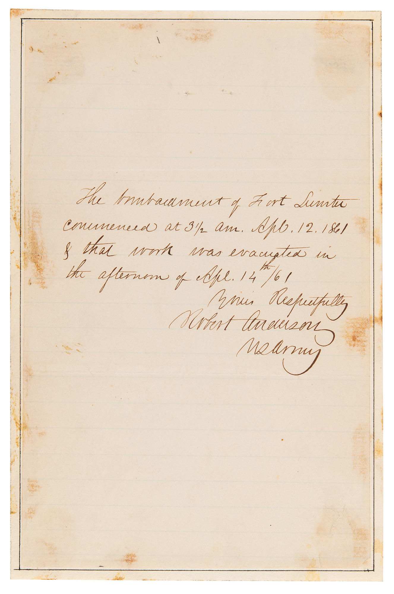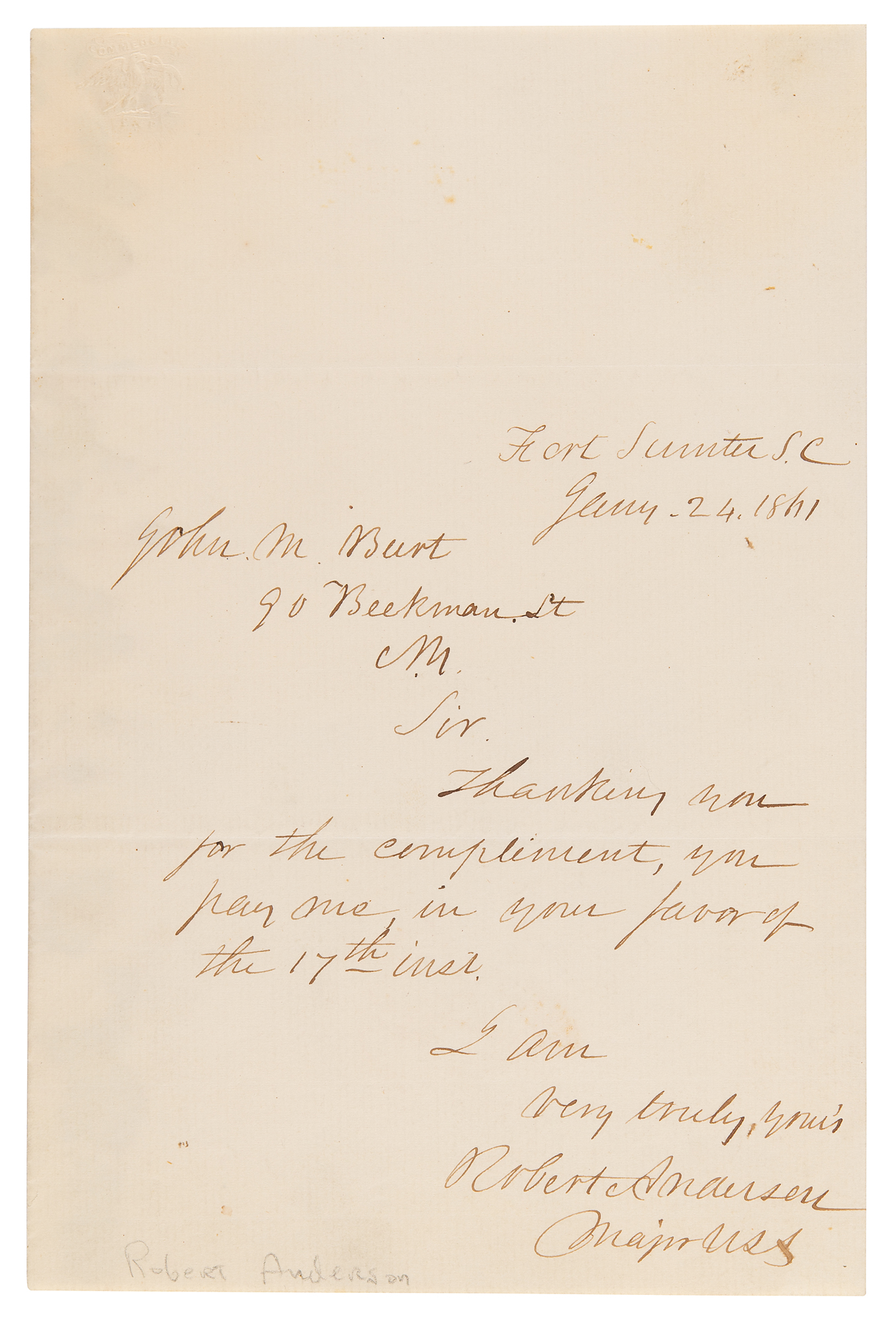 Union general (1805-1871) in command of Fort Sumter who refused a formal demand for his surrender, leading to the bombardment of the fort and start of the Civil War. Two items: AMS signed "Yours respectfully, Robert Anderson, US Army," one page, 4.75 x 7.25, offering remarks on the start of the Civil War, in full: "The bombardment of Fort Sumter commenced at 3 1/2 AM, Apl. 12, 1861 & that work was evacuated in the afternoon of Apl. 14th/61"; and an earlier ALS signed "Robert Anderson, Major, USA," one page, 5 x 7.5, Fort Sumter, South Carolina, January 24, 1861, in full: "Thanking you for the compliment, you pay me in your favor of the 17th inst." In very good to fine condition, with staining to the edges of both pieces, heavier to the Sumter statement.