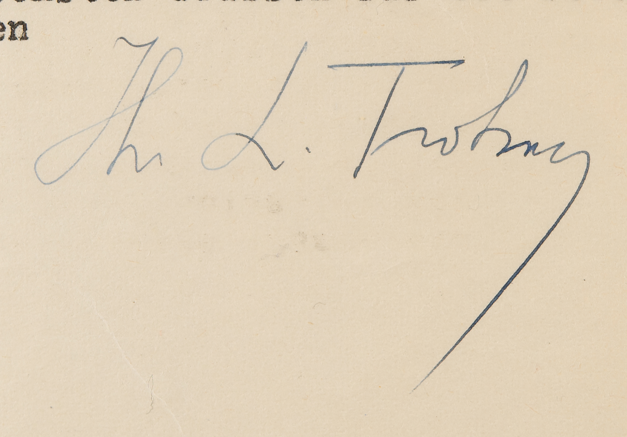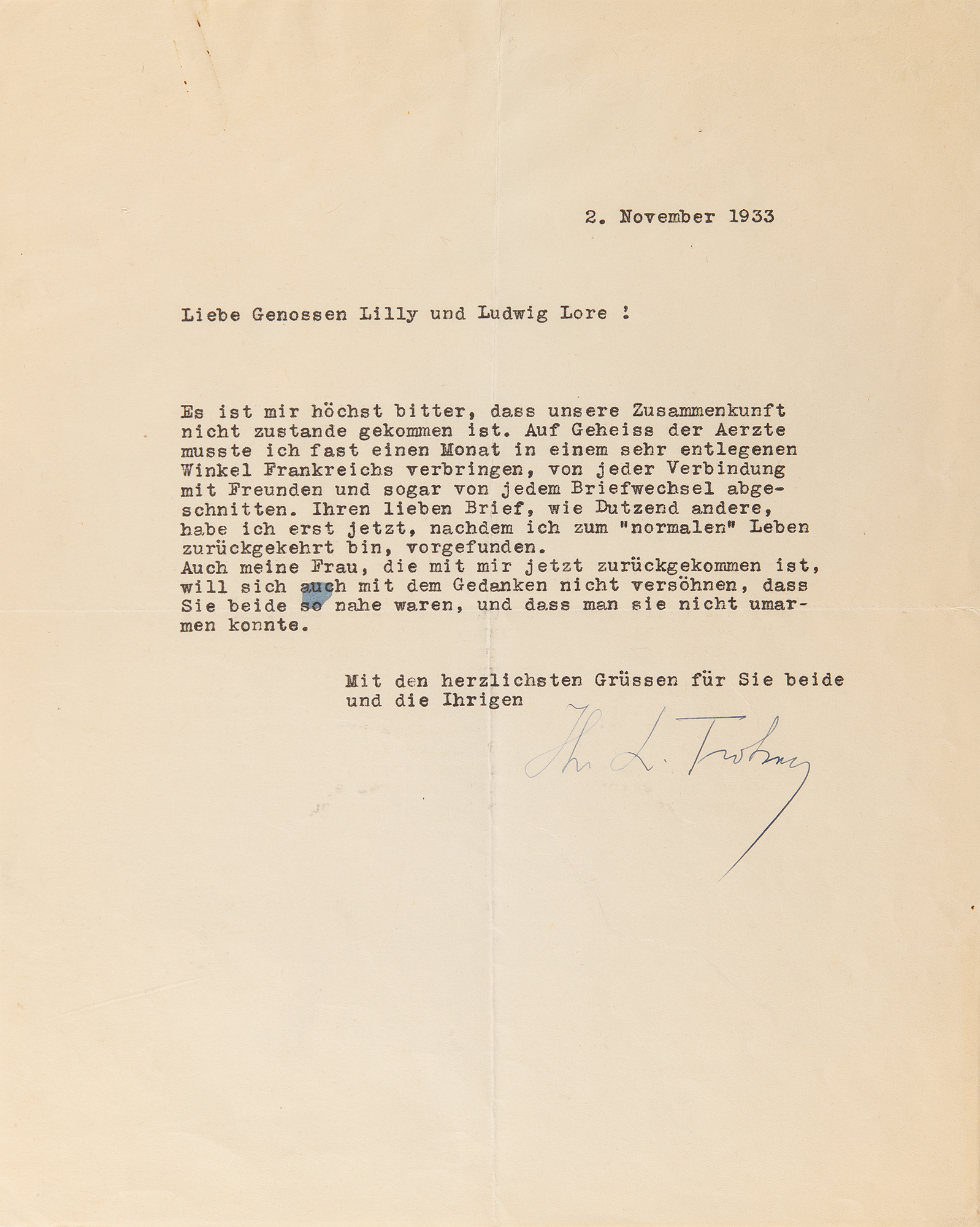 TLS in German, signed “Ihr L. Trotsky,” one page, 8.25 x 10.75, November 2, 1933. Letter to Lilly and Ludwig Lore, regretting that illness prevents his visiting them. In part (translated): "I am deeply bitter that our meeting never took place. At the doctors' orders, I had to spend almost a month in his very remote corner of France, cut off from all contact with friends and even from any correspondence. I have only now found your dear letter, like dozens of others, after returning to 'normal' life." In fine condition, with some light wrinkling and a rusty paperclip impression.