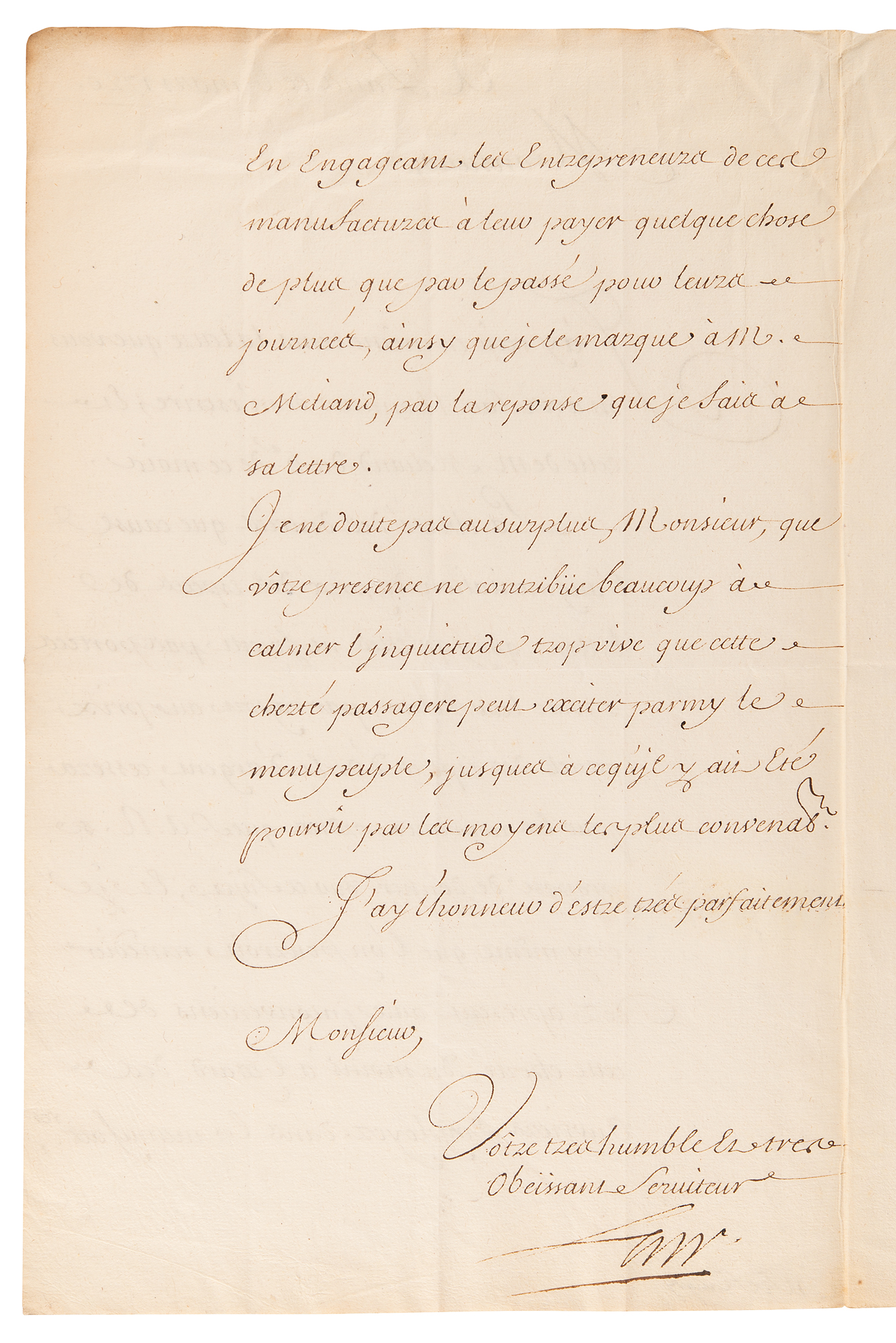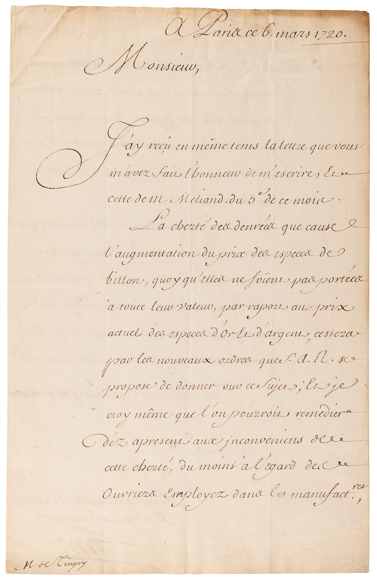 Scottish economist (1671–1729) known as a monetary reformer and as the originator of the 'Mississippi scheme' for the development of French territories in America. LS in French, signed “Law,” one page both sides, 8 x 12.5, March 6, 1720. Letter to Christian-Louis de Montmorency-Luxembourg, Prince of Tingry, written during the last months of Law's financial system. In part (translated): "The high price of goods, caused by the increase in the value of base-metal currency, even though they are not yet exchanged at their full value compared to the current price of gold and silver coins, will cease once His Royal Highness issues new orders on the matter. I even believe that the negative effects of this inflation can be remedied immediately, at least concerning the workers employed in the manufactories, by encouraging the factory owners to pay them slightly higher wages than before for their daily work." He expresses confidence that the prince's presence will "greatly contribute to calming the excessive anxiety that this temporary inflation may provoke among the common people." In very good to fine condition, with creasing and light toning to the top.