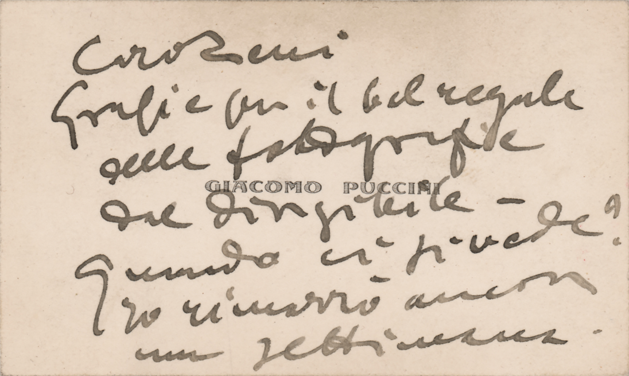 ANS in Italian, signed "G. Puccini," penned on both sides of one of his personal calling cards, 3.5 x 2, imprinted with his name in block letters, "Giacomo Puccini," January 26, 1919. Puccini writes to Franco Zeni, "Caro Zeni," in Rome, thanking him for the beautiful photographs. Puccini proposes a meeting with a friend (translated): "Thank you for the lovely gift of the photographs of the airship. When shall we meet? I will stay for another week. We can arrange something with Adami, who I believe will return on Wednesday." In fine condition. Accompanied by the original mailing envelope, addressed in Puccini's hand.