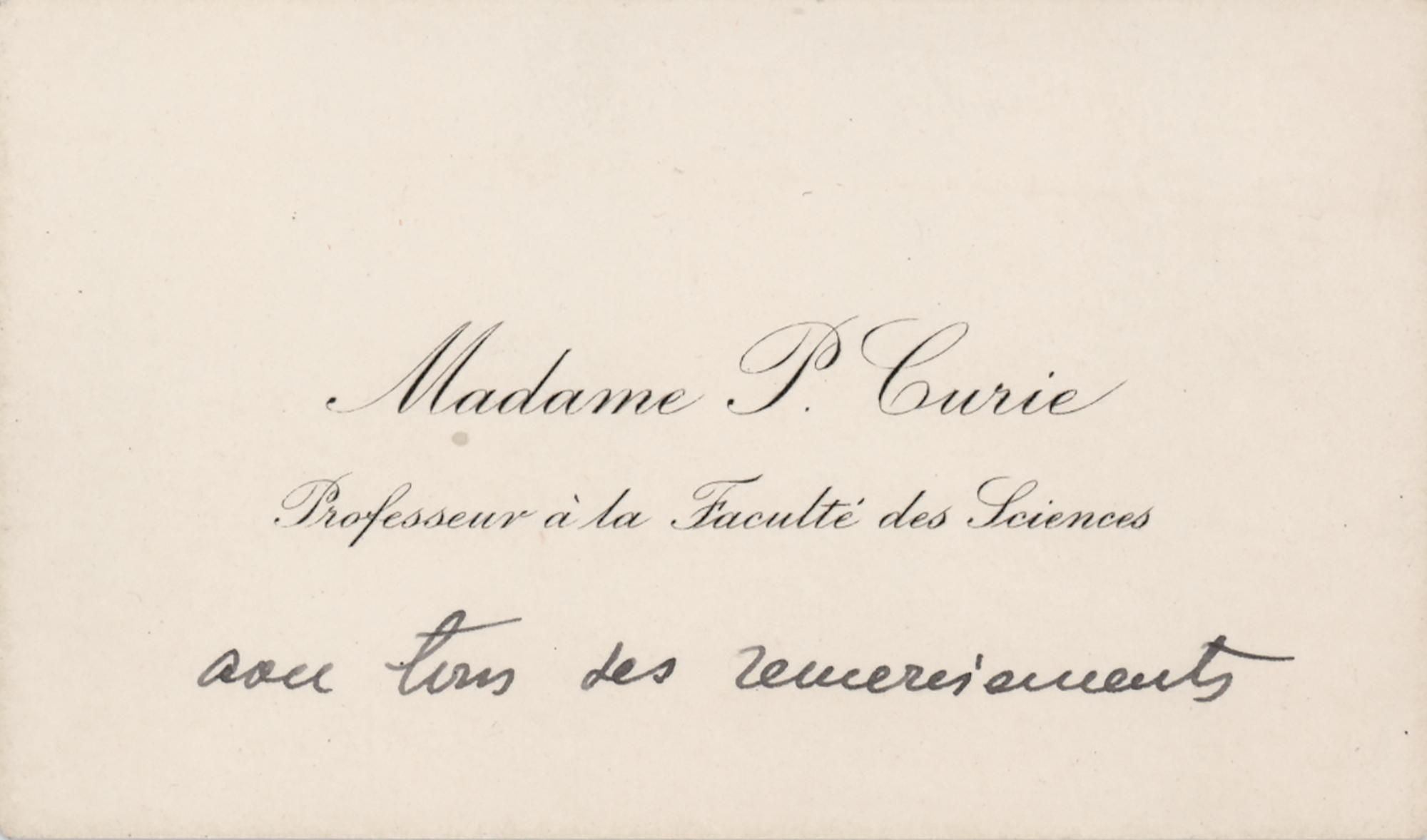 Polish-born French physicist (1867–1934), she and her husband Pierre discovered two new elements, polonium and radium, in 1898. In 1911 she won the Nobel Prize for Chemistry. She died of leukemia brought about by her work with radioactive material. Marie Curie's personal calling card, 3.5 x 2, elegantly engraved with her name in a simple, cursive script: "Madame P. Curie, Professeur a la Faculté des Sciences," with holograph addition below, "avec tous ses remerciements." In very fine condition.