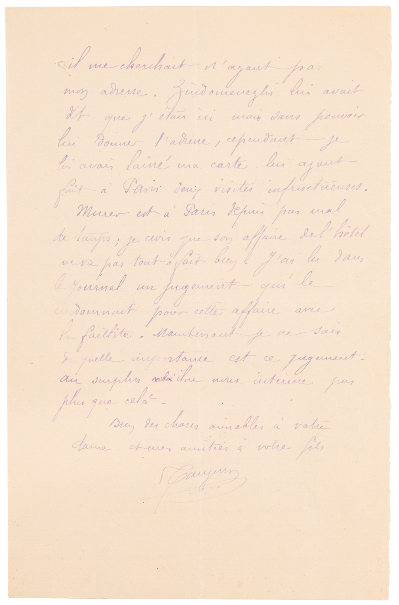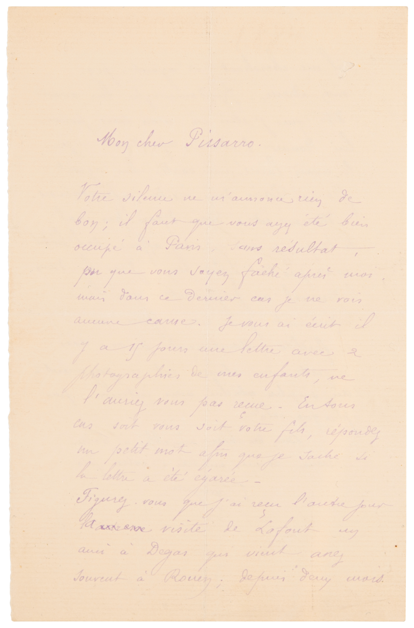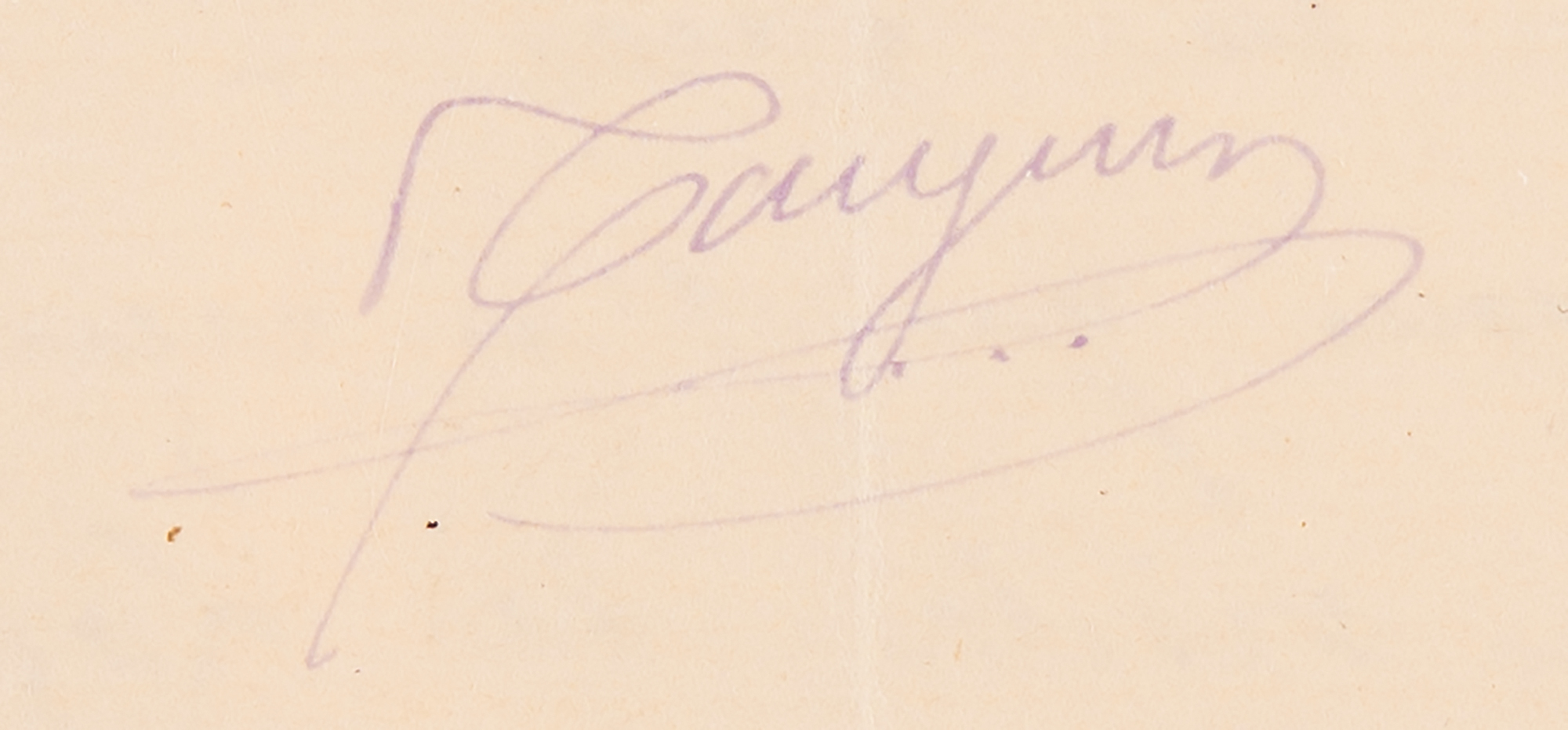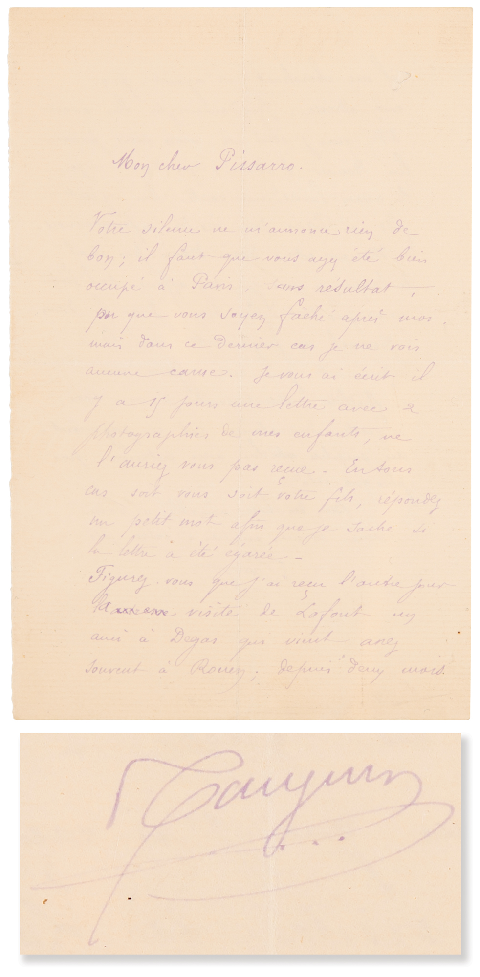 ALS in French, signed “Gauguin,” one page both sides, 4.5 x 7, no date but circa August 1884. Handwritten letter to his friend and mentor, the fellow painter Camille Pissarro, written from Rouen, referring to several members of their artistic circle. Gauguin worries that he has heard nothing from his friend, and fears that he is angry with him; but he may not have received his letter of a fortnight ago "with 2 photographs of my children." He received a visit from Paul Lafond, "a friend of Degas who comes to Rouen quite often; he has been looking for me for two months." As for Eugène Murer, a self-taught painter and collector of the impressionists: "He has been in Paris for quite some time; I believe his hotel business is not going very well. I read in the newspaper a judgment that condemned him for this business with bankruptcy. Now I do not know how important this judgment is." In fine condition. A scarce handwritten letter by the celebrated painter, with several artistic associations.