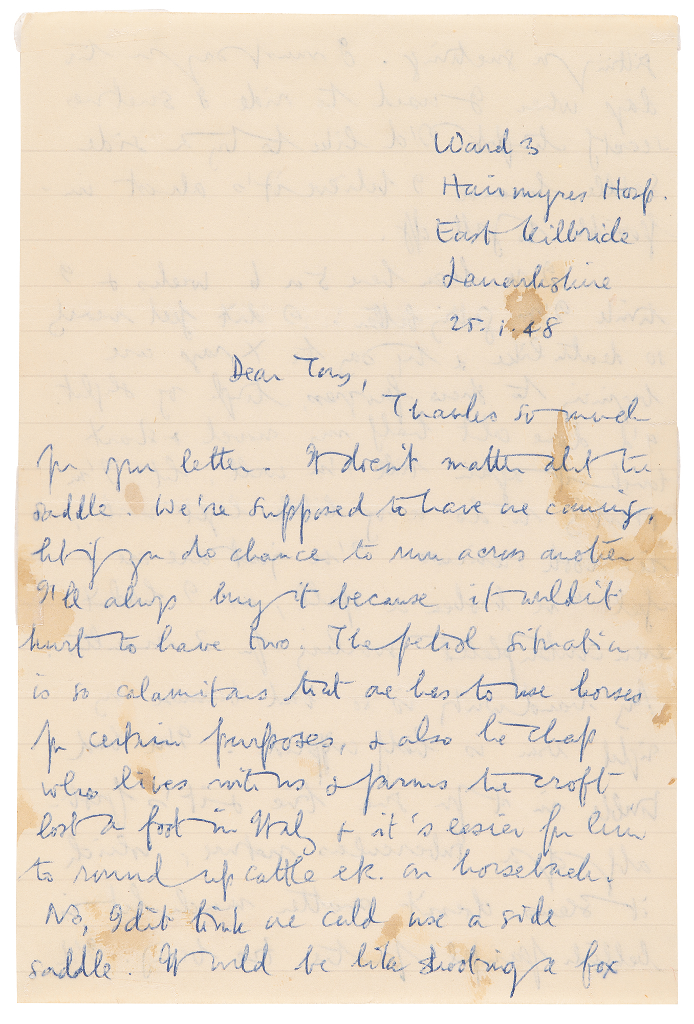 ALS signed “George,” two pages both sides, 4.75 x 7.25, January 25, 1948. Handwritten letter to novelist Anthony Powell, written while recovering from a diagnosis of tuberculosis at Hairmyres Hospital. In part: "Thanks so much for your letter. It doesn't matter about the saddle. We're supposed to have one coming…The petrol situation is so calamitous that one has to use horses for certain purposes…No, I don't think we would use a side saddle. It would be like shooting a fox sitting on something. I must say in the days when I used to ride I sometimes secretly thought I'd like to try a side saddle, because I believe it's almost impossible to fall off.