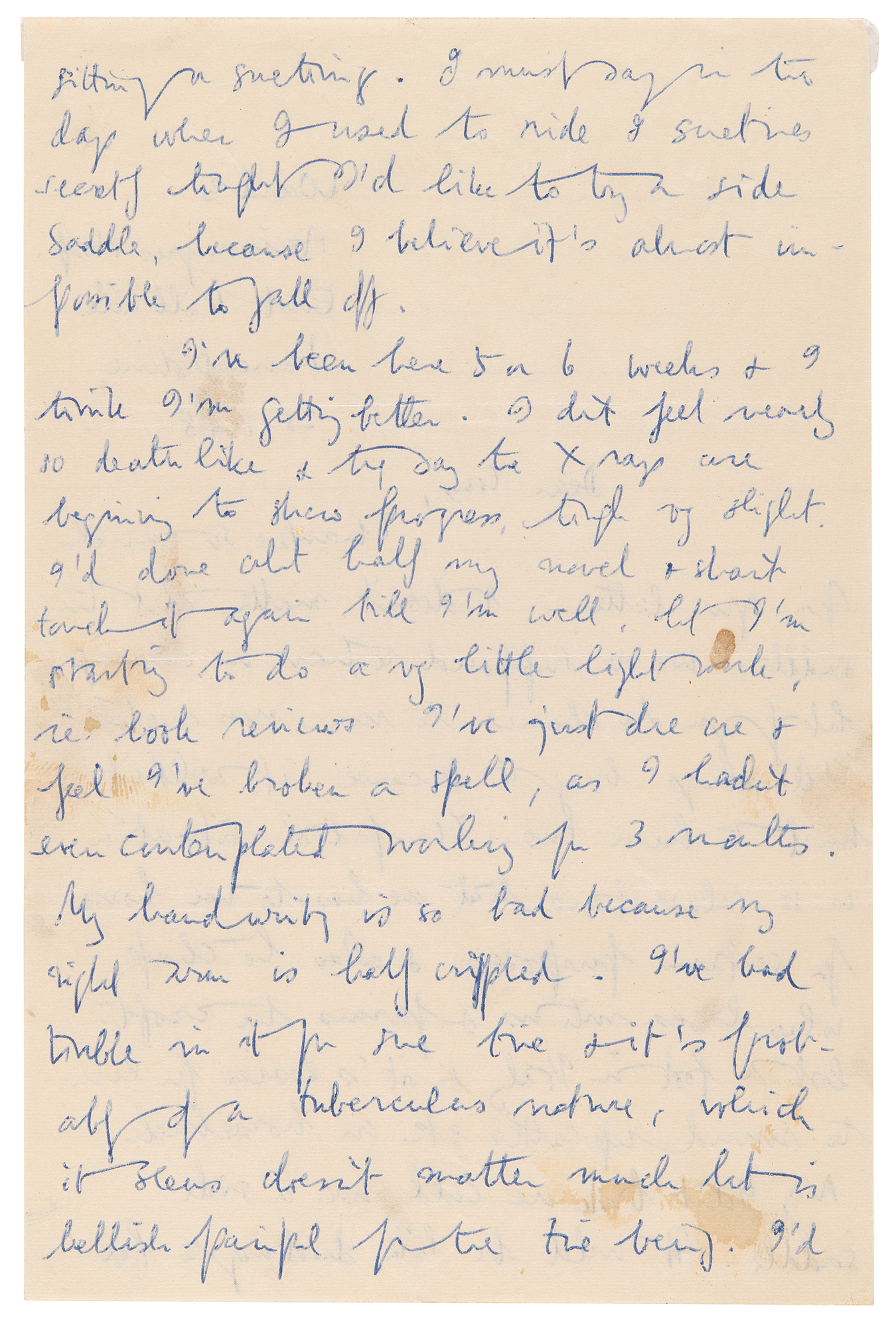 I've been here for 6 weeks & I think I'm getting better. I don't feel nearly so deathlike & by day the X rays are beginning to show progress, though very slight. I'd done about half my novel & shan't touch it again till I'm well, but I'm starting to do a very little light work, i.e. book reviews. I've just done one & feel I've broken a spell, as I hadn't even contemplated working for 3 months. My handwriting is so bad because my right arm is badly crippled…it's probably of a tubercles nature…I'd like to do something for the TLS, but if I do it'll have to be handwritten, because even if I had a typewriter here I can't at present get my hand into that position. Did I tell you I was starting a uniform edition, as everyone seems to be doing…I am starting off with the one called 'Coming Up for Air' which was published in 1939.