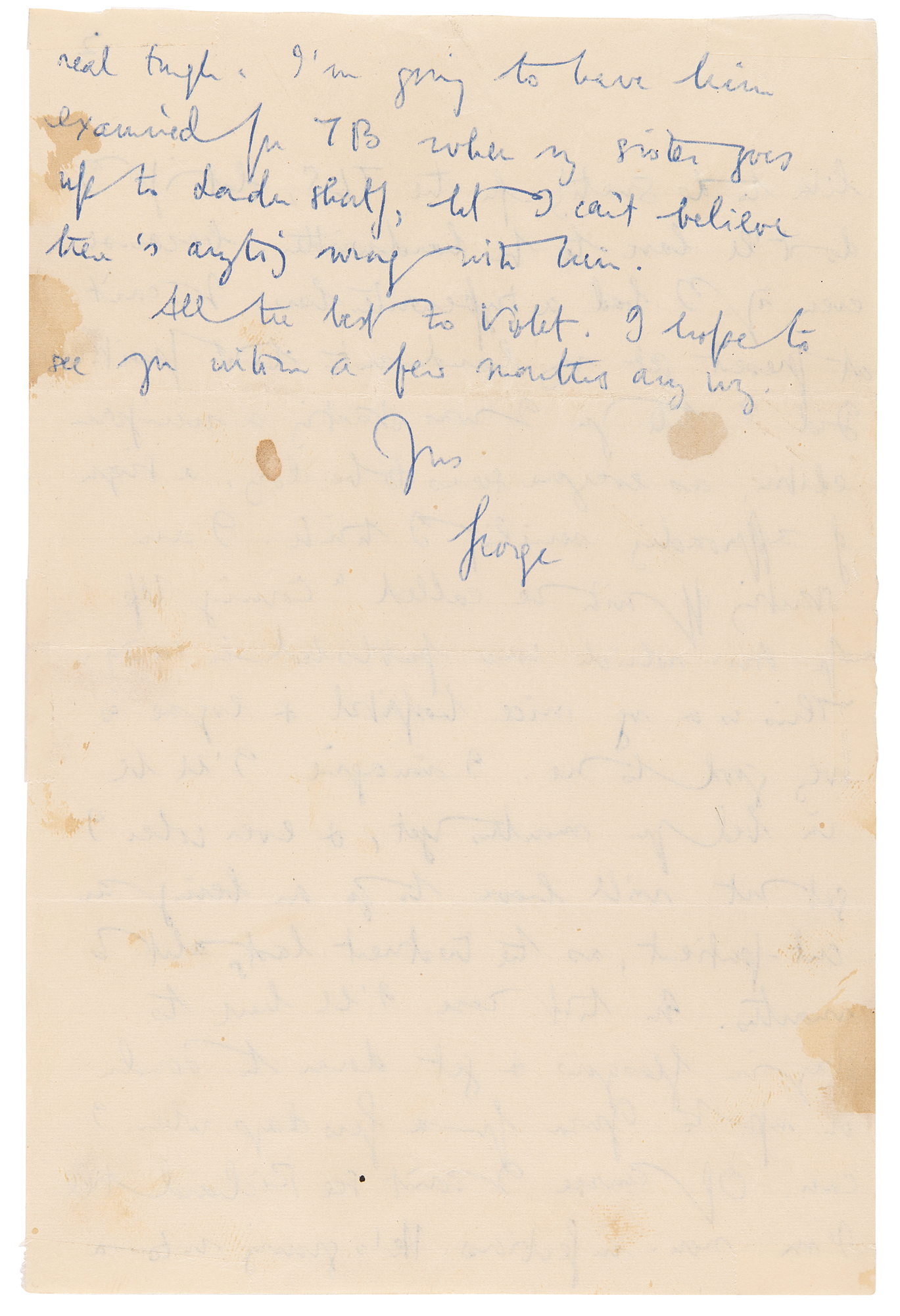 This is a very nice hospital & everyone is very good to me. I imagine I'll be in bed for months yet, & even when I get out will have to go on being an out-patient, as the treatment lasts about 6 months. In that case I'll have to stay in Glasgow & get down to London or up to Jura for a few days when I can. Of course I can't see Richard till I'm non-infectious…I'm going to have him examined for TB when my sister goes up to London shortly, but I can't believe there's anything wrong with him." In very good to fine condition, with scattered staining.