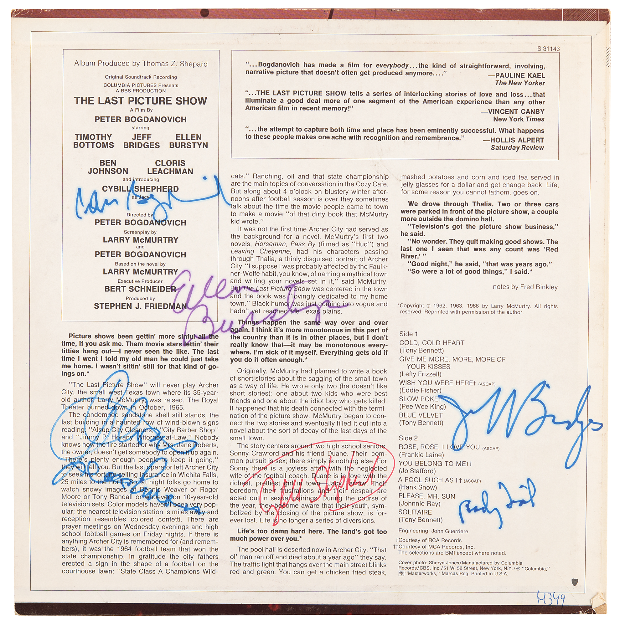 The Last Picture Show soundtrack album, signed on the back cover in various colored felt tip by Jeff Bridges, Cybill Shepherd, Cloris Leachman, Ellen Burstyn, Randy Quaid, and Peter Bogdanovich. In fine condition, with slight haloing to the signatures. The record is included.