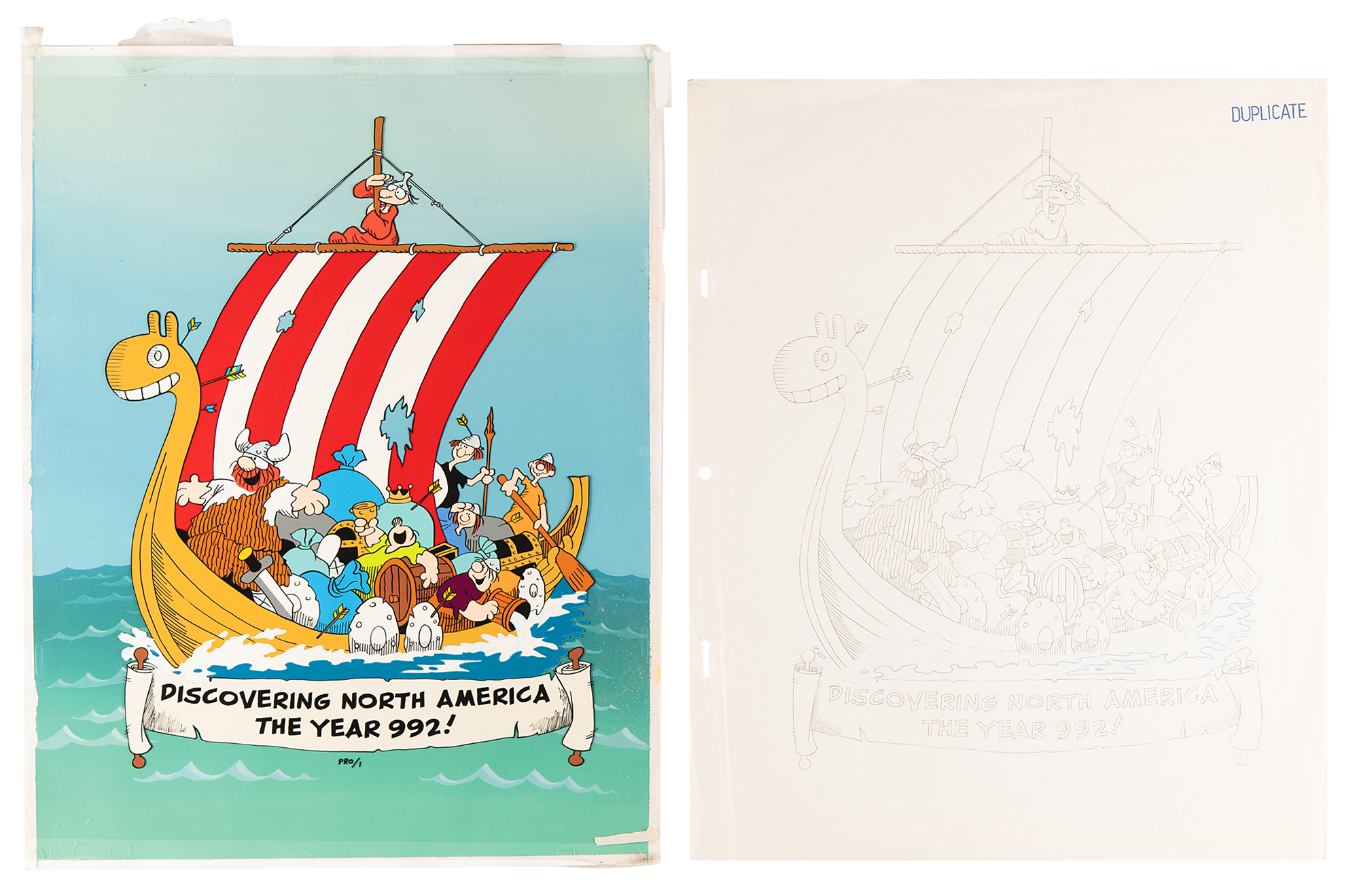 (King Features) Vibrant key master background prototype set-up for a limited edition Hägar the Horrible cel, consisting of its colorful hand-painted 16-field color model cel, its original matching hand-painted production background, and its original matching production drawing. The color model cel, which is numbered “Pro/1” as being a prototype, shows Hägar and several of his crewmen sailing on a Viking ship, with a scroll to the lower section reading, “Discovering North America, The Year 992!” The total character image measures 10.25 x 13.25, with overall dimensions of 13.5 x 17.25. The drawing, stamped “Duplicate,” is accomplished in graphite and colored pencil on untrimmed 13.5 x 16.5 animation paper. In overall fine condition, with some creasing to the drawing.