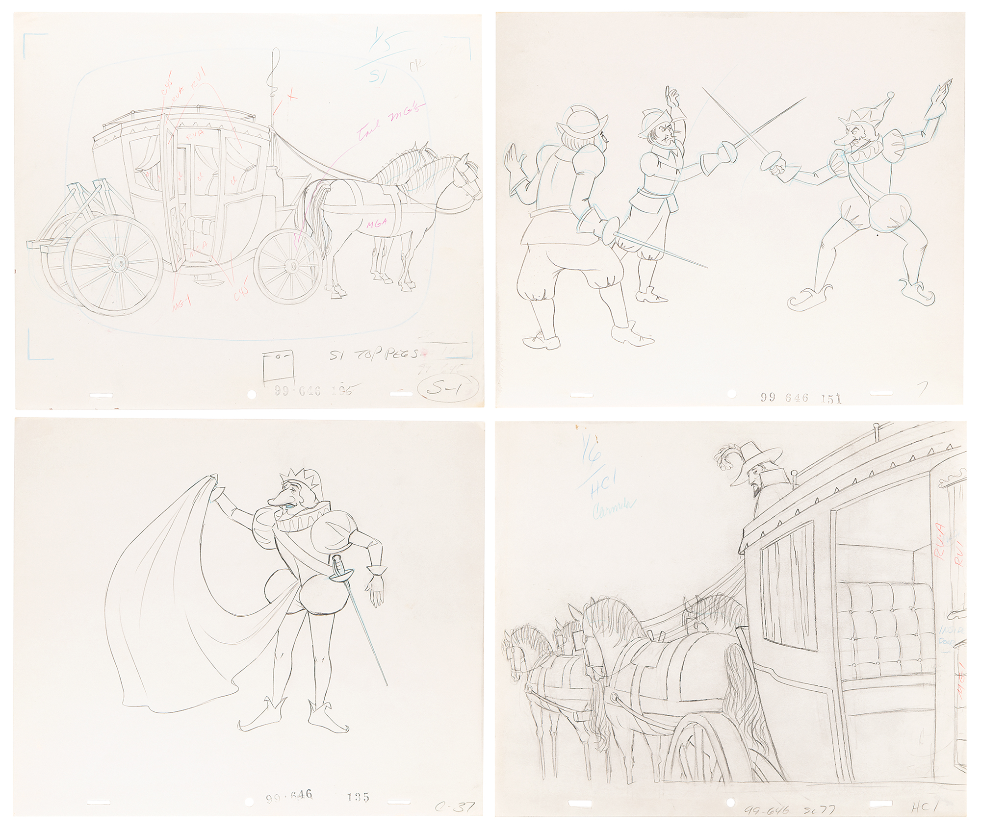 (Hanna-Barbera Studios, 1974) Grouping of seven original hand-painted 12-field production cels from the ABC after-school special Cyrano, four of which include their original matching production drawings, and two include their original hand-painted key master backgrounds; four of the cels are placed on color copy background prints. The seven hand-painted scenes include a total of 17 cels, with backgrounds ranging in size from 13.25 x 10.5 to 14 x 11. The four drawings are accomplished in graphite and colored pencil on untrimmed 12.5 x 10.5 sheets of animation paper. In overall fine condition.