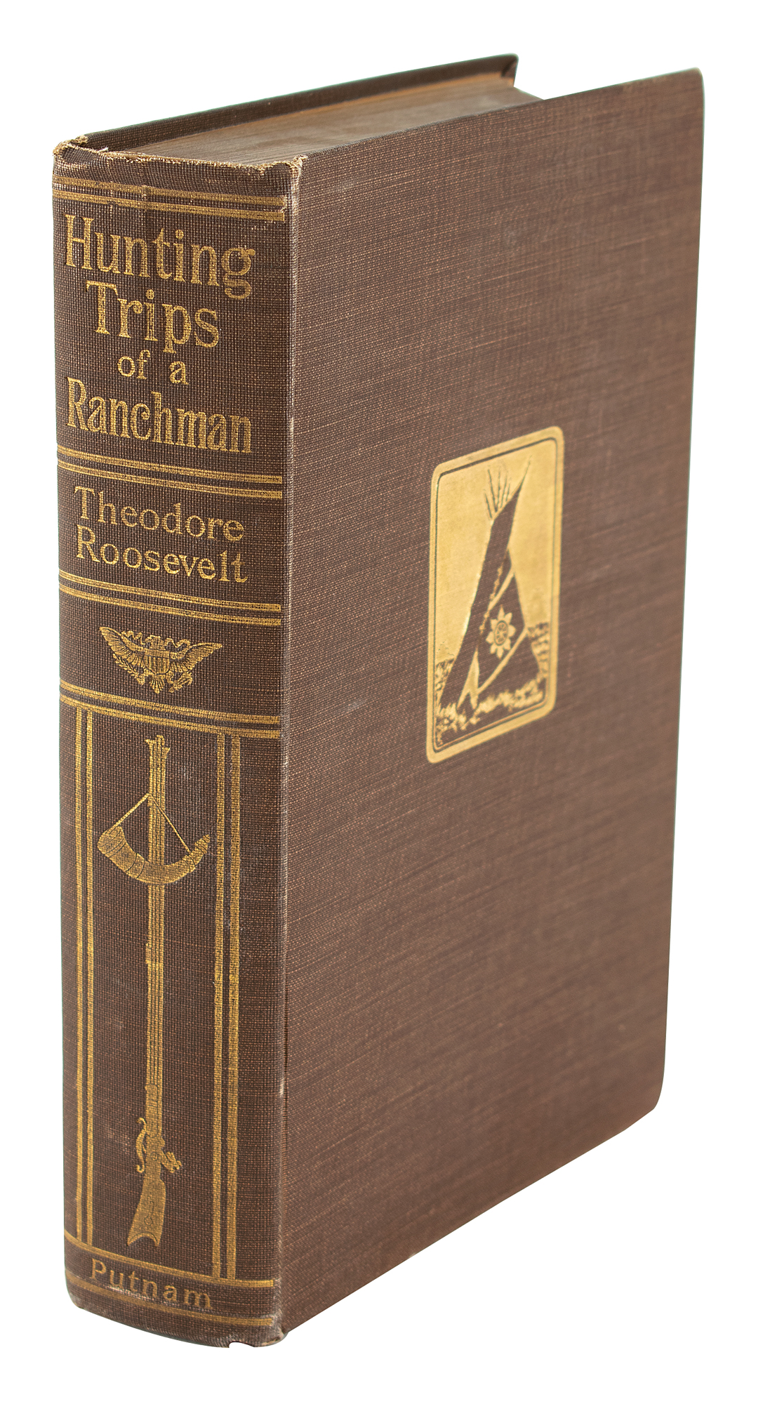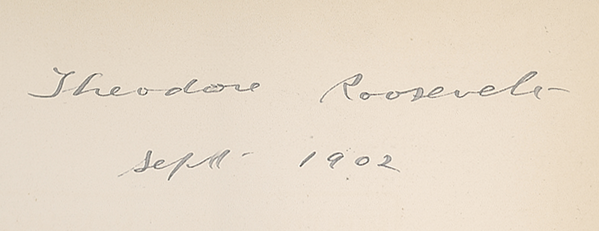 Signed book: Hunting Trips of a Ranchman. Special 'Alleghany Edition.' NY: G. P. Putnam's Sons/Knickerbocker Press, 1902. Hardcover bound in brown cloth with gilt stamping and design, 6.75 x 9.75, 328 pages. Signed on the first free end page in ink, "Theodore Roosevelt, Sept. 1902." Autographic condition: fine. Book condition: VG/None, with minor rubbing to joints, wear at spine ends, and a "Library of Lawrence E. Miller" blindstamp to the last page.