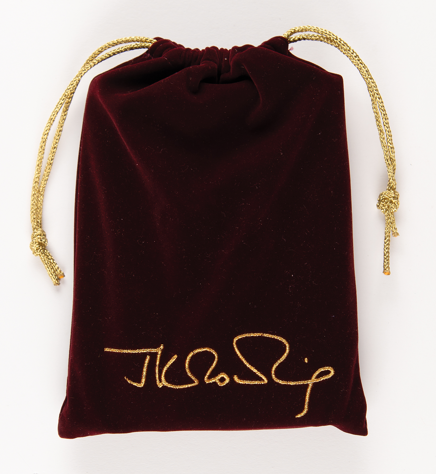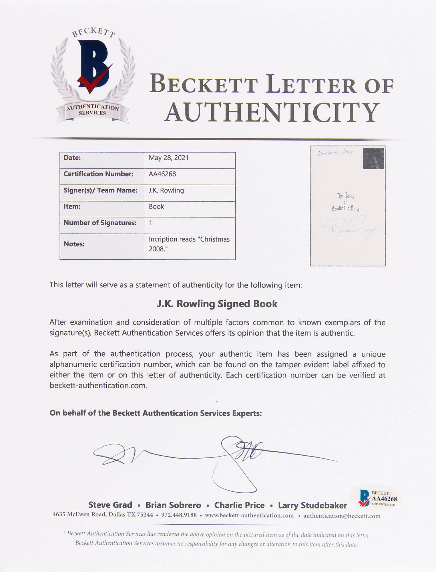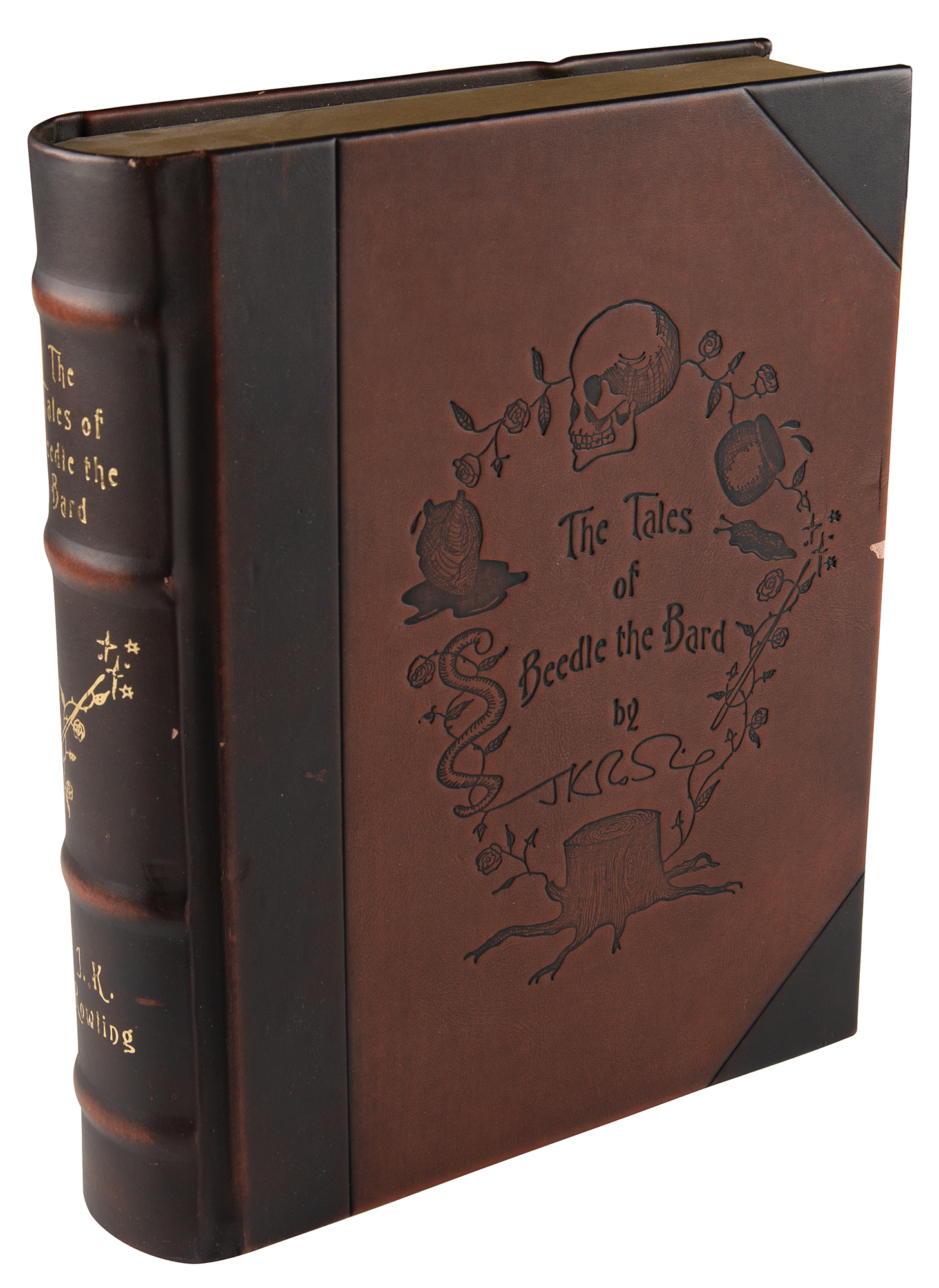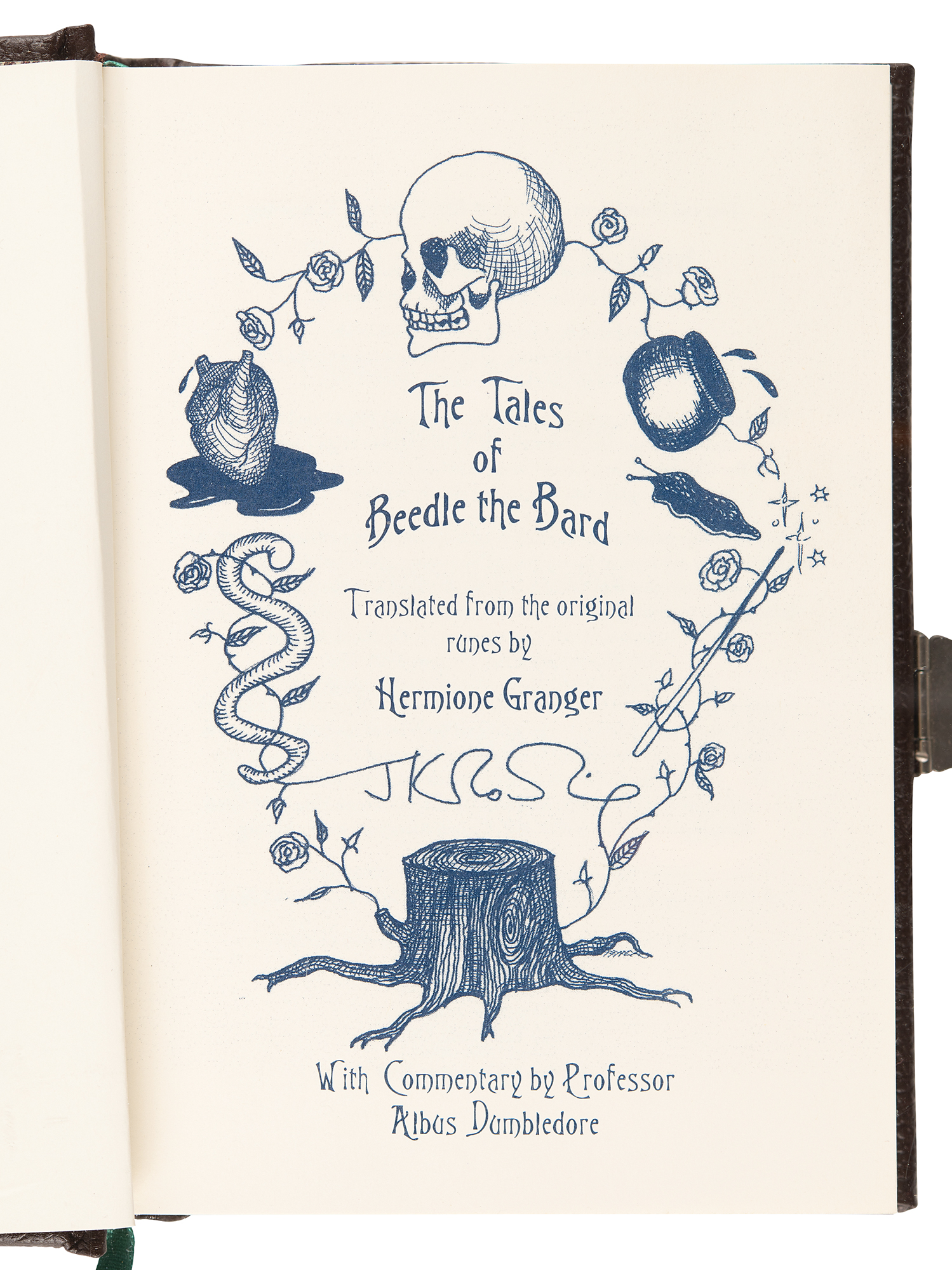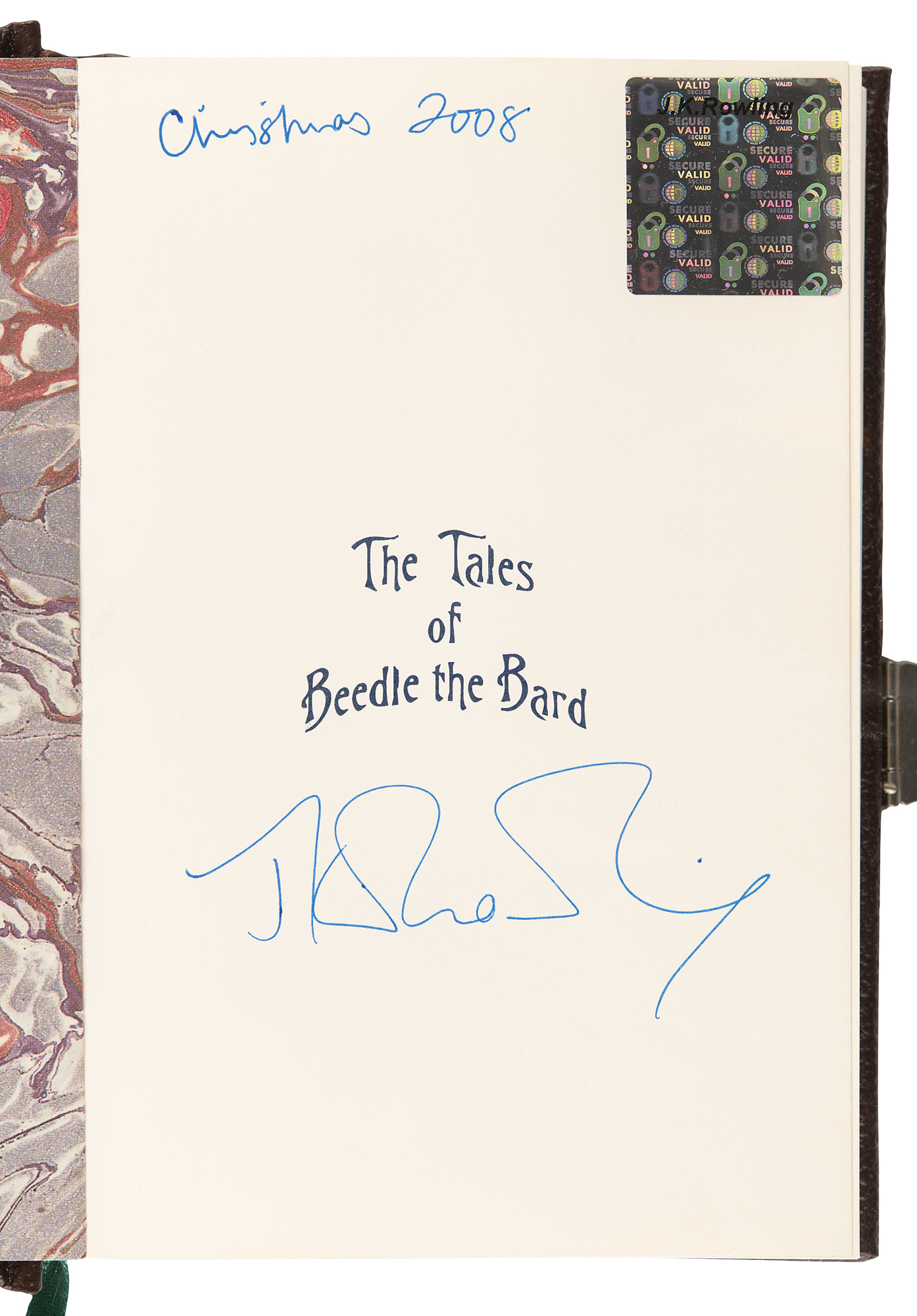 Signed book: The Tales of Beedle the Bard. Deluxe collector's edition. London: Children's High Level Group, 2008. Ornately embellished hardcover, 4.75 x 6.75, 179 pages. Beautifully signed on the half-title page in blue ink, "J. K. Rowling," who adds above, “Christmas 2008.” Complete with its beautiful embroidered velvet bag, illustration prints, and large leather-bound clamshell case with cardstock slipcover. Autographic condition: very fine. Book condition: NF/None in a VG slipcase, with edgewear and a few surface scuffs and dings to the case. Accompanied by a full letter of authenticity from Beckett Authentication Services.
