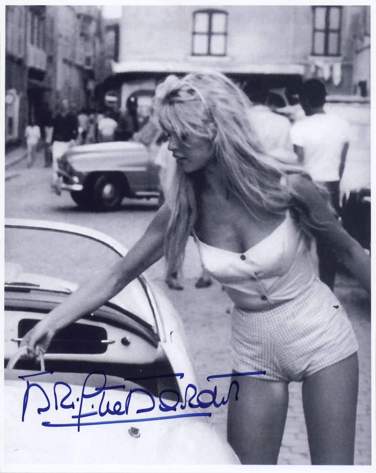Glossy 8 x 10 photo of the youthful Brigitte Bardot beside a Porsche in St. Tropez, boldly signed in blue felt tip. In fine condition, with a slightly grainy quality to the image.
