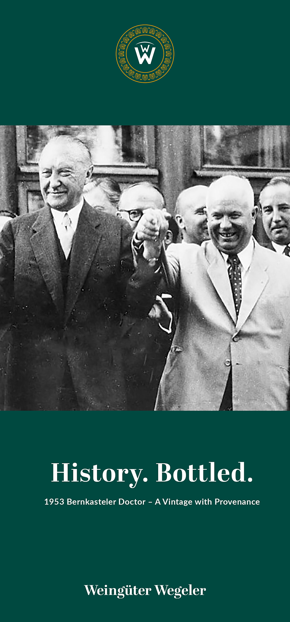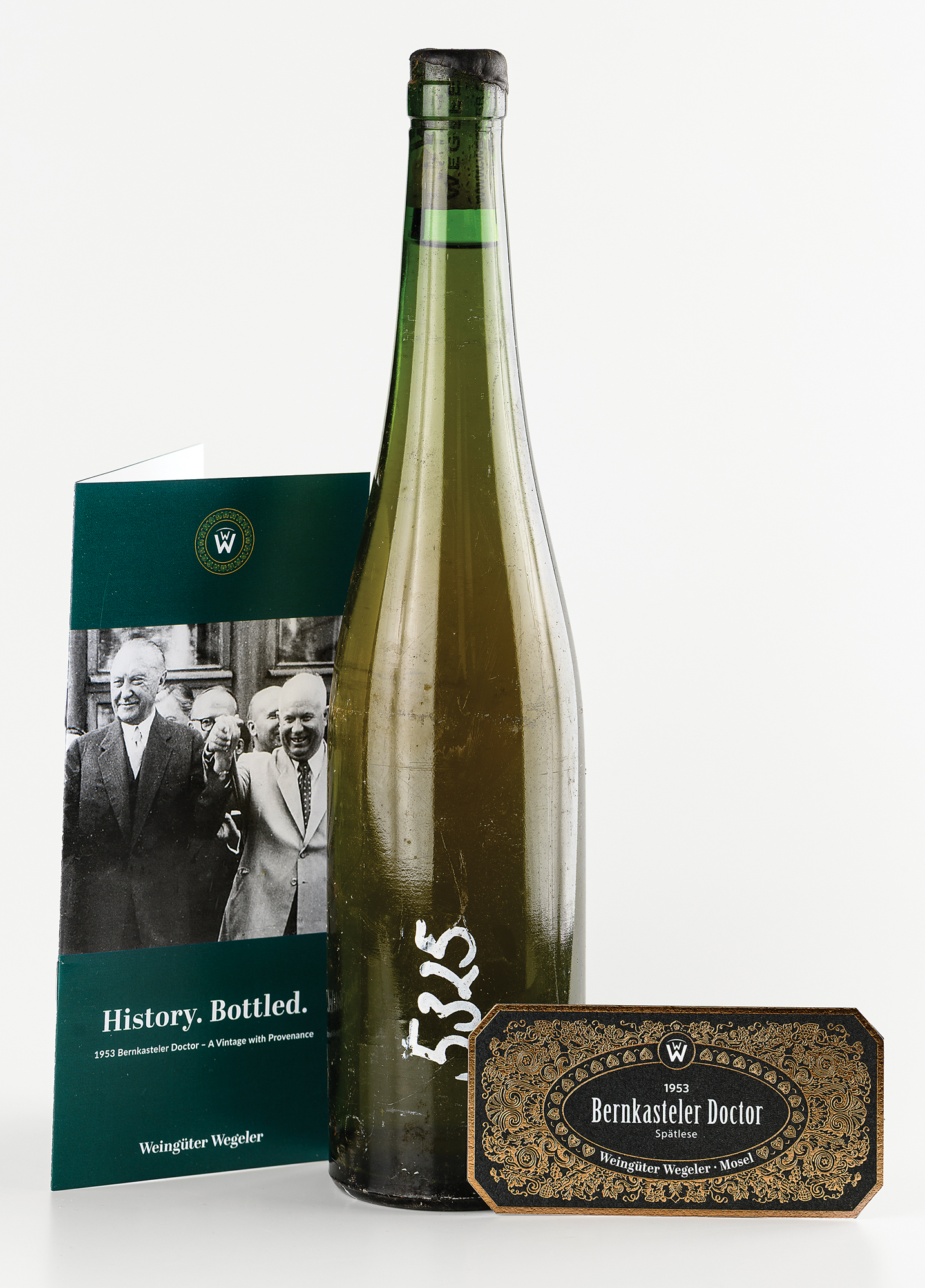 Exceptionally rare unopened bottle of 1953 Bernkasteler Doctor Riesling Spätiese from Weingüter Wegeler, representing the exact vintage served at one of the Cold War's most pivotal diplomatic events – Chancellor Konrad Adenauer's breakfast meeting with Soviet leaders Nikolai Bulganin, Nikita Khrushchev, and Vyacheslav Molotov on September 11, 1955, during the historic Moscow negotiations that secured the release of the last 10,000 German prisoners of war from Soviet camps.