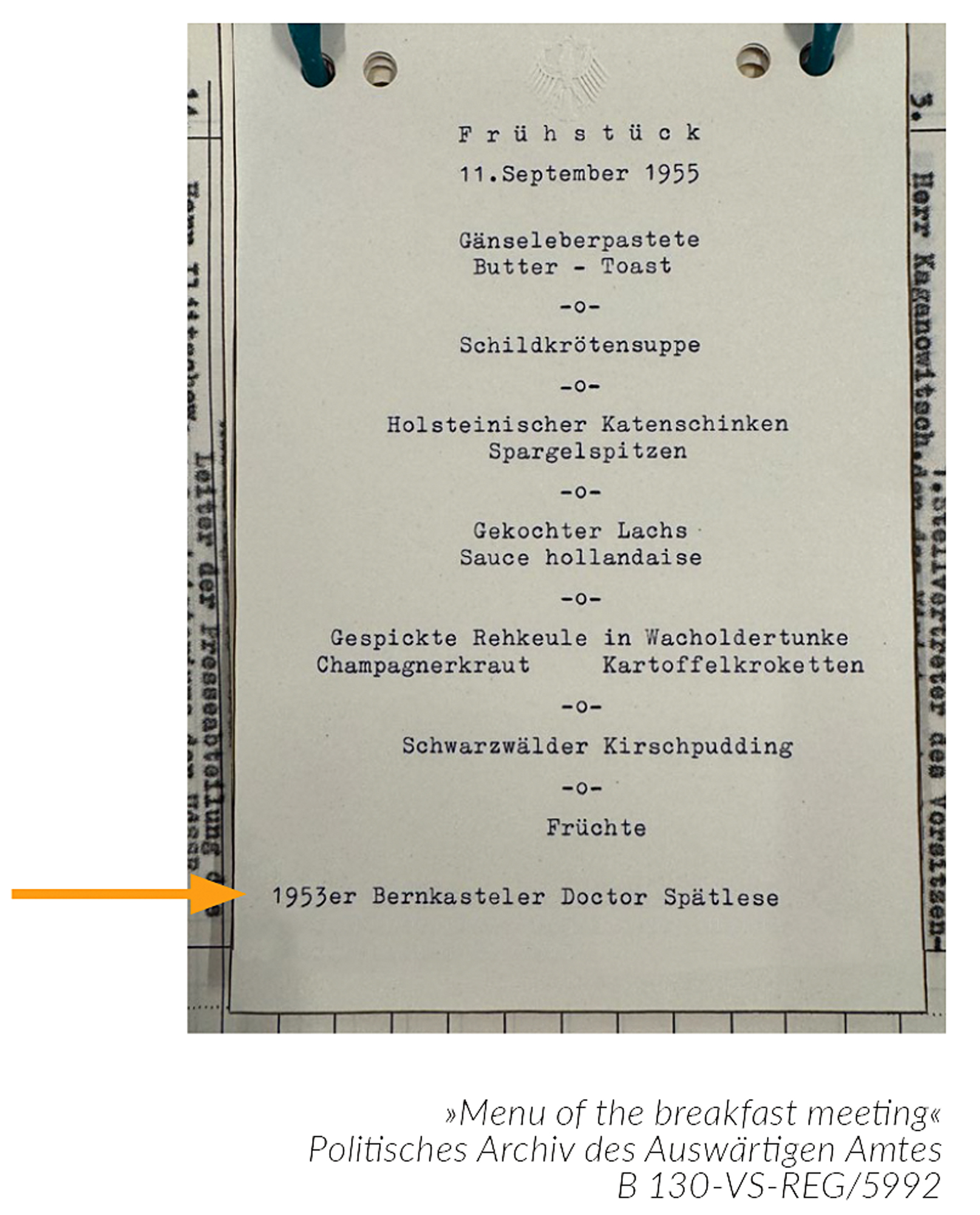 On September 11, 1955, at a high-stakes Kremlin breakfast with Bulganin, Khrushchev, and Molotov, wine became a union of olive branch and weaponry. Printed plainly on the official diplomatic menu was the 1953 Bernkasteler Doctor Riesling Spätlese. Its inclusion was no afterthought. Selected with intention and symbolism, this wine reflected the very image Adenauer wished to project: cultivated, resolute, and serious.