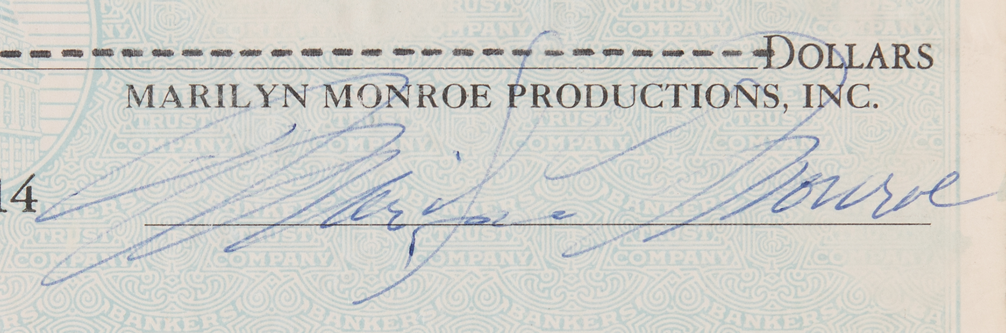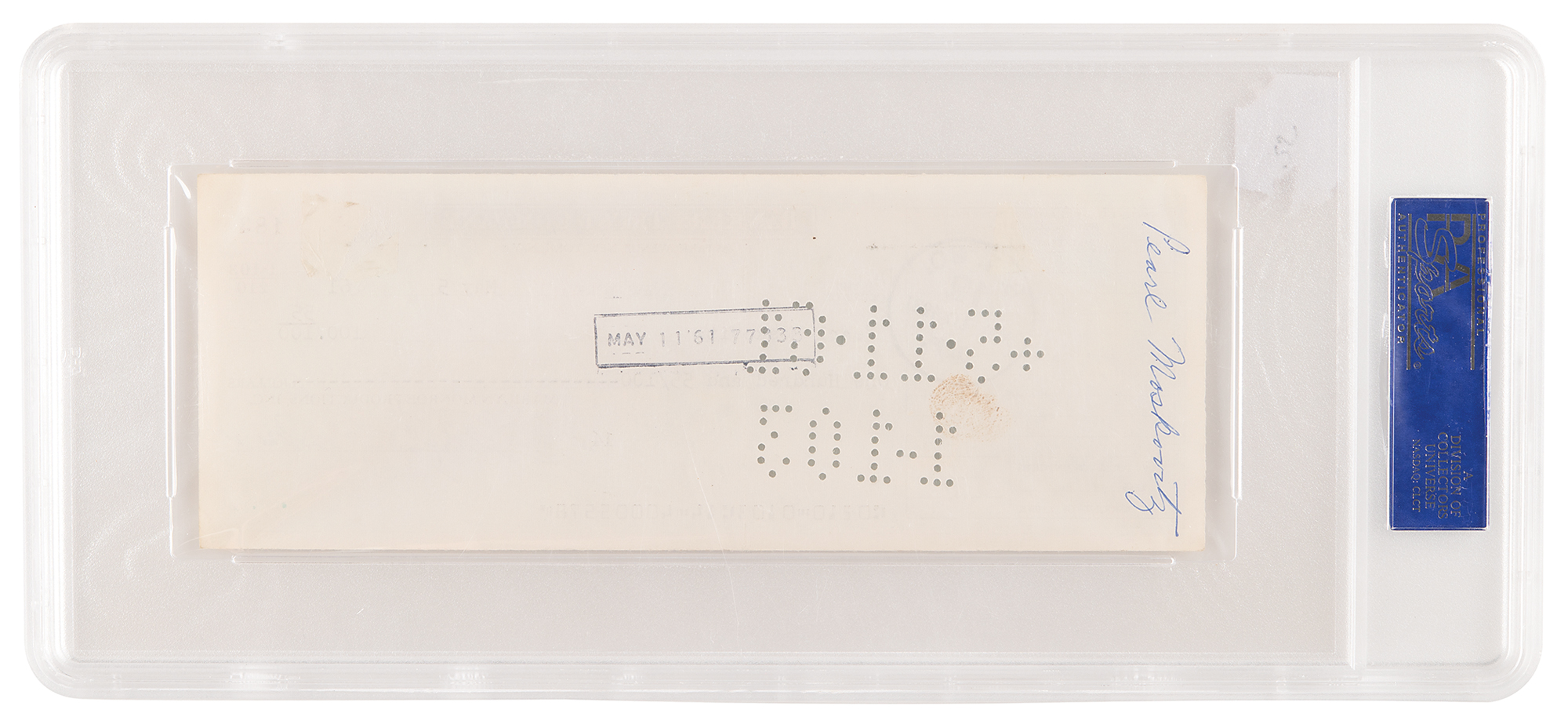 Marilyn Monroe Productions, Inc. business check (Bankers Trust Company of New York), 8.25 x 3, filled out in type and signed by Marilyn Monroe, payable to her secretary, Pearl Moskovitz, for $100.100, May 5, 1961. In fine condition. Encapsulated and graded by PSA/DNA as “MINT 9.”