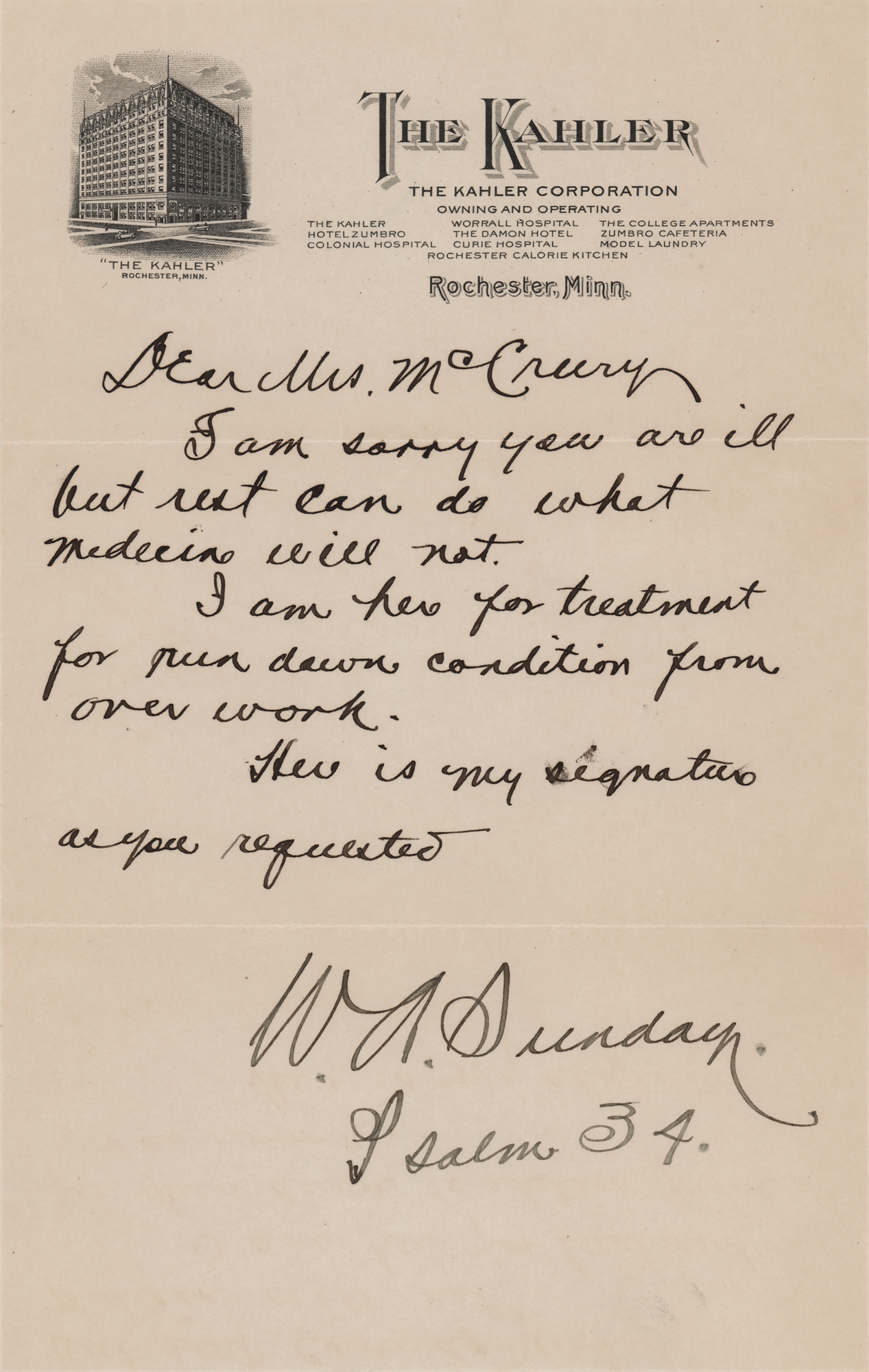 Evangelist (1862-1935) and former baseball player who preached a fundamentalist theology in a highly flamboyant style. Scarce ALS signed "W. A. Sunday, Psalm 34," one page, 6 x 9.5, The Kahler letterhead, postmarked September 15, 1932. Handwritten letter to Mrs. J. G. McCrury, in full: "I am sorry you are ill but rest can do what medecine [sic] will not. I am here for treatment for run down condition from over work. Here is my signature as you requested." In fine condition. Accompanied by the original mailing envelope addressed in Sunday's hand.